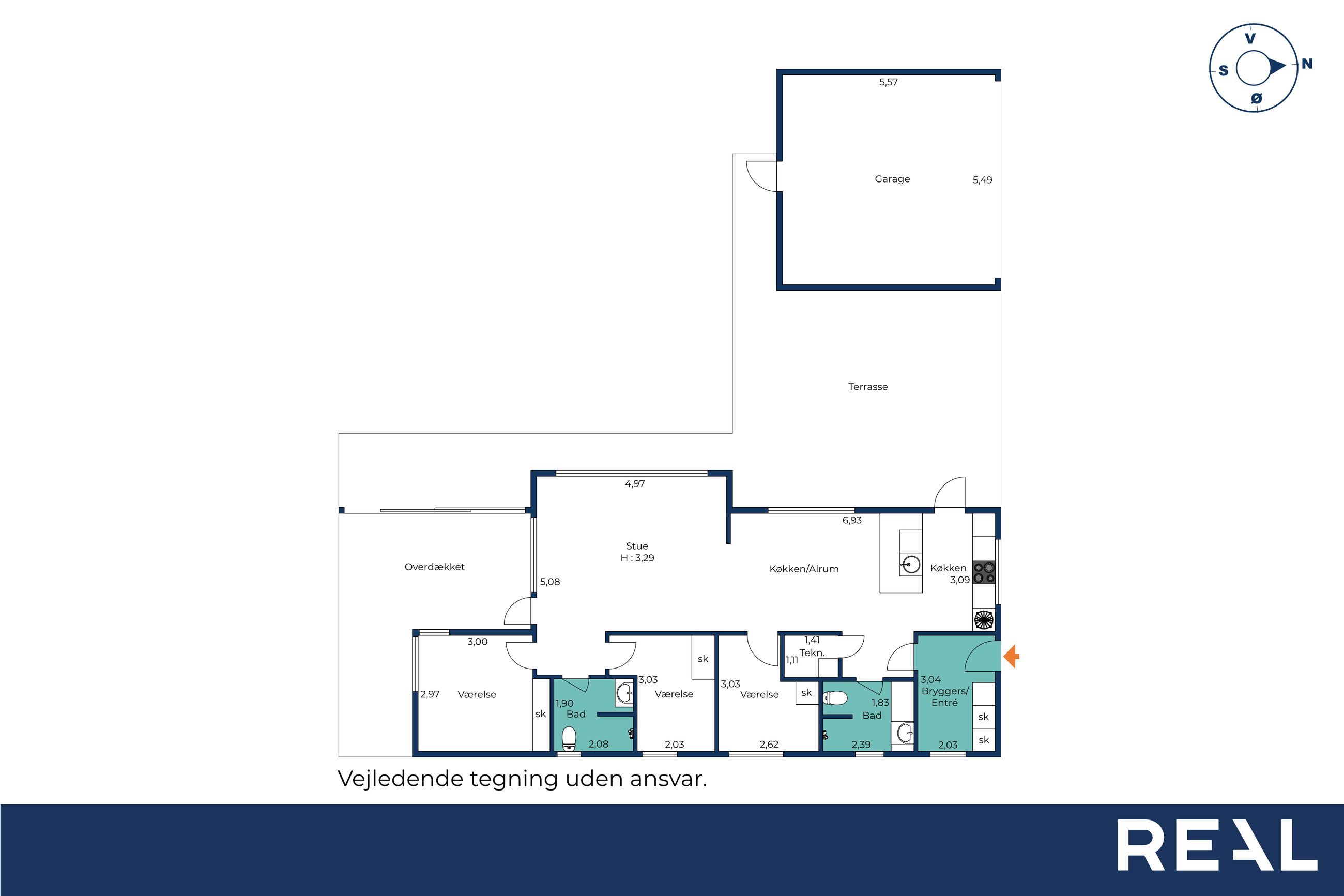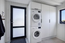 Man bydes velkommen i en indbydende entré med vaskesøjle og god plads til sko og overtøj – praktisk og velgennemtænkt. Hjertet i huset er det store og lyse køkken-alrum, hvor stemningen straks føles hjemlig og varm. Her er plads til både hverdagsliv og gæster – og fra alrummet er der direkte udgang til flere fantastiske terrassemiljøer.