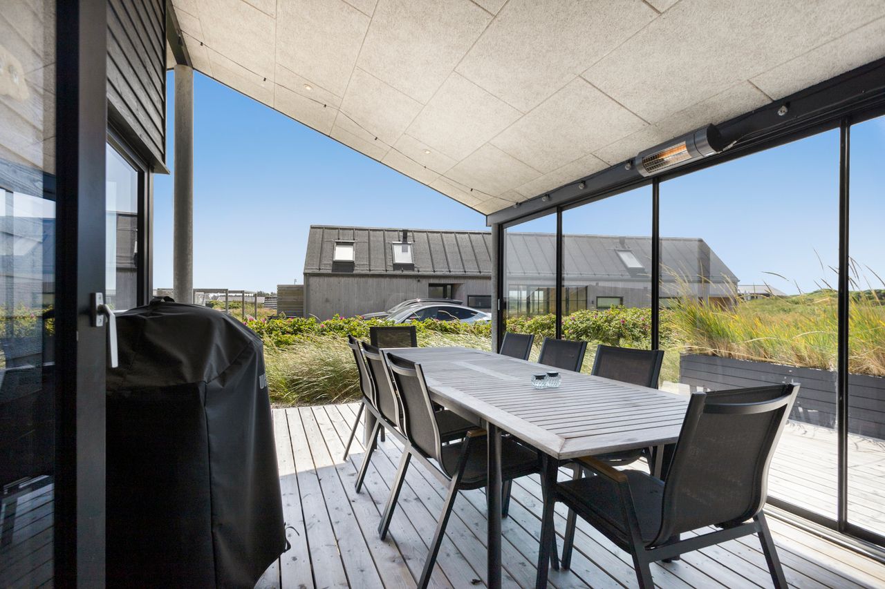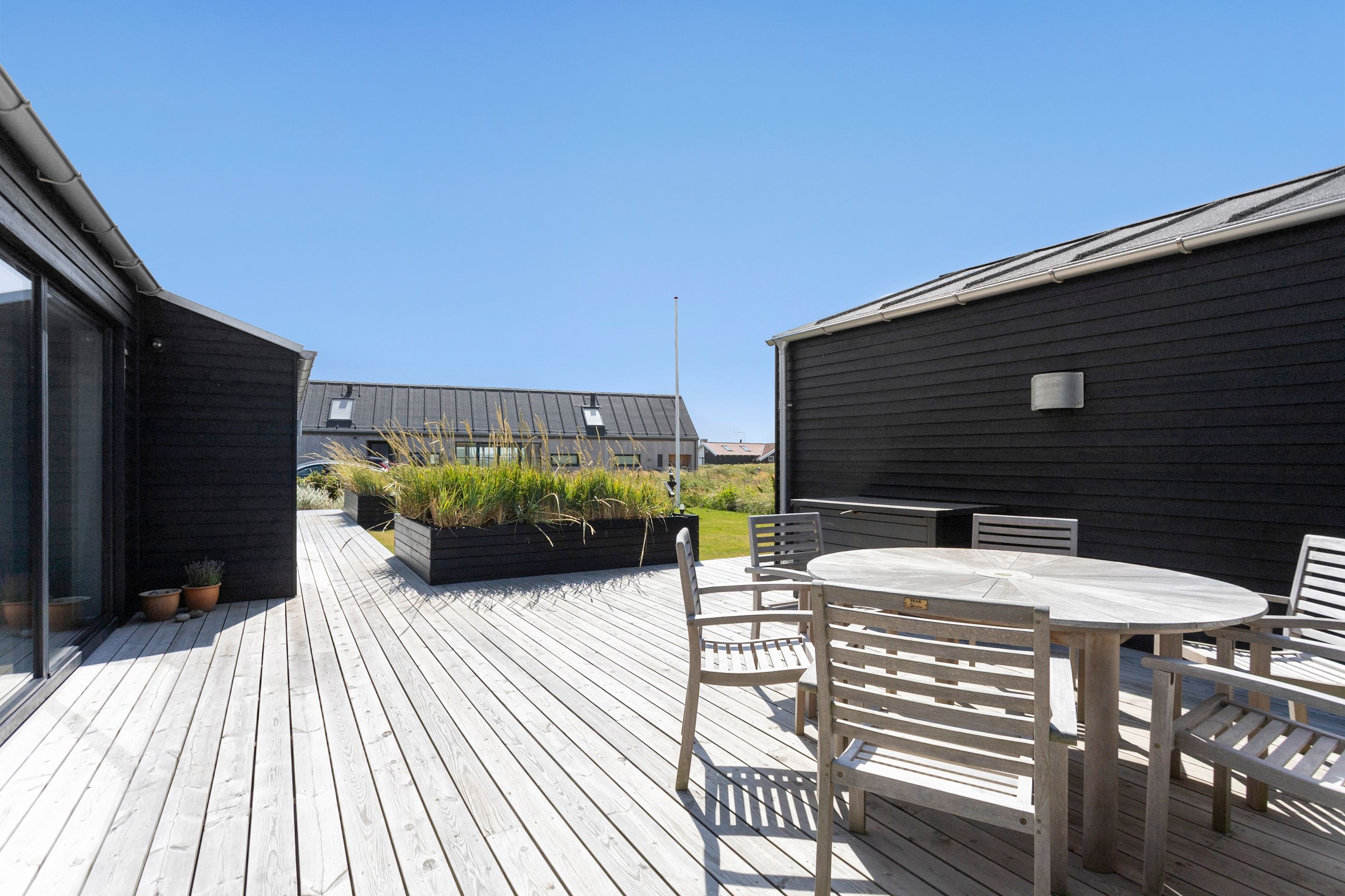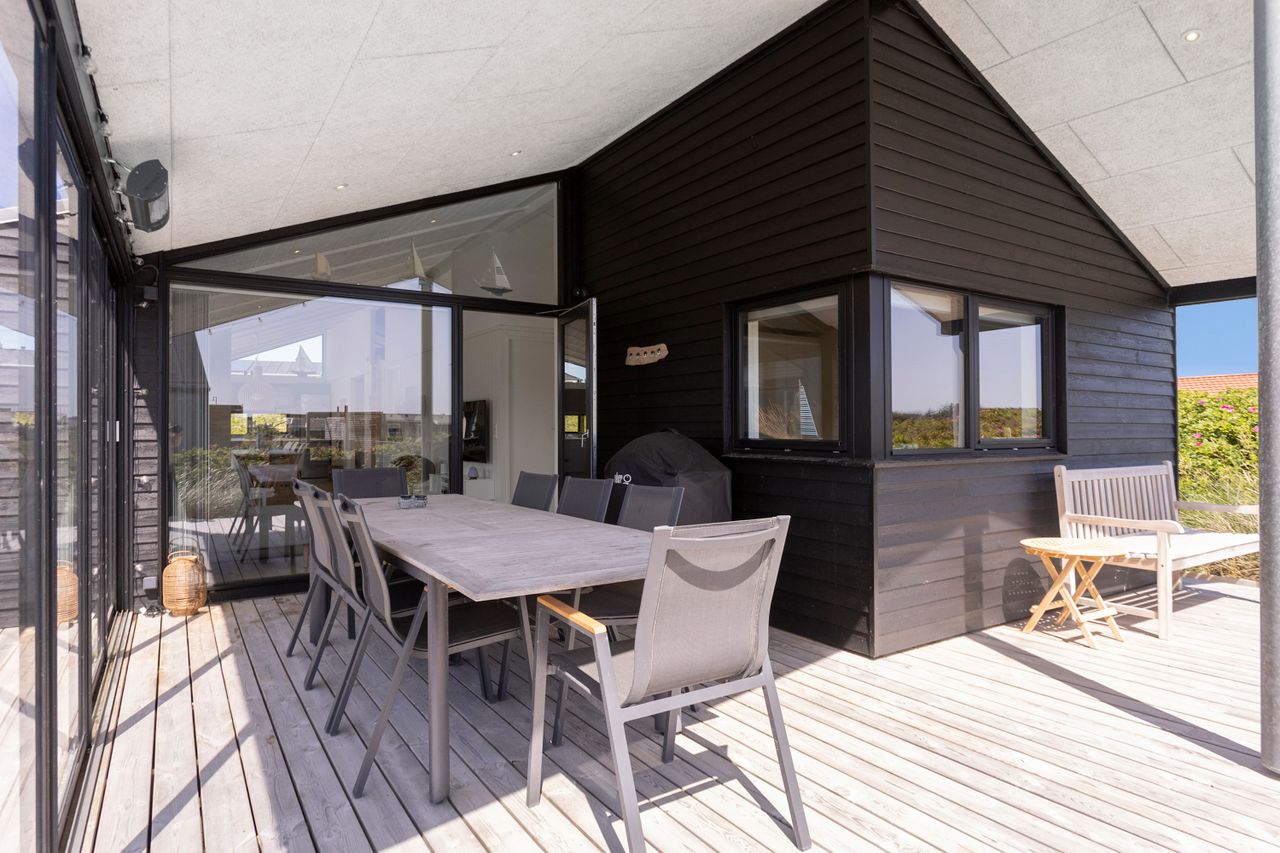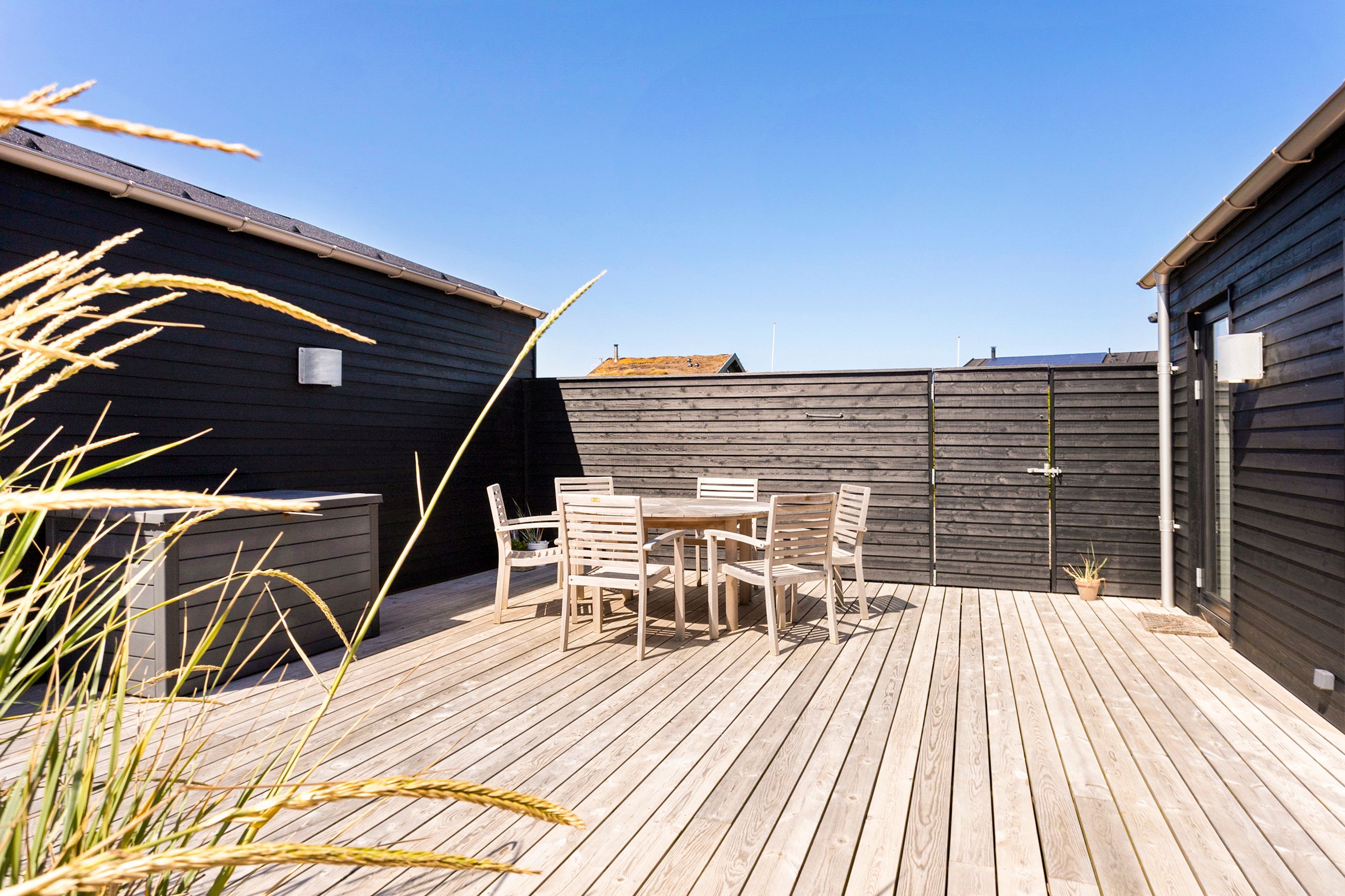 Mod vest ligger en skøn, lille gårdhave, hvor stilheden hersker – det perfekte sted til morgenkaffen eller en god bog. Mod syd finder man en overdækket terrasse med glaspartier, der kan skydes til siden – her får man følelsen af at sidde ude, selv når vejret viser tænder.