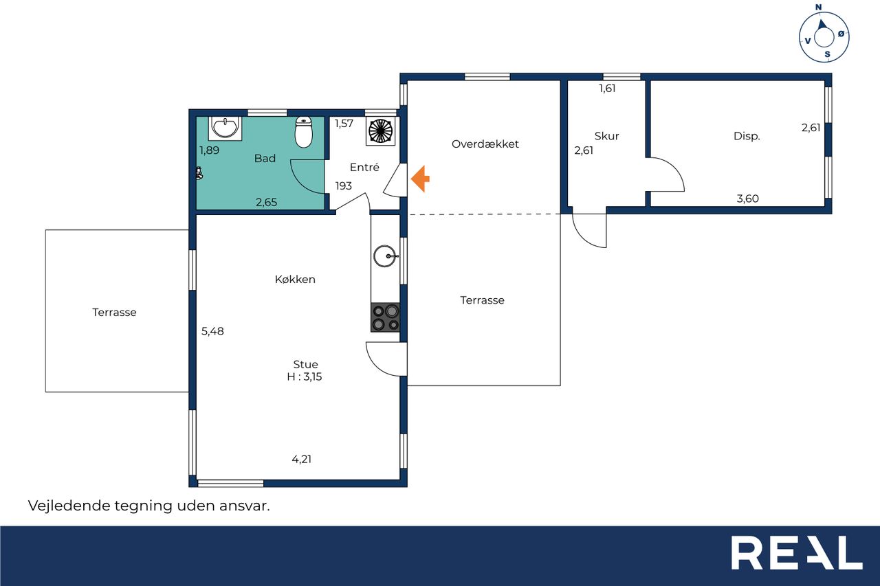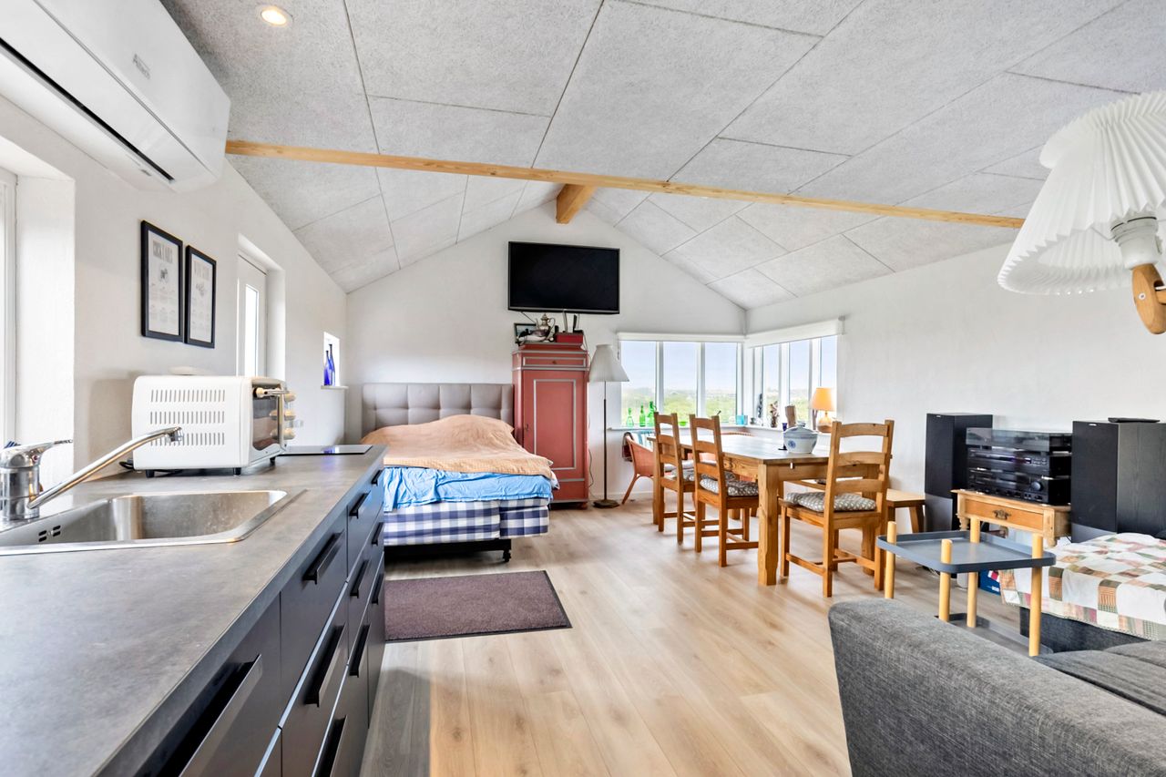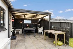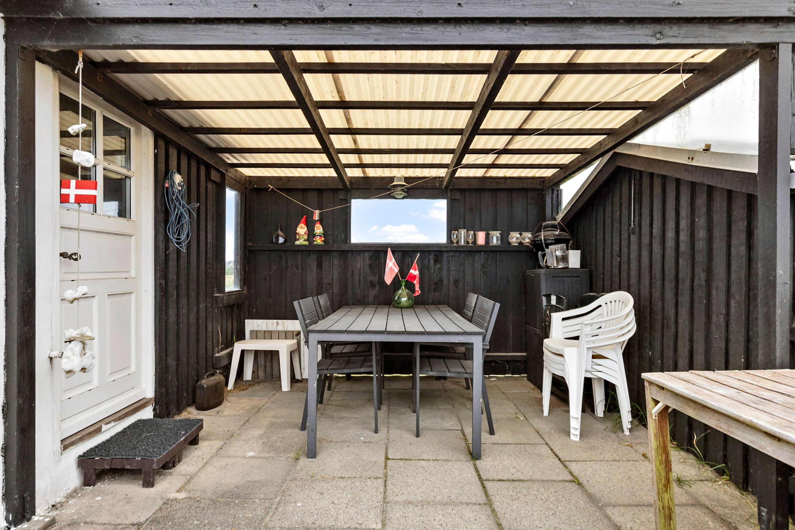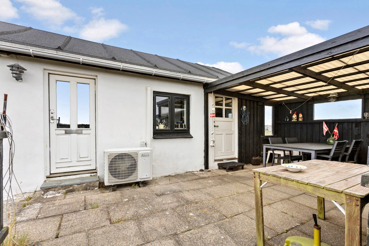 Huset byder på et lyst og indbydende køkken-alrum, som fungerer som hjemmets naturlige samlingspunkt. Herfra er der direkte udgang til en overdækket terrasse – perfekt til sommeraftener og udeliv i al slags vejr.