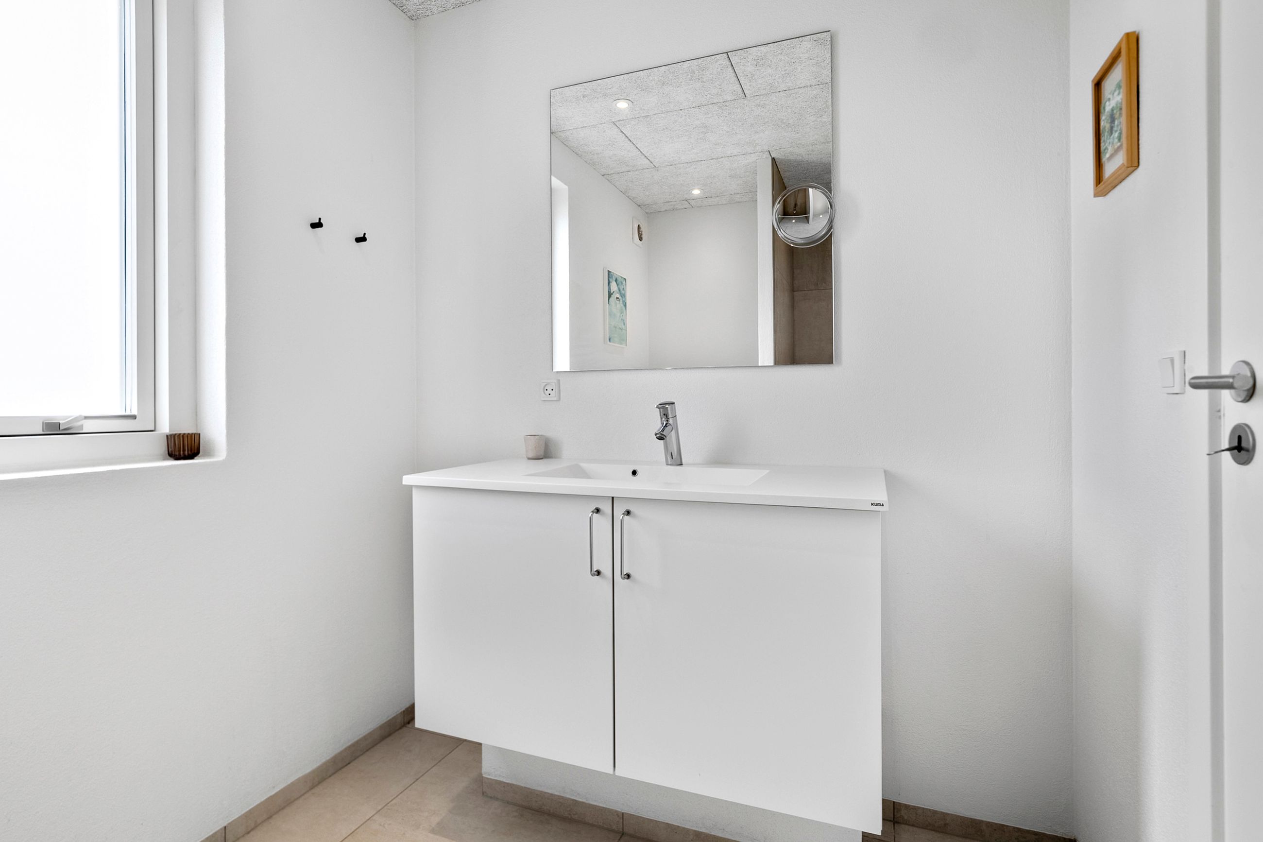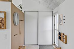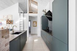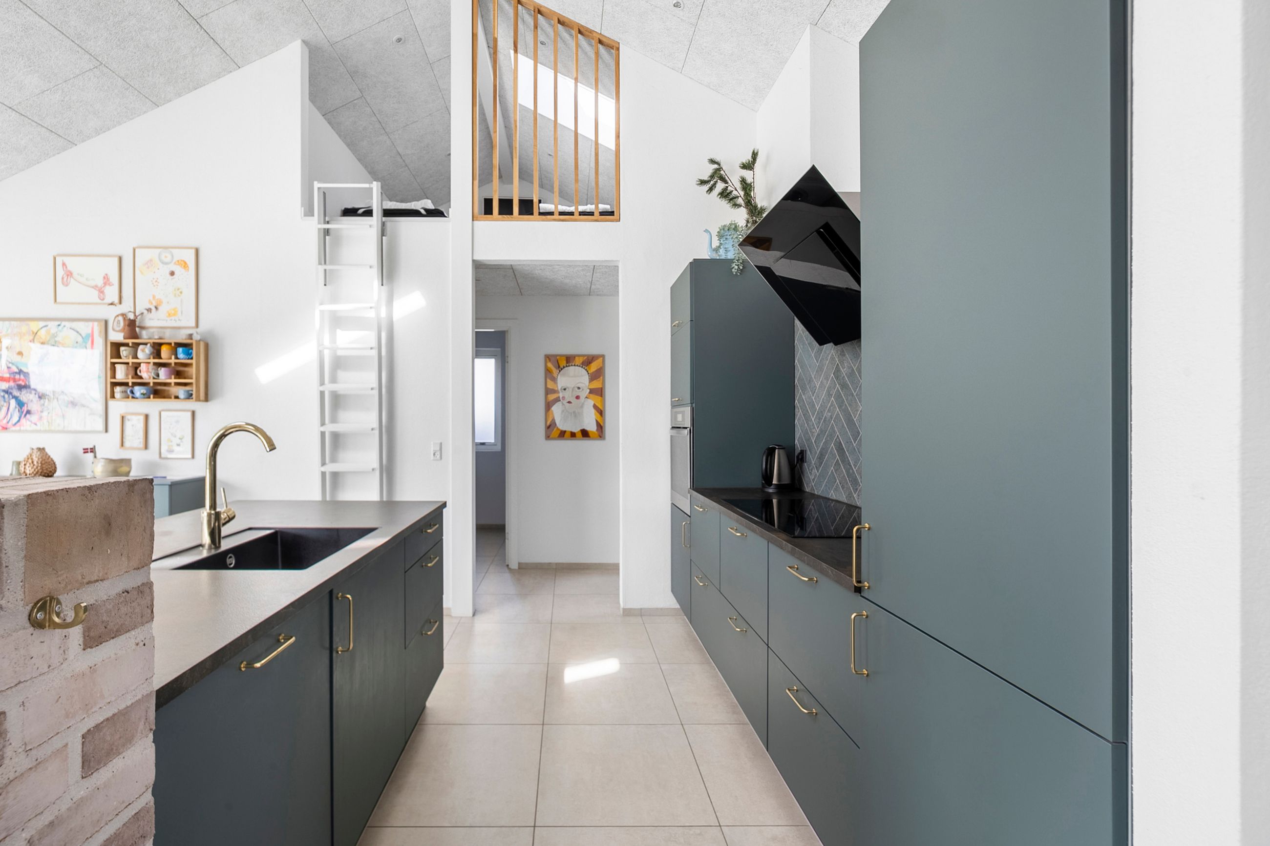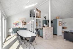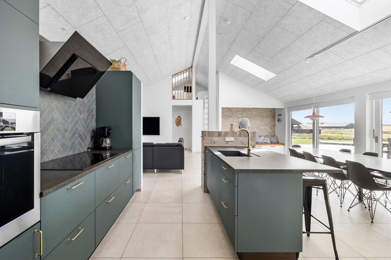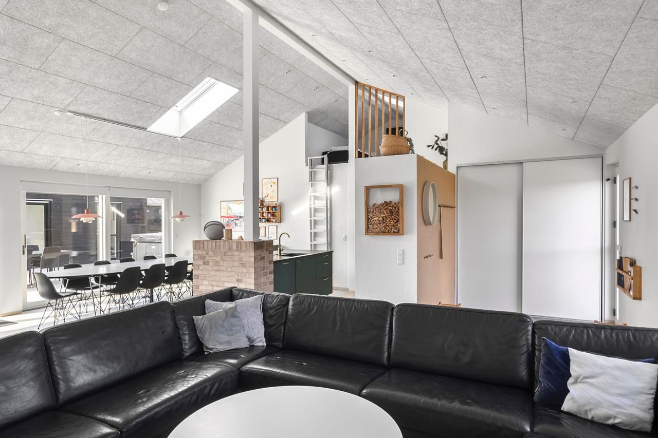 Boligens hjerte er det imponerende opholdsrum, hvor køkken, spiseafdeling og stue smelter sammen i en stilfuld helhed. De store vinduespartier og ovenlysvinduer sikrer et fantastisk lysindfald, som forstærker den luftige atmosfære, og på sommerdage kan terrassedørene åbnes, så ude- og indeliv flyder elegant sammen.