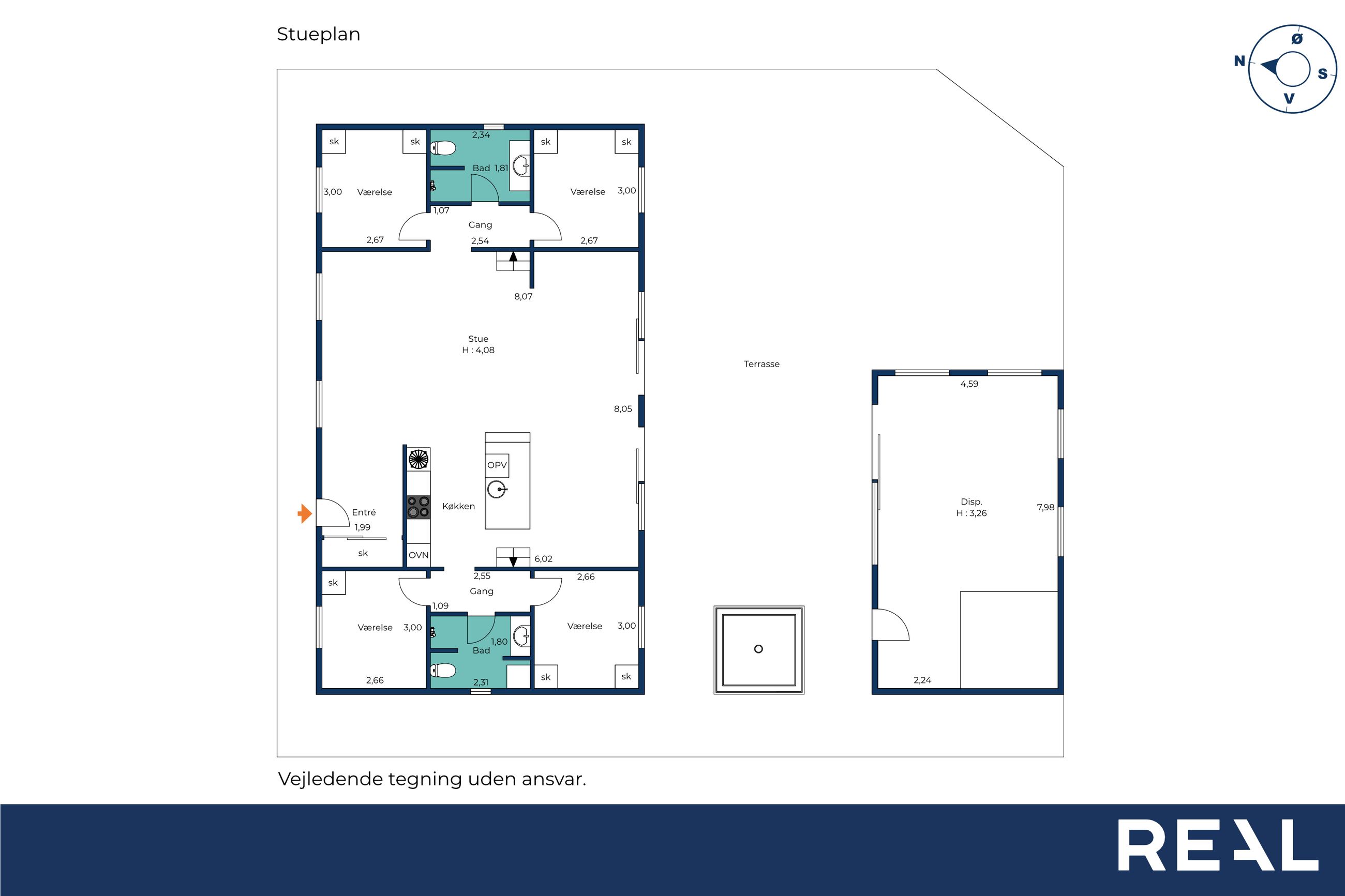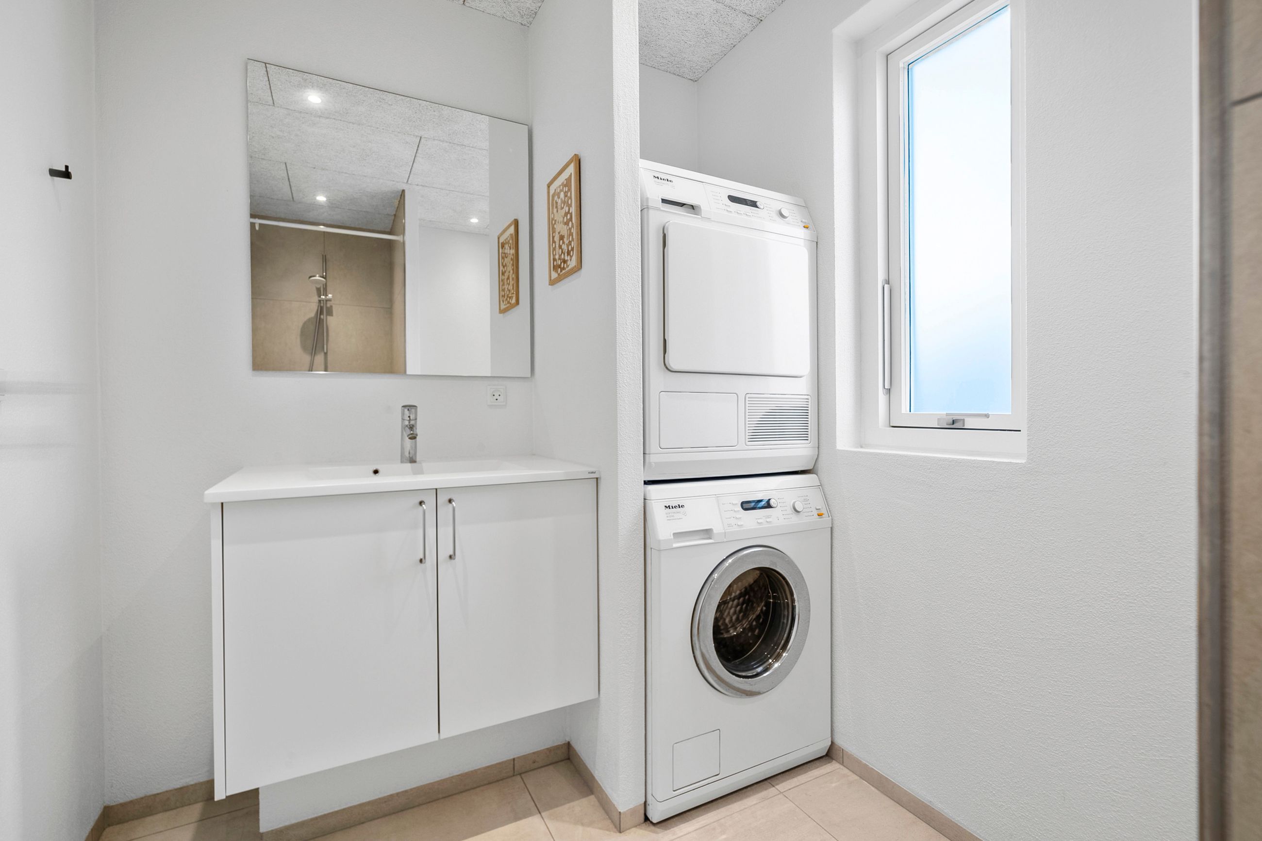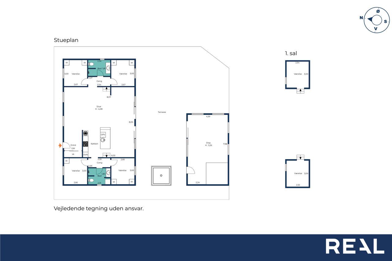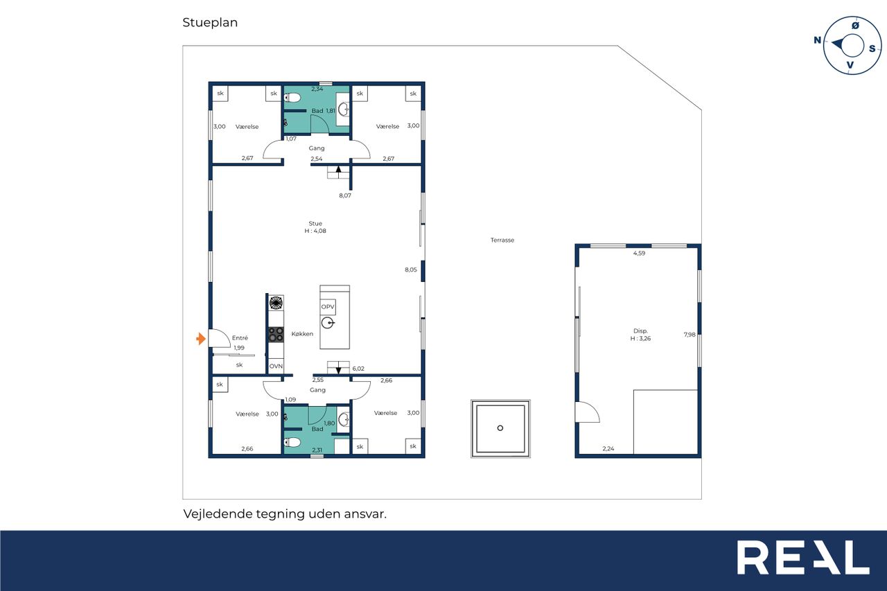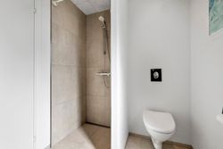 Boligens hjerte er det imponerende opholdsrum, hvor køkken, spiseafdeling og stue smelter sammen i en stilfuld helhed. De store vinduespartier og ovenlysvinduer sikrer et fantastisk lysindfald, som forstærker den luftige atmosfære, og på sommerdage kan terrassedørene åbnes, så ude- og indeliv flyder elegant sammen.