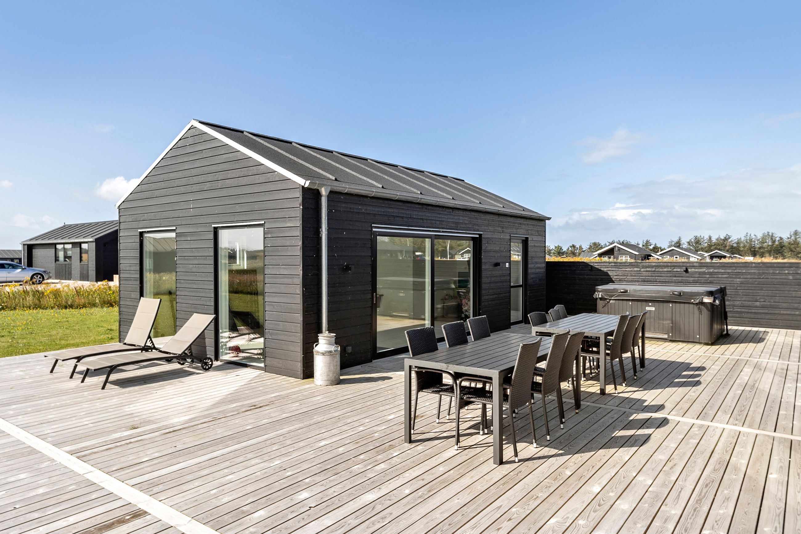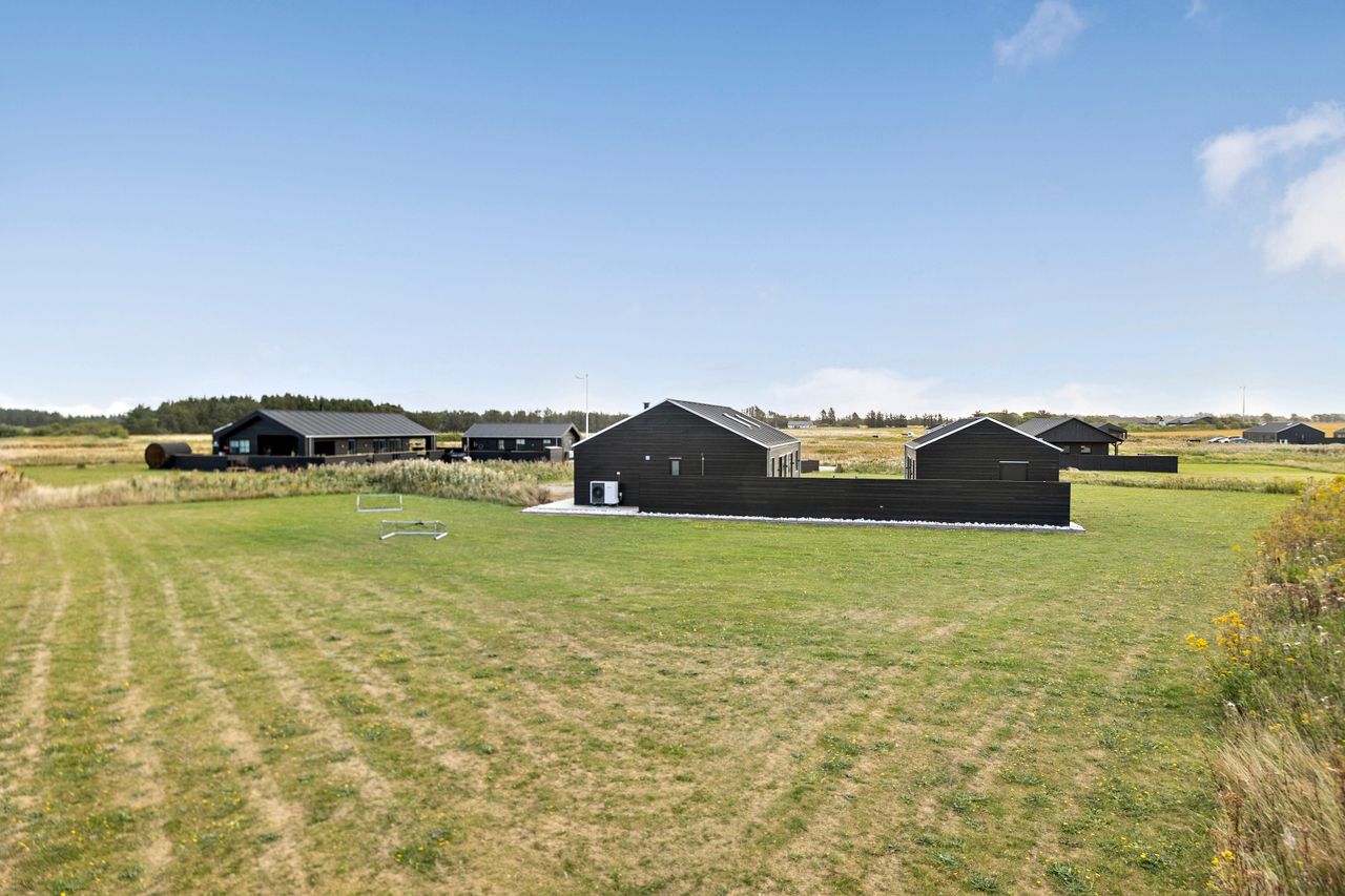Udelivet kulminerer på den store træterrasse, som indbyder til solrige eftermiddage og hyggelige sommeraftener. Her finder I både udendørs bruser og spabad under åben himmel – en eksklusiv detalje, der løfter feriestemningen til et nyt niveau. Den store grund giver desuden privatliv og en rolig atmosfære, hvor man kan trække sig tilbage og nyde den nordjyske natur.