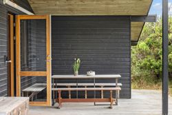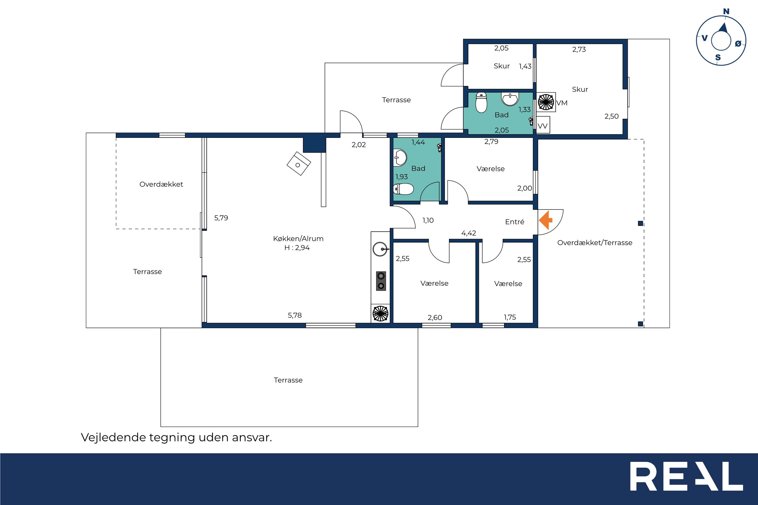Indretningen er funktionel og charmerende med afskærmet entré, lækkert køkken, skøn opholdsstue med læsekrog og indbygget slagbænk, tre gode værelser samt badeværelse. Udendørs finder du endnu et badeværelse med adgang fra terrassen – ideelt efter en dag på stranden – samt et hyggeligt udekøkken.