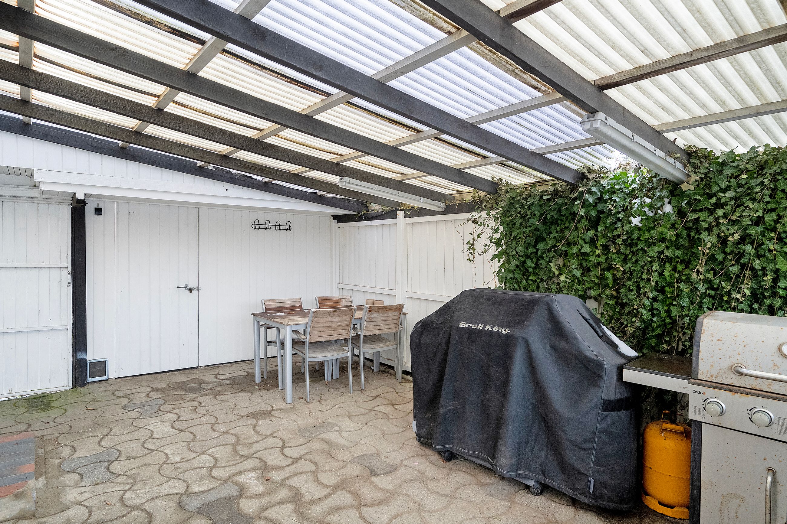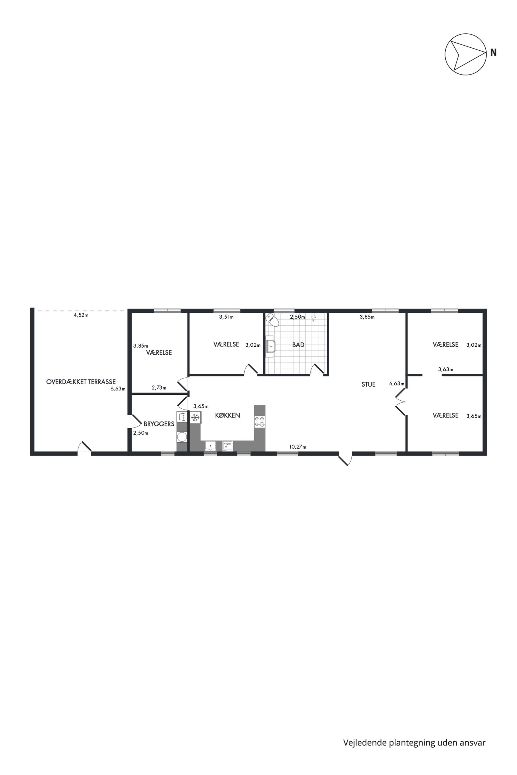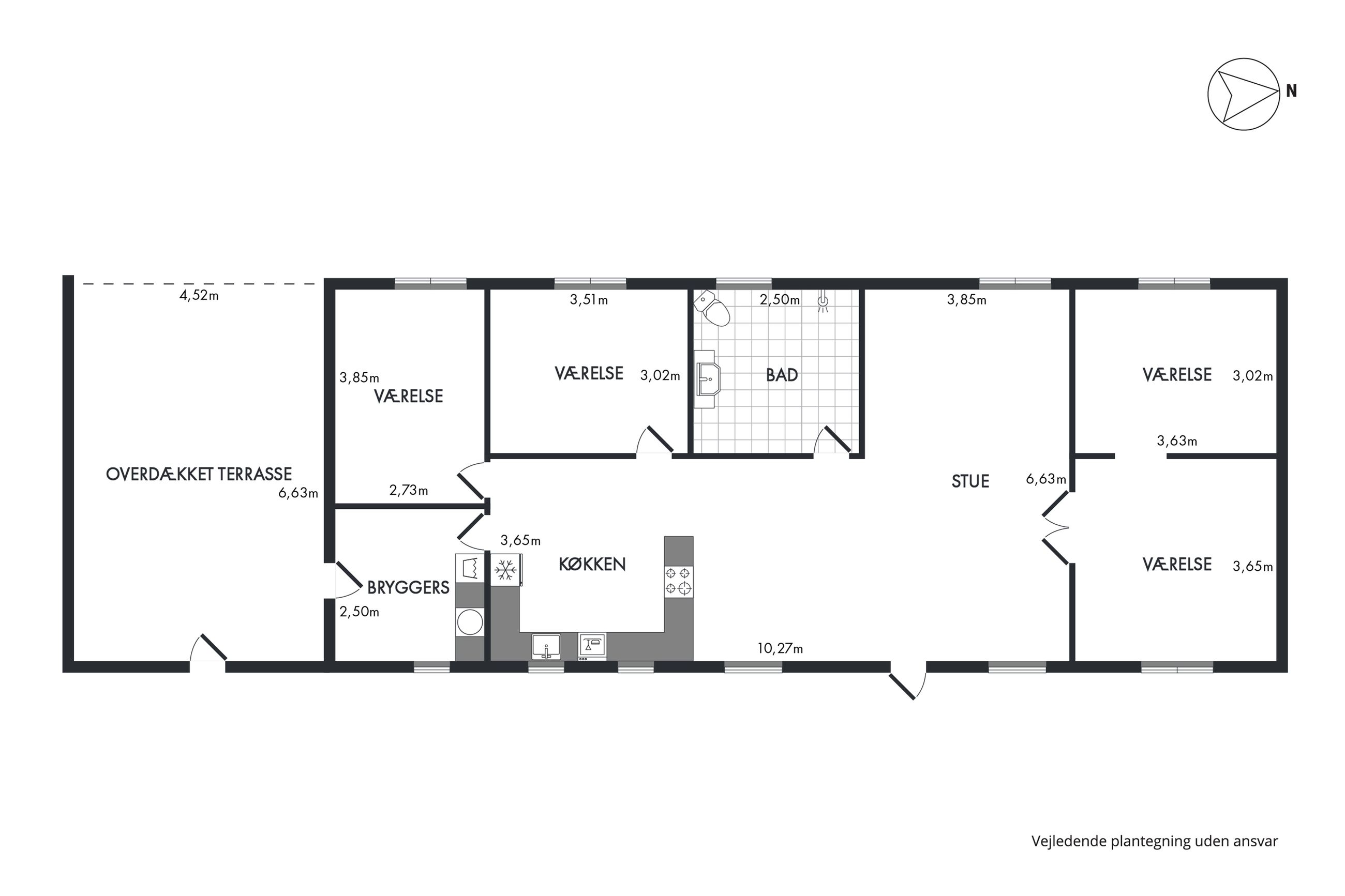 Udendørs får du en stor grund på 1.142 kvm, samt et overdækket terrasseområde med integreret udhus.