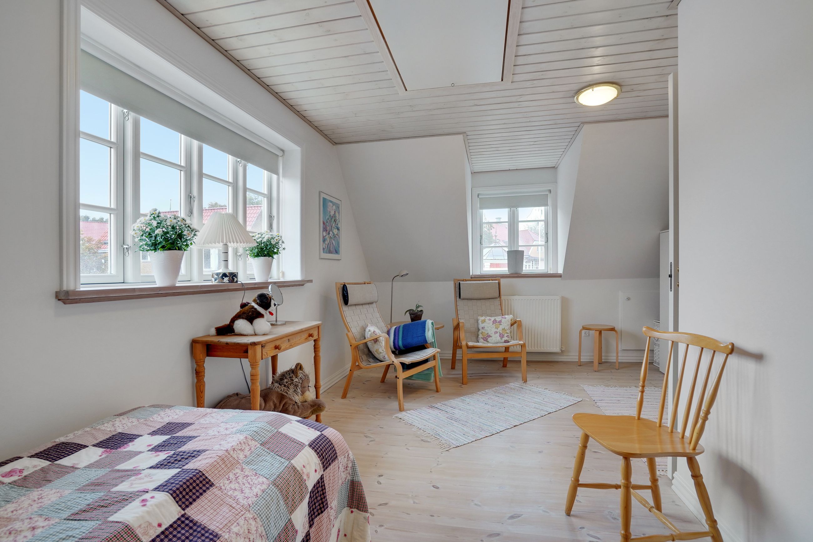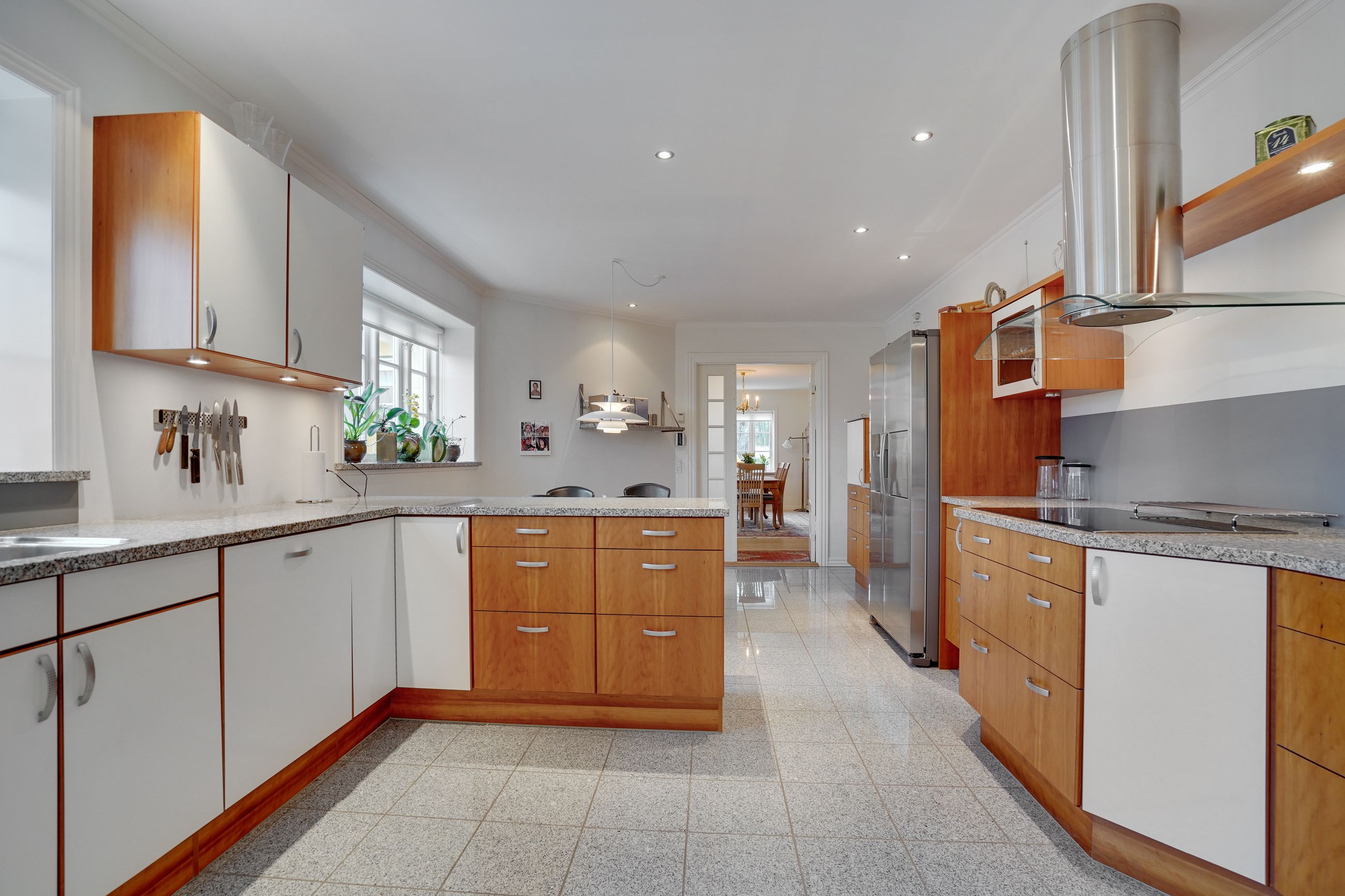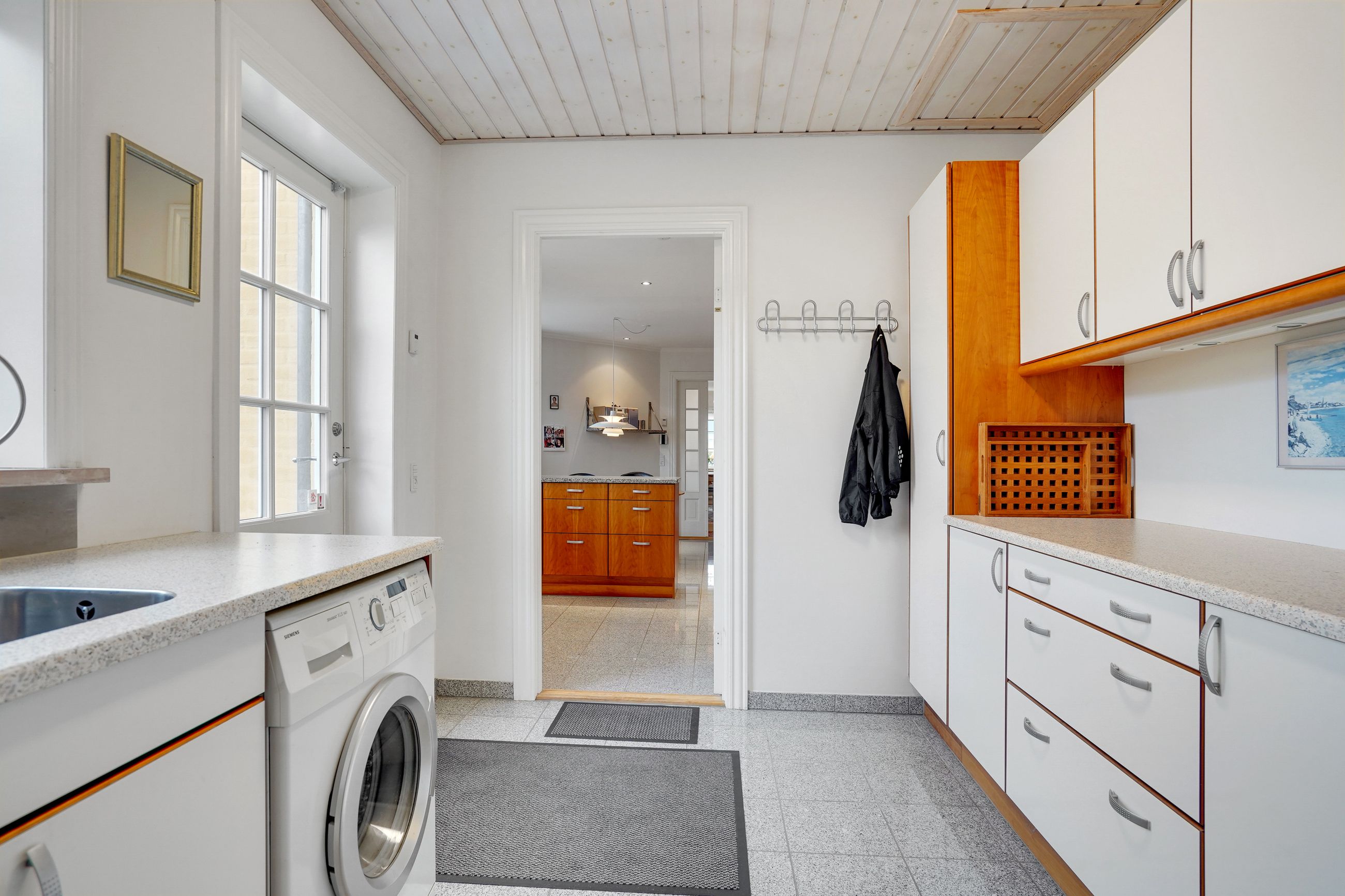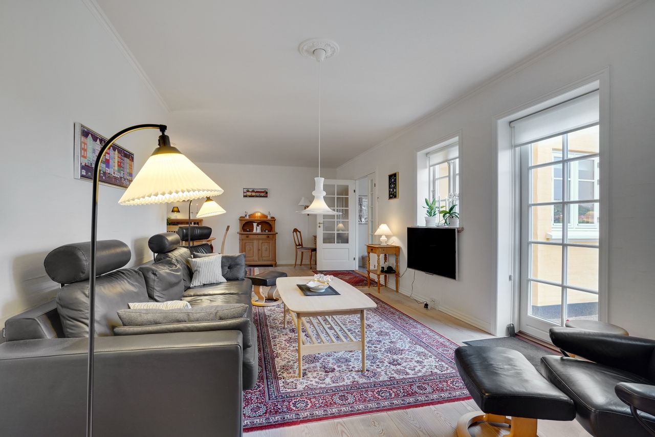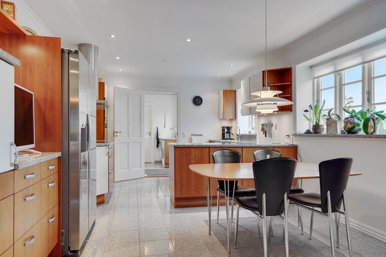 Planløsningen giver dig i stueplan en stor vinkelstue, som via en fransk dør er forbundet med spisekøkkenet i baghuslængen. I forlængelse af køkkenet ligger et bryggers og et spisekammer, og i husets modsatte ende får du et soveværelse og et badeværelse. På første sal er der endnu et badeværelse, to værelser med indbyggede skabe samt et kammer.