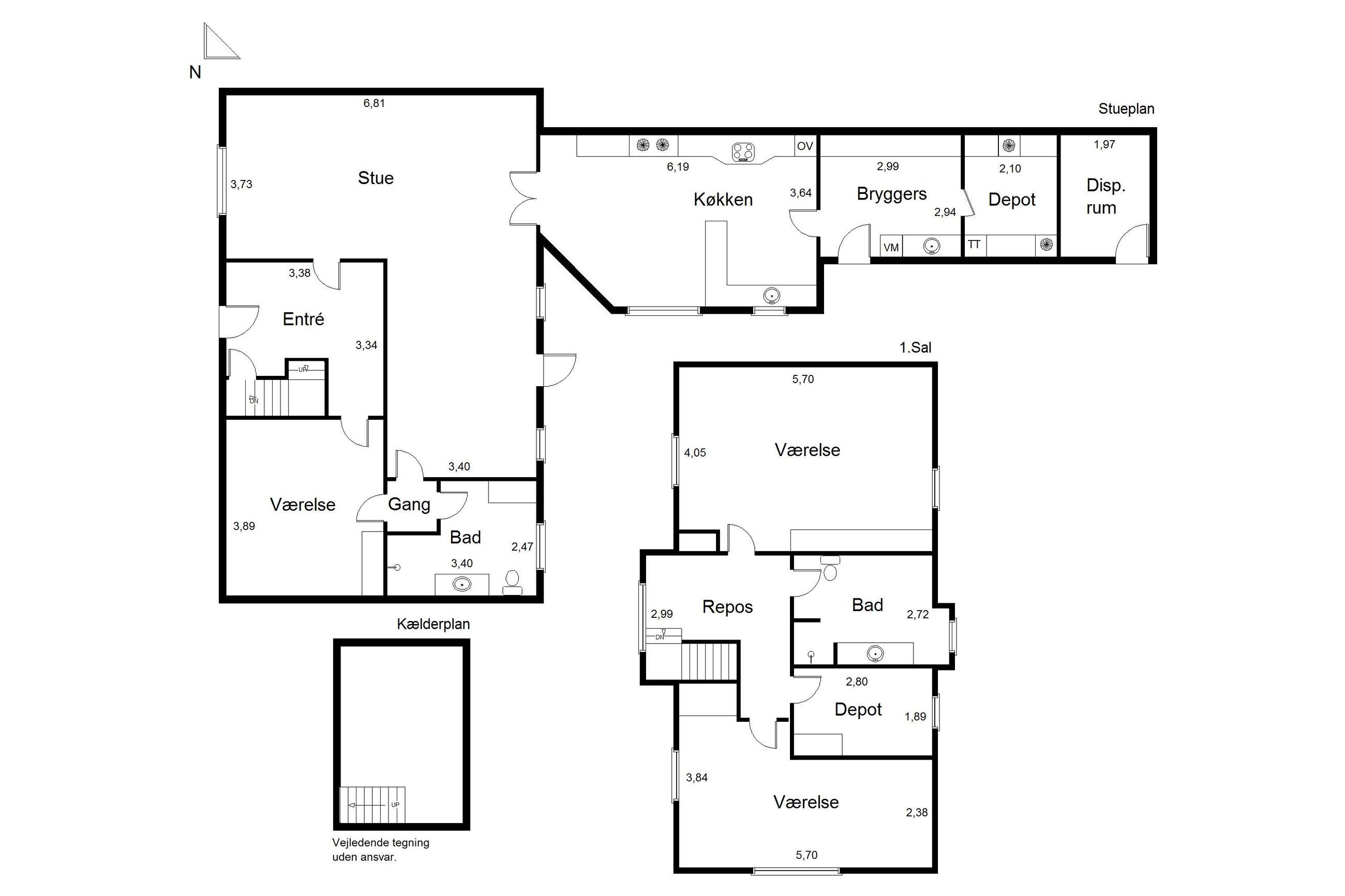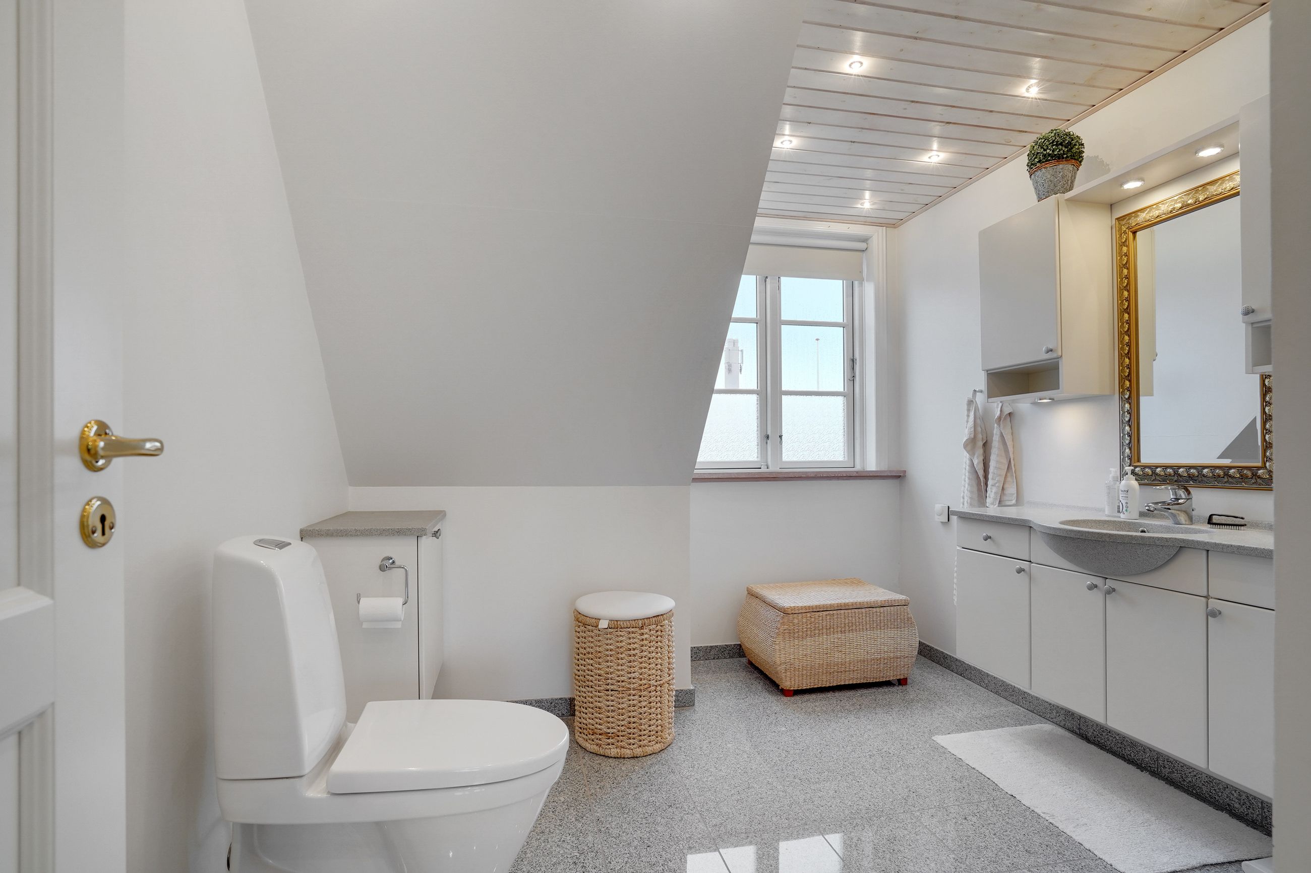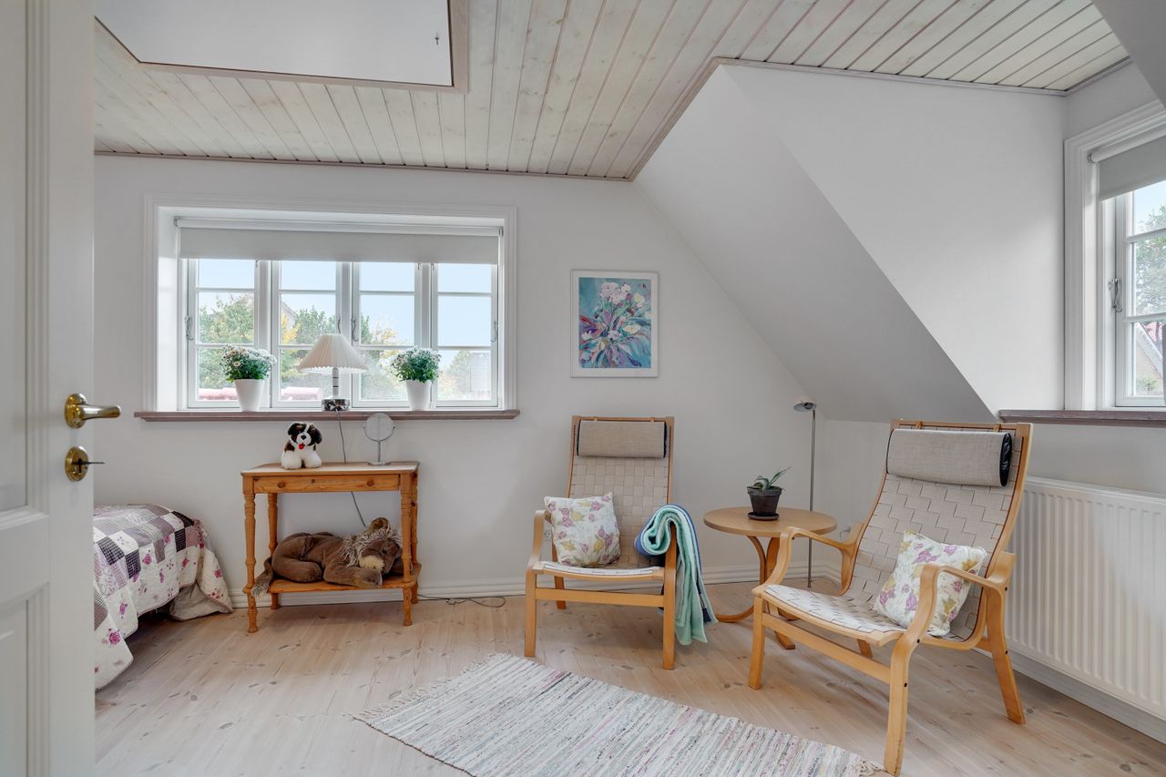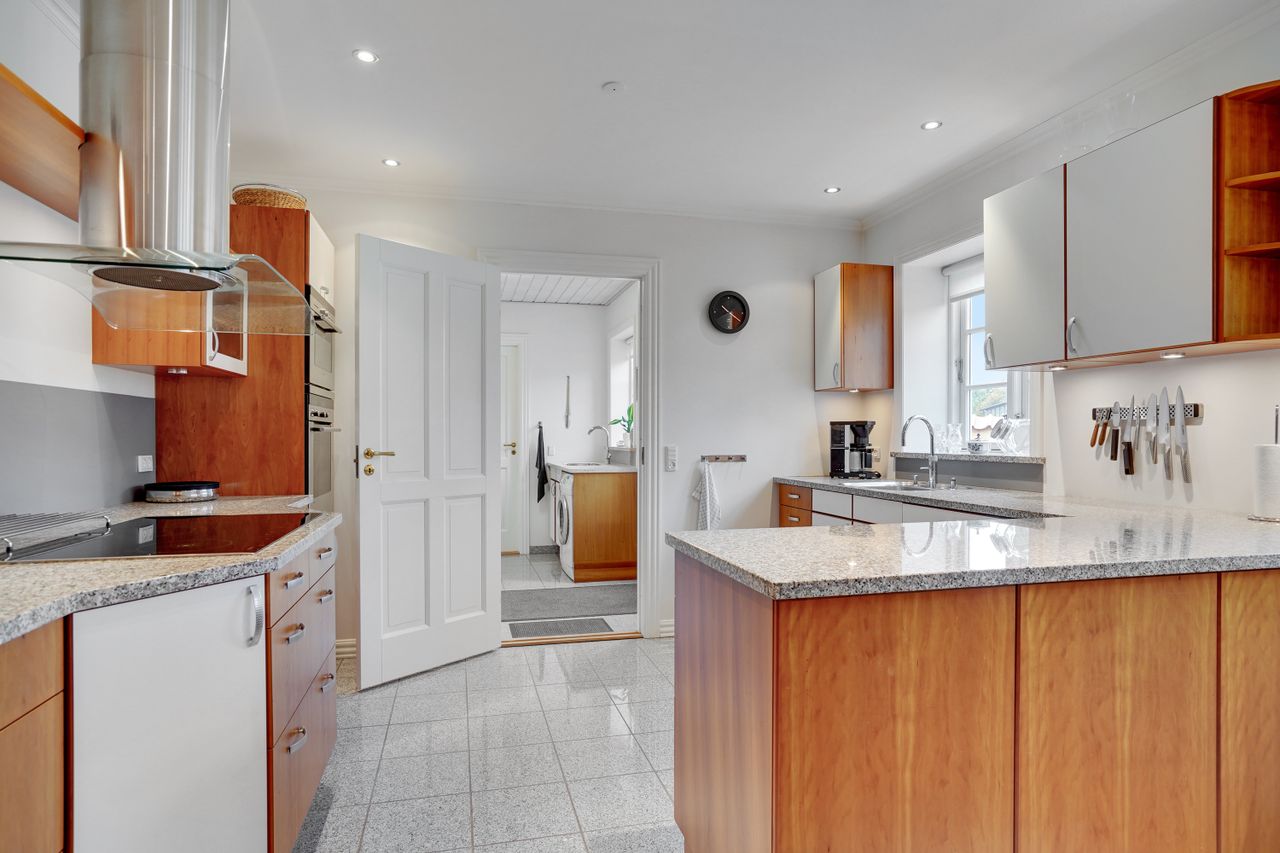 Planløsningen giver dig i stueplan en stor vinkelstue, som via en fransk dør er forbundet med spisekøkkenet i baghuslængen. I forlængelse af køkkenet ligger et bryggers og et spisekammer, og i husets modsatte ende får du et soveværelse og et badeværelse. På første sal er der endnu et badeværelse, to værelser med indbyggede skabe samt et kammer.