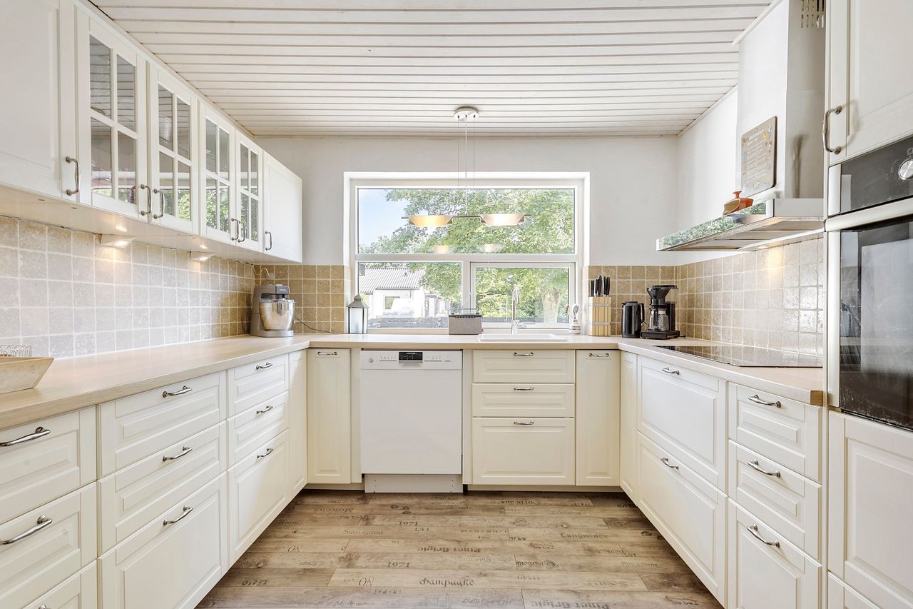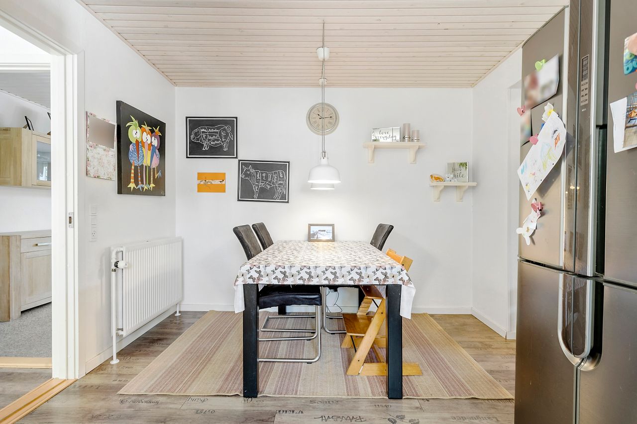 den lyse entre, kan man gå til højre og ind til husets funktionelle køkken med en hyggelig spiseplads. Fra