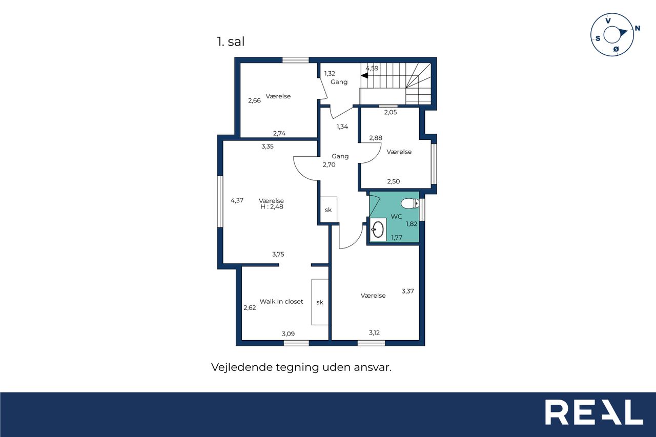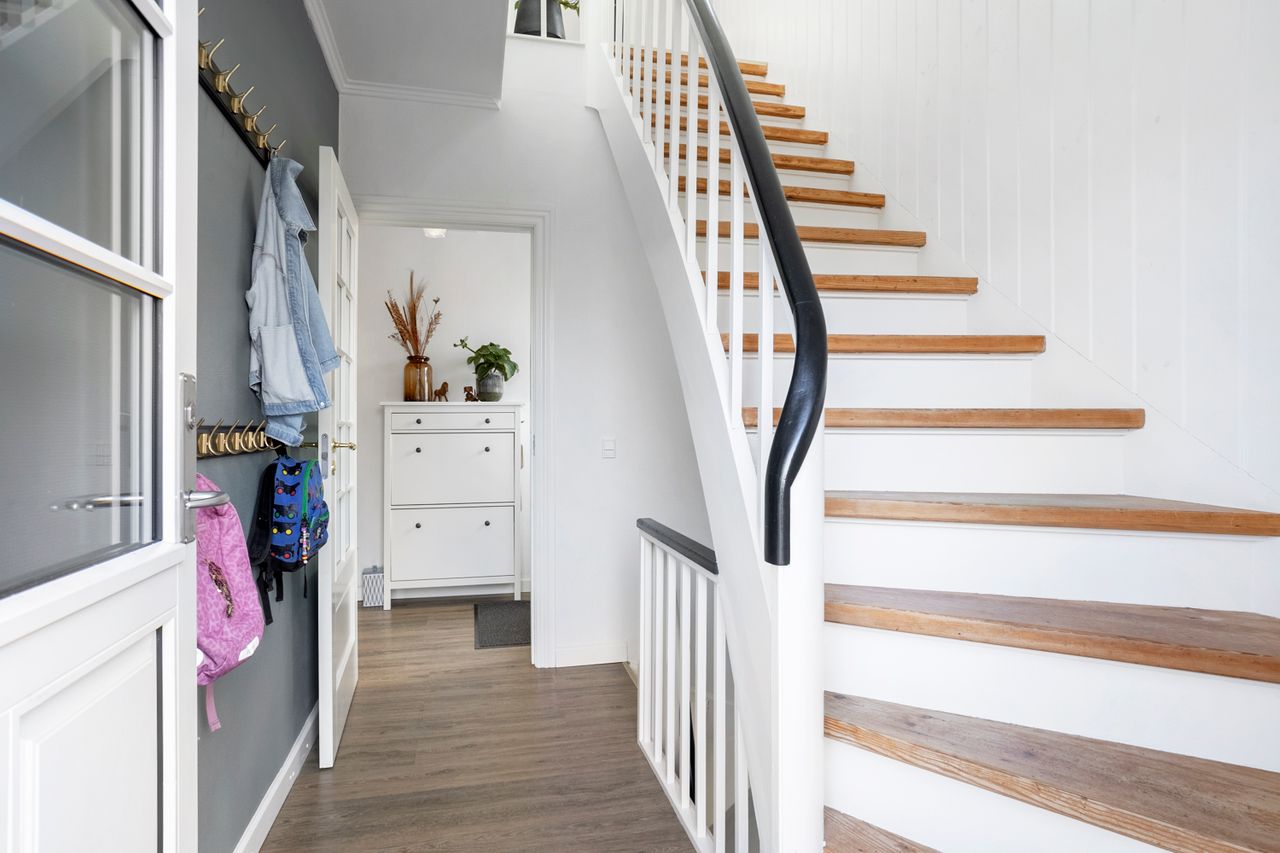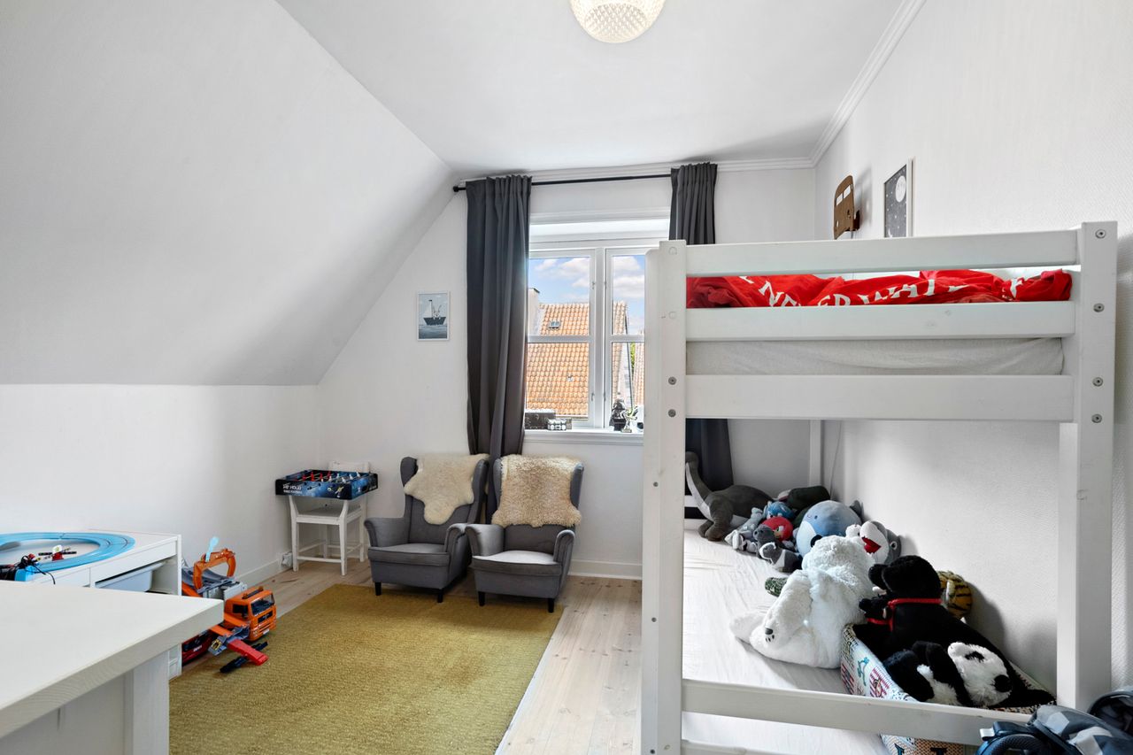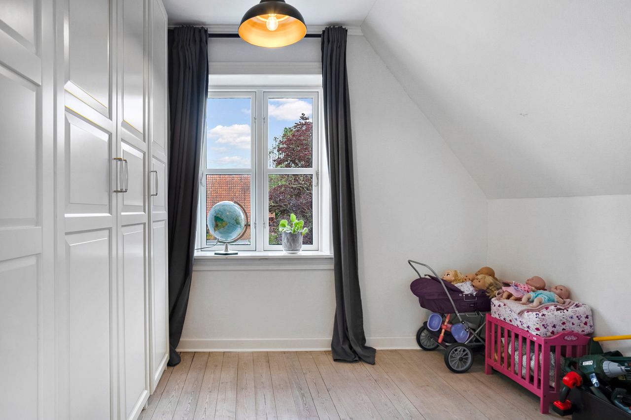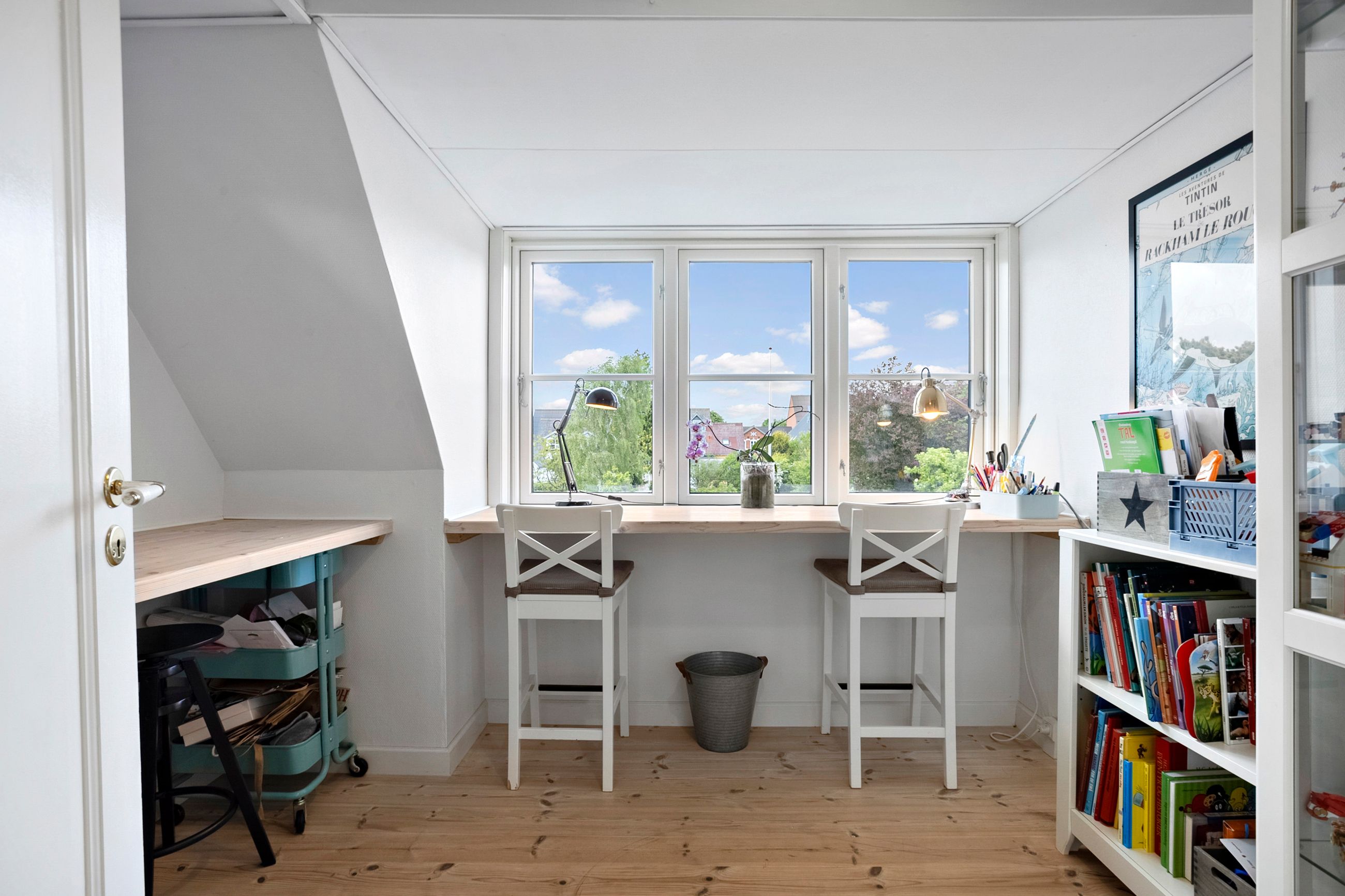På førstesalen finder du et repos, et stort soveværelse med mulighed for at etablere walk-in-closet, to gode værelser, et kontor samt et toilet. Hjemmets indretning gør det ideelt for familien, der ønsker plads og funktionalitet kombineret med hyggelige og lyse opholdsrum.