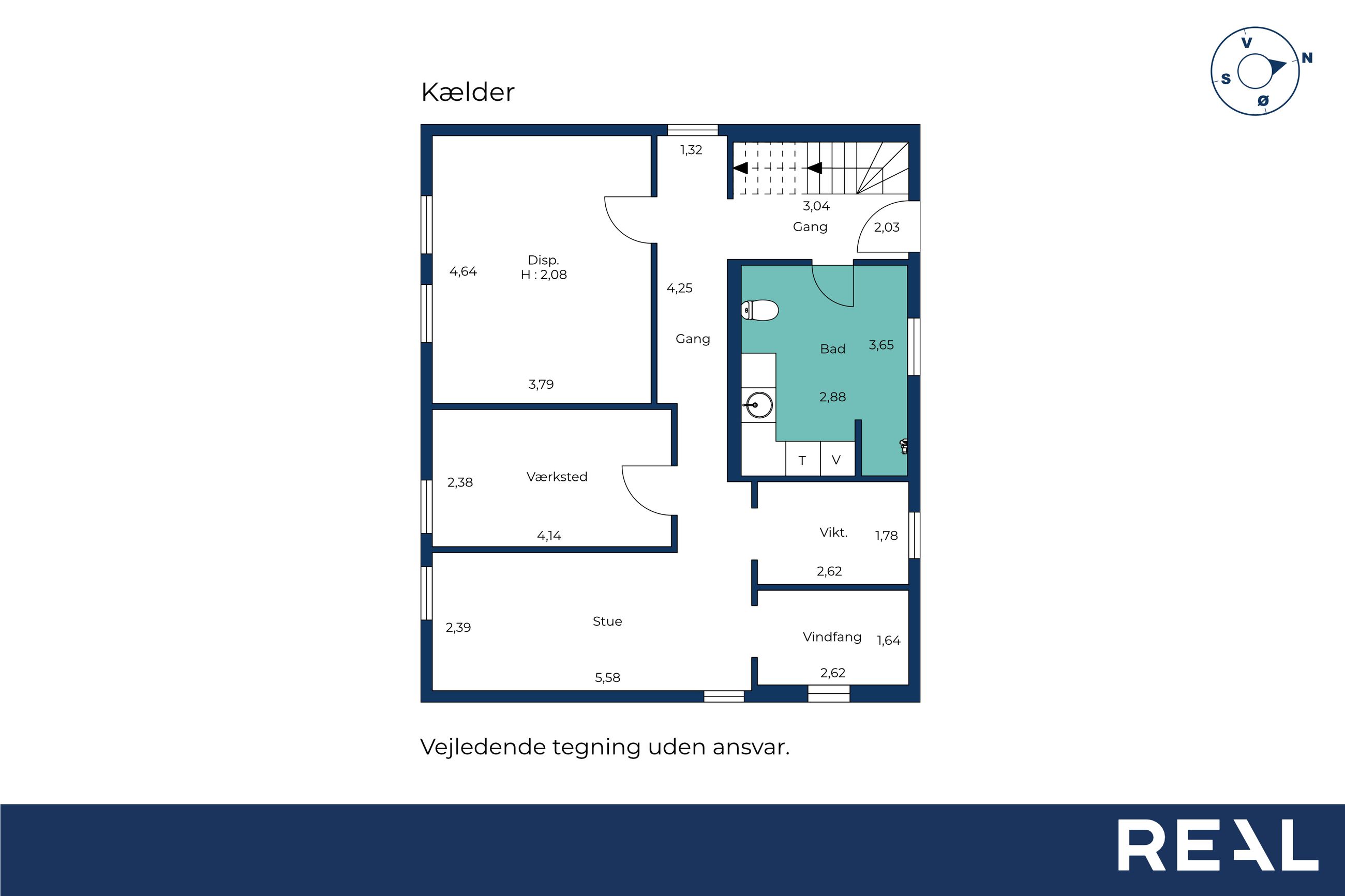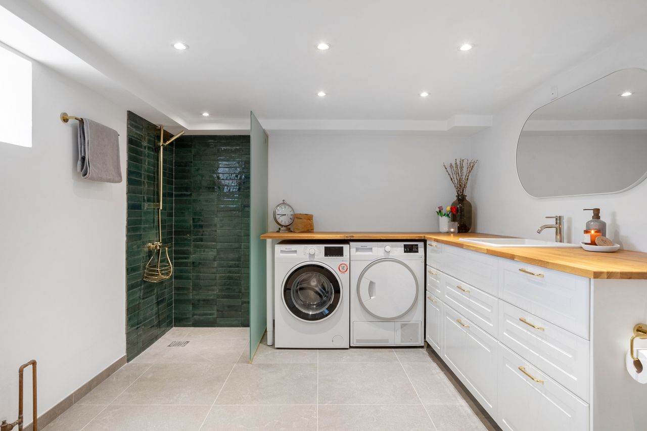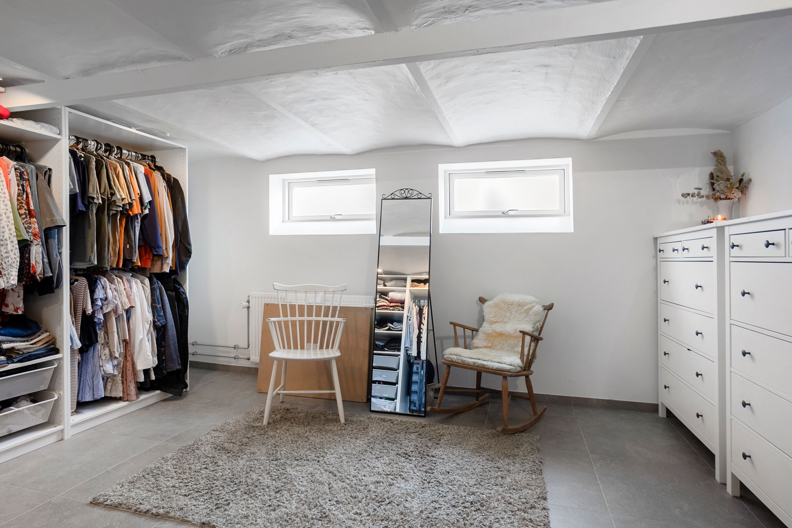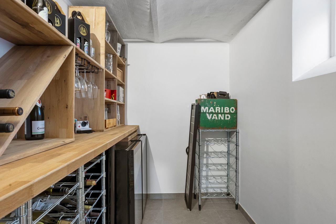 Kælderen, som ikke er godkendt til beboelse, er i virkelig flot stand og tilbyder fire disponible rum, der i dag er indrettet som blandt andet vinkælder med tilhørende hyggestue, påklædningsrum, værksted og viktualierum. Herudover er der et stort badeværelse med gulvvarme, hvilket gør kælderen yderst brugbar til mange formål.