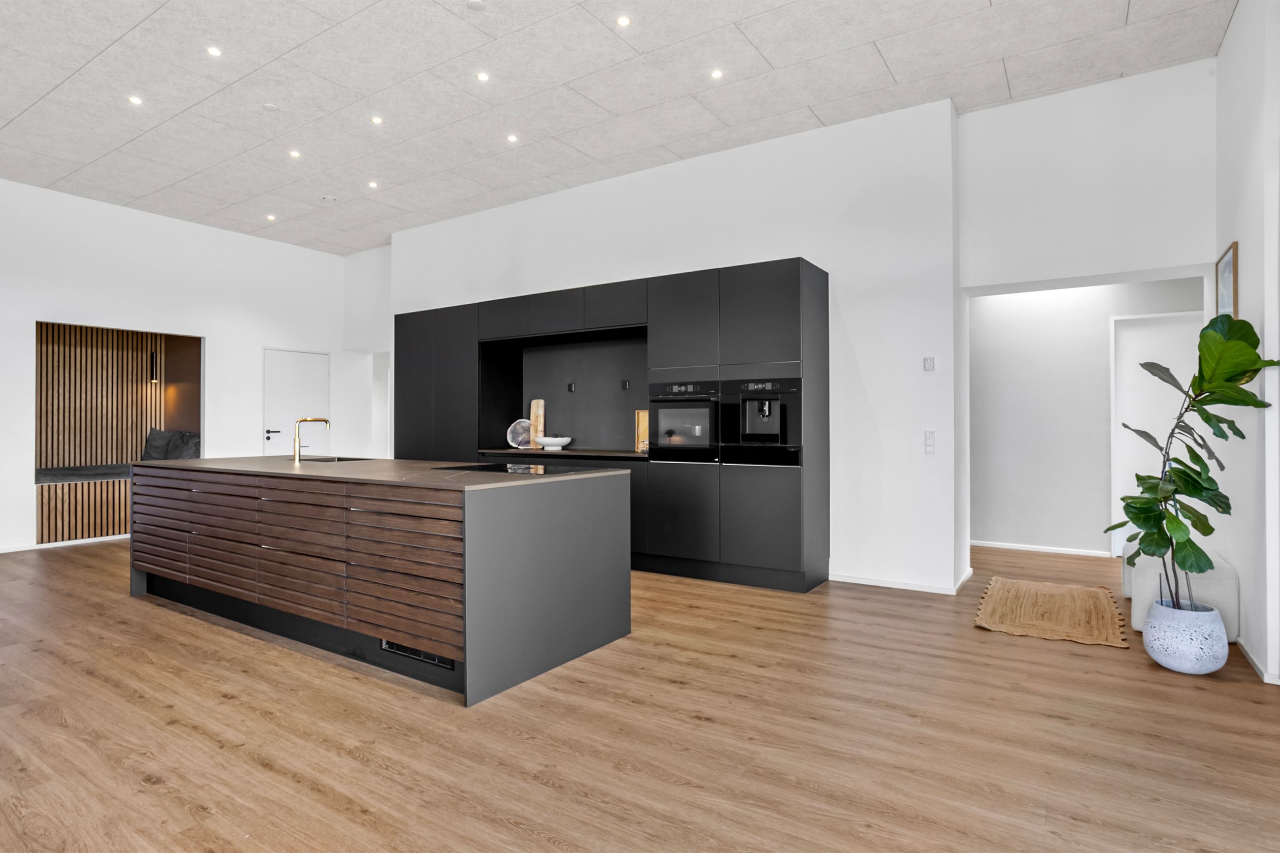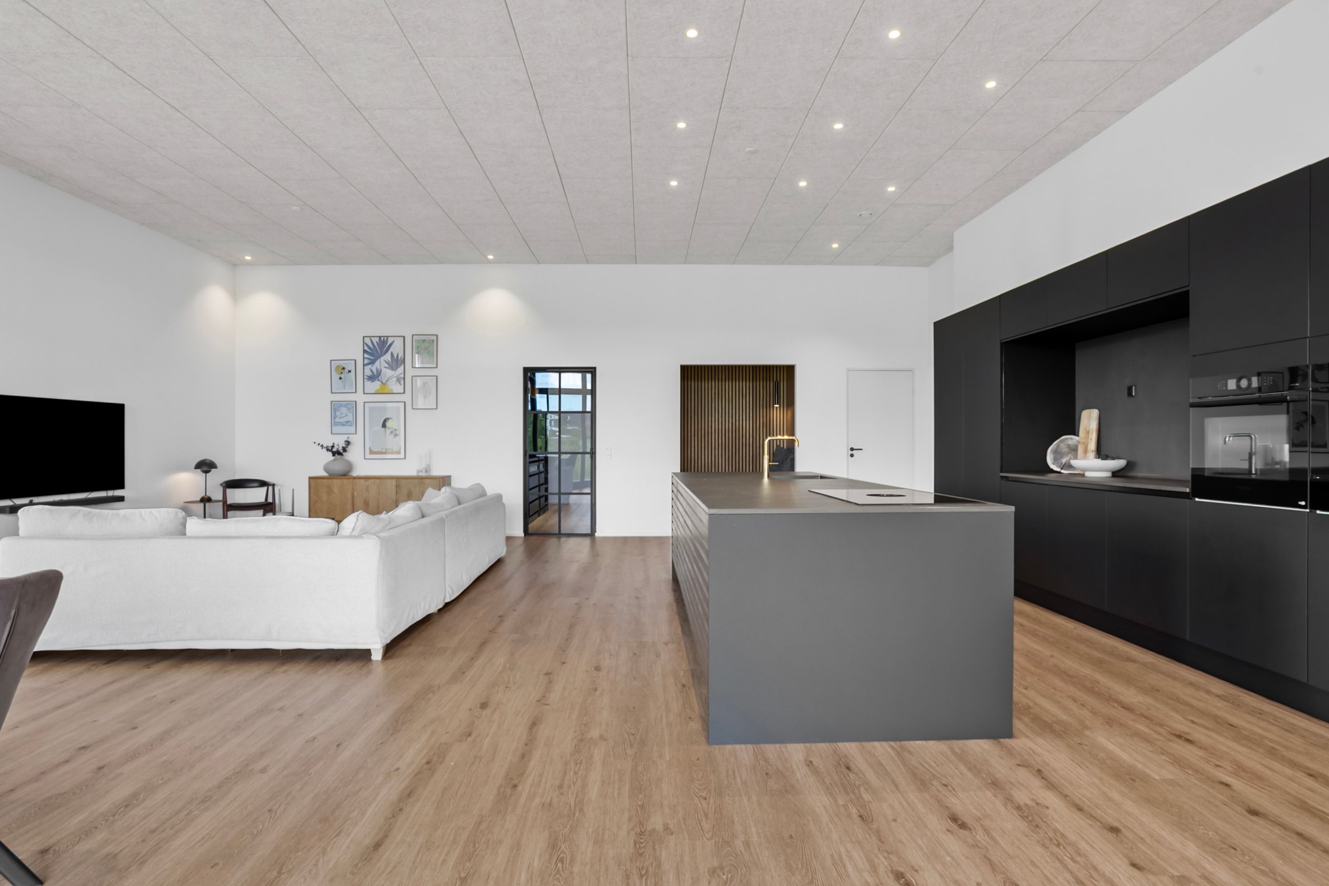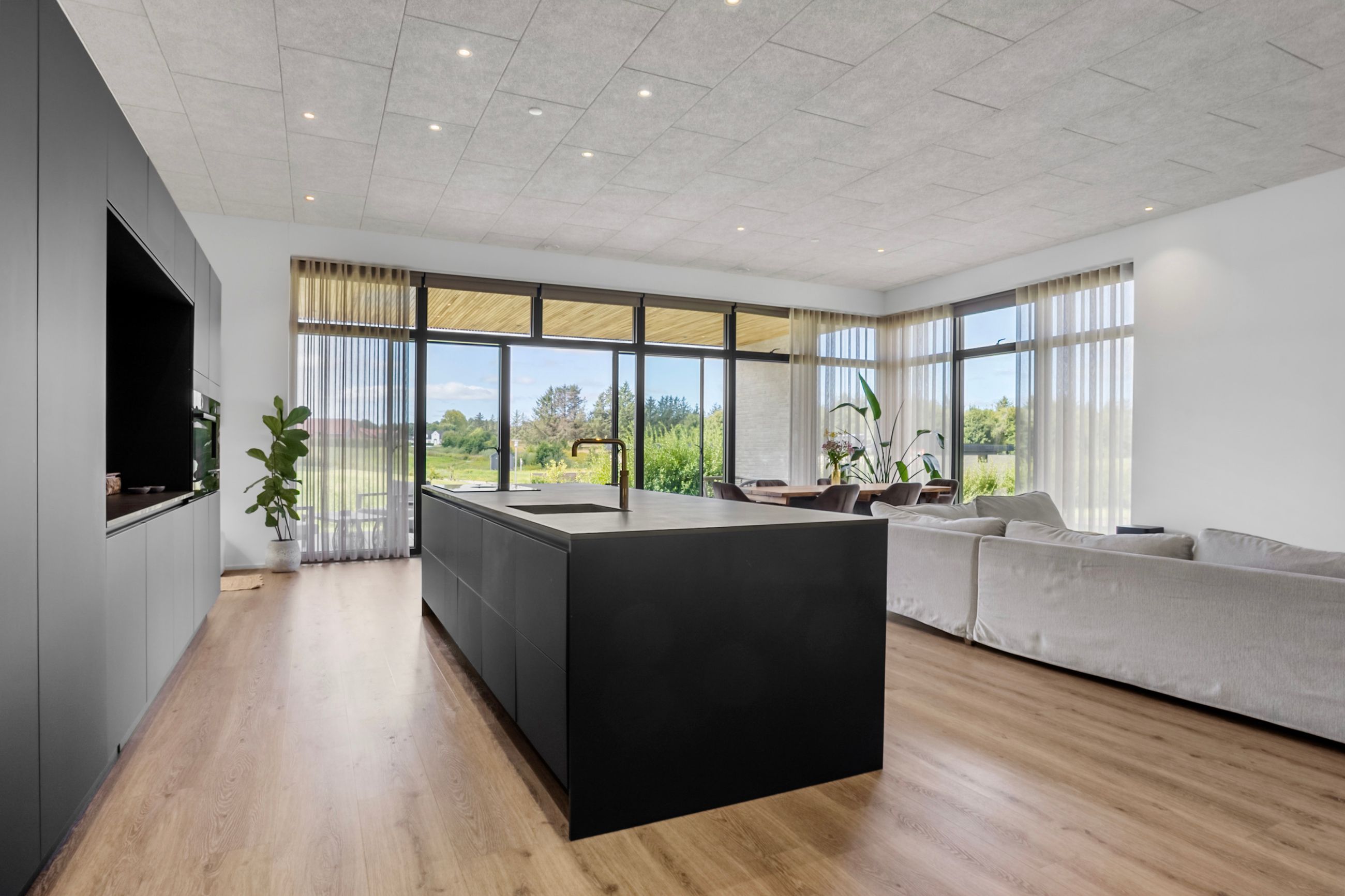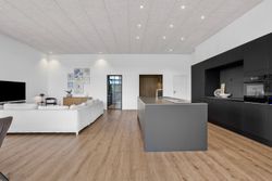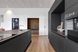 Komforten er i top med gulvvarme i hele huset – dog med undtagelse af viktualierummet – og derudover er boligen udstyret med både BWT-anlæg og genveksanlæg, som sikrer et sundt og behageligt indeklima året rundt. Køkken, bryggers og badeværelser er indrettet med stilrene elementer fra HTH, hvilket understøtter boligens stringente arkitektoniske linjer og moderne udtryk.