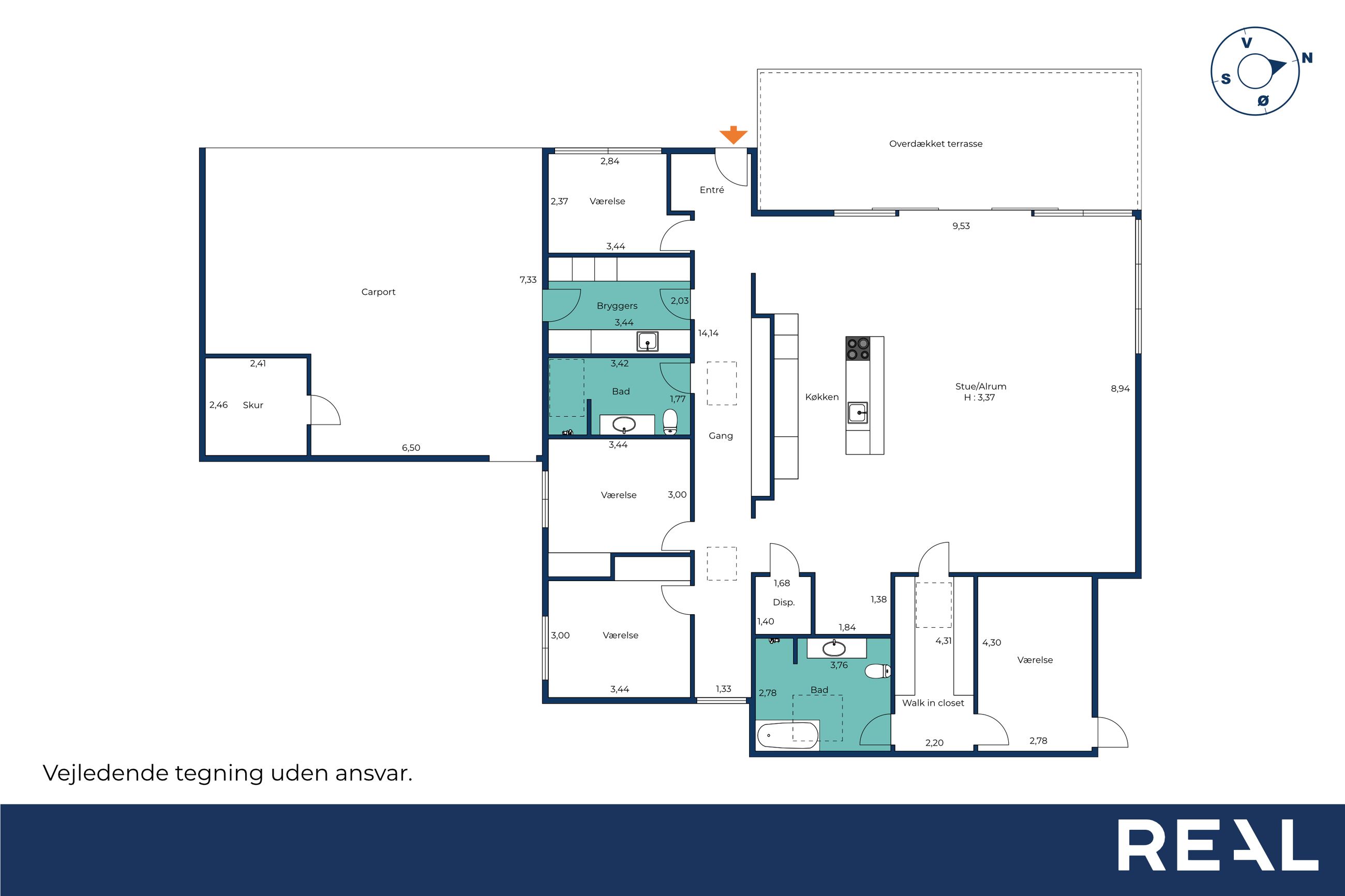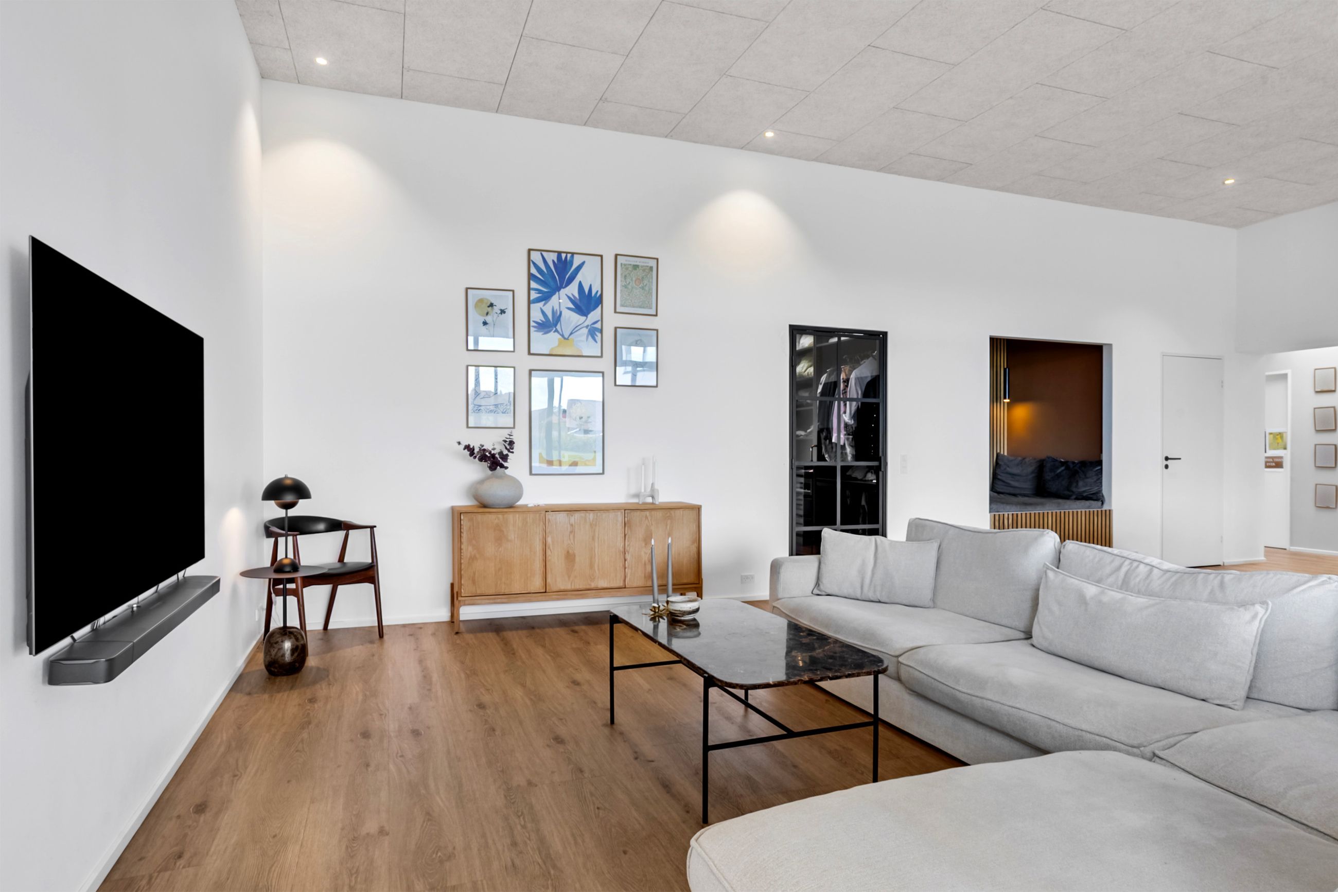 Indenfor bydes man velkommen i en lys entré, som leder videre til tre rummelige værelser og et badeværelse. Husets hjerte er uden tvivl det imponerende køkken/alrum, hvor loftshøjden på hele 3,37 meter skaber en helt særlig atmosfære. Her er der god plads til både hverdagens familieliv og hyggelige middage med gæster. Alrummet rummer også en integreret alkove med smart opbevaringsløsning samt et praktisk viktualierum.