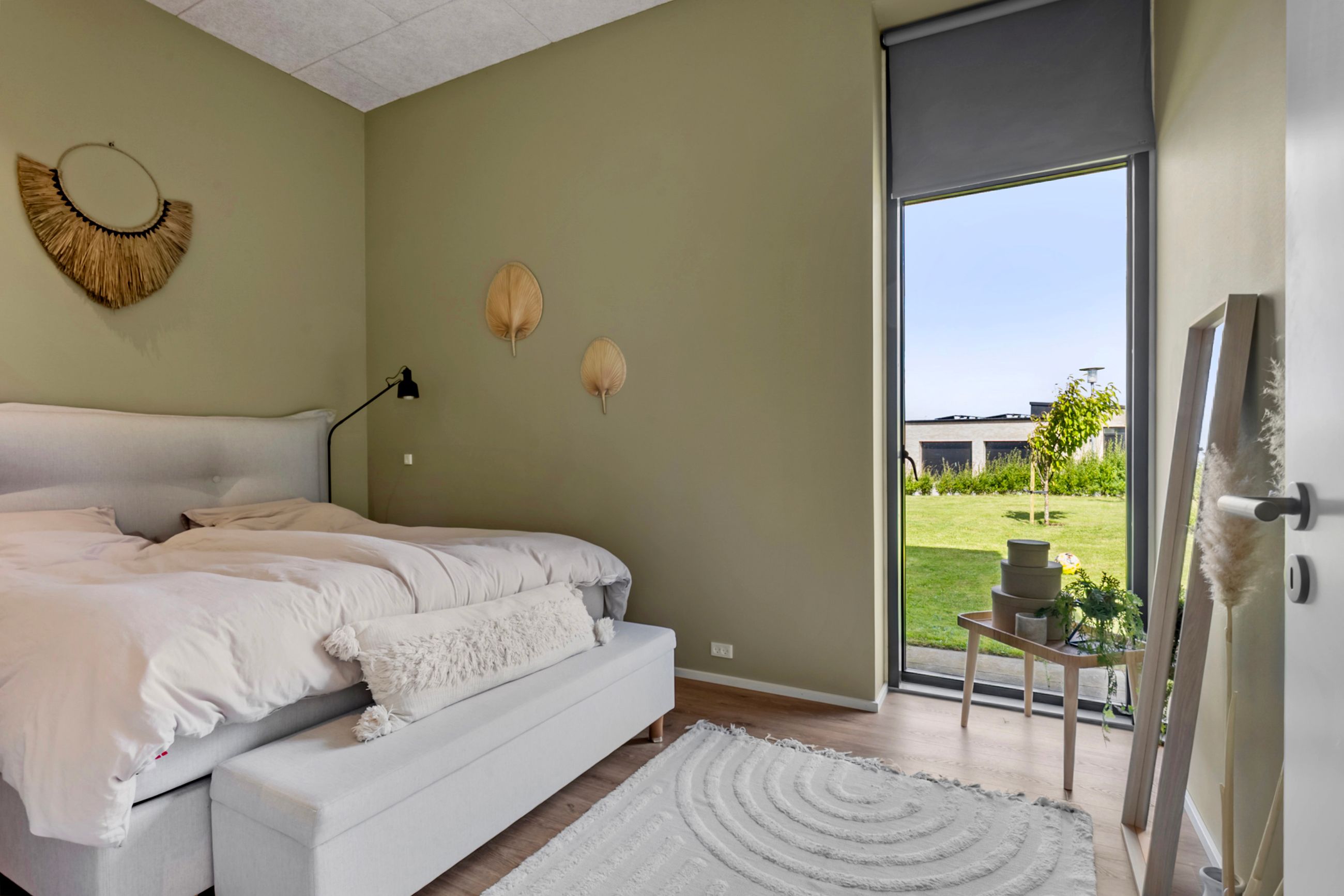 Fra alrummet åbner en stor skydedør ud til boligens overdækkede terrasse, som bliver et naturligt ekstra opholdsrum i de varme måneder. Her kan man sidde helt uforstyrret og nyde solen fra tidlig middag og langt ud på aftenen, hvad enten det er til afslapning, en hyggelig grillmiddag eller samvær med familie og venner. Terrassen skaber en glidende overgang mellem inde- og udeliv og gør det nemt at forlænge sommerdagene i komfortable rammer.