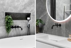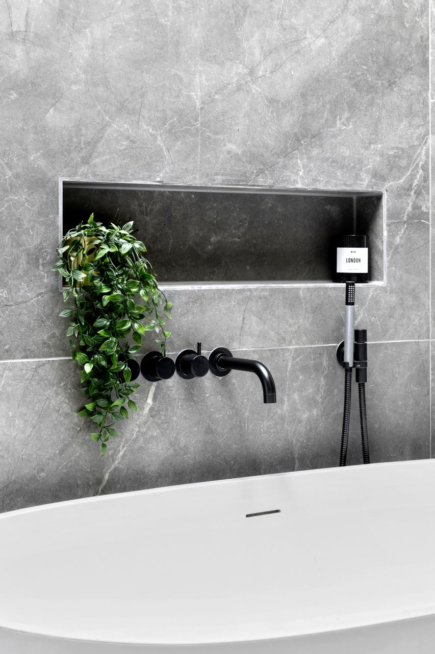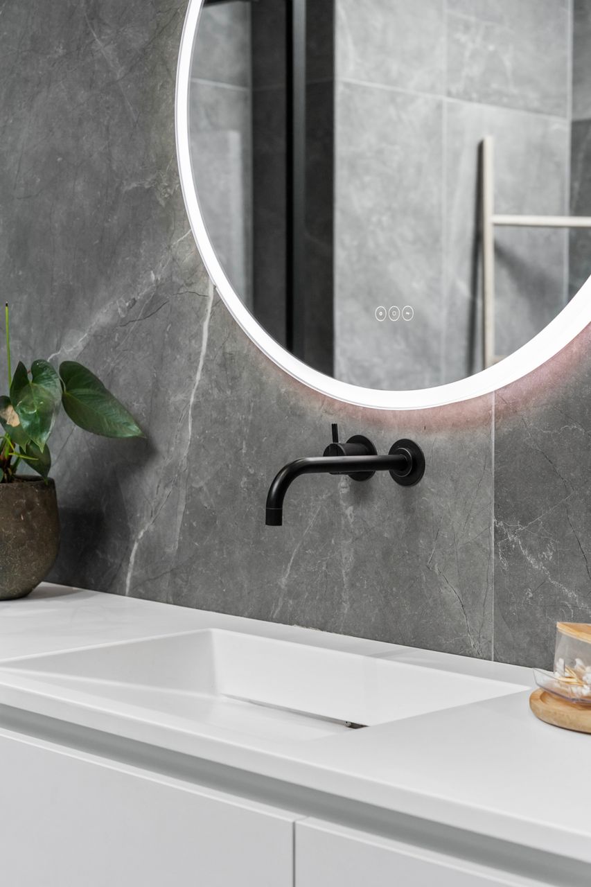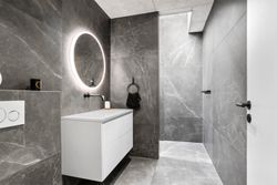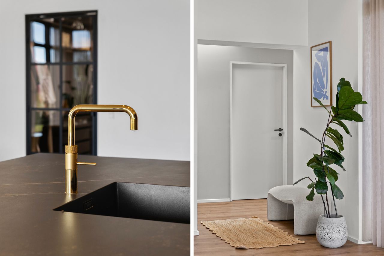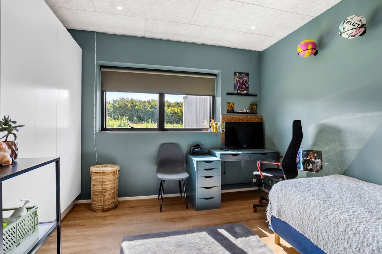 Fra alrummet er der ligeledes adgang til forældreafdelingen, som er indrettet med walk-in closet, soveværelse og et luksuriøst badeværelse. Her finder man både en rummelig bruseniche og et elegant fritstående stenbadekar, der giver rummet en eksklusiv spa-følelse. Begge badeværelser er udstyret med Vola-armaturer og store ovenlysvinduer med motor og regnsensor, hvilket kombinerer høj kvalitet med smukt lysindfald året rundt.