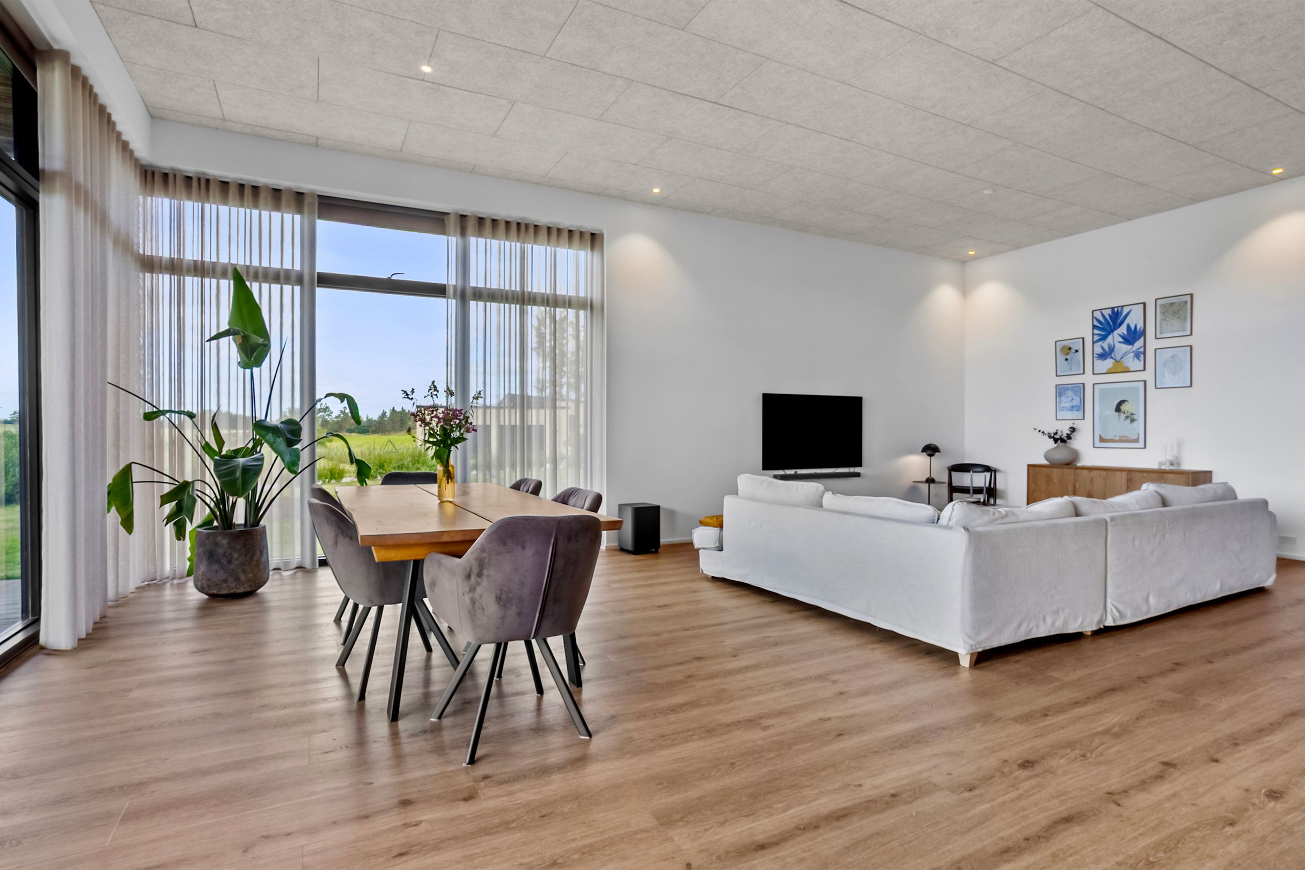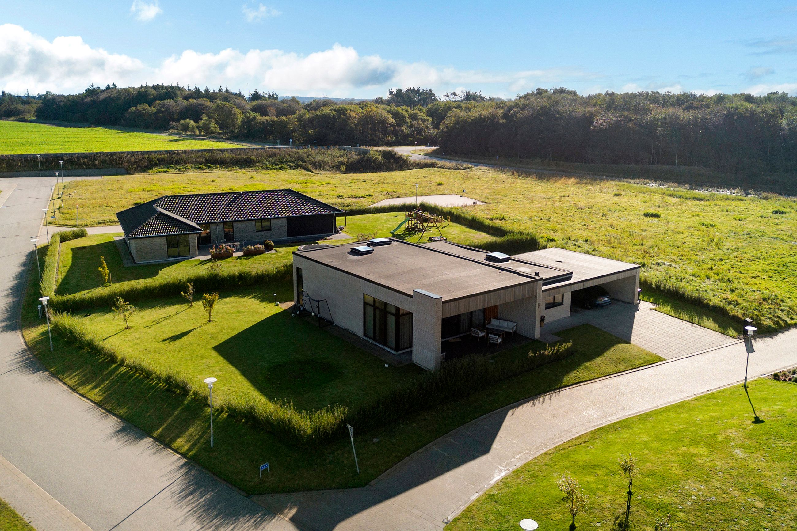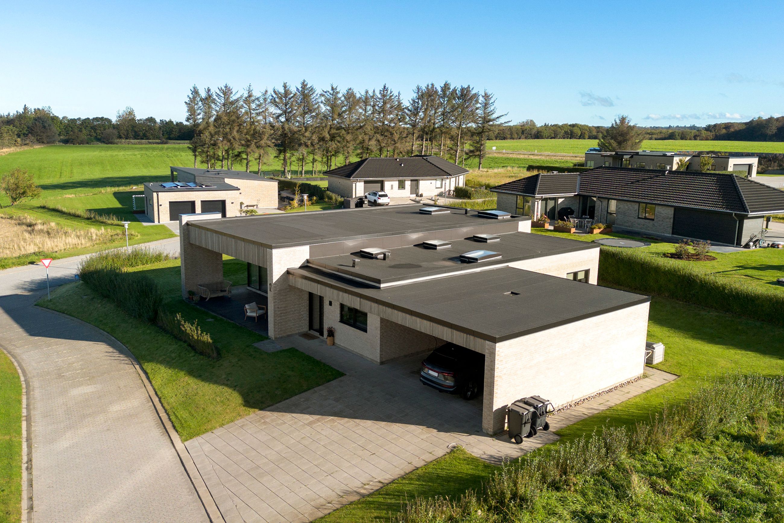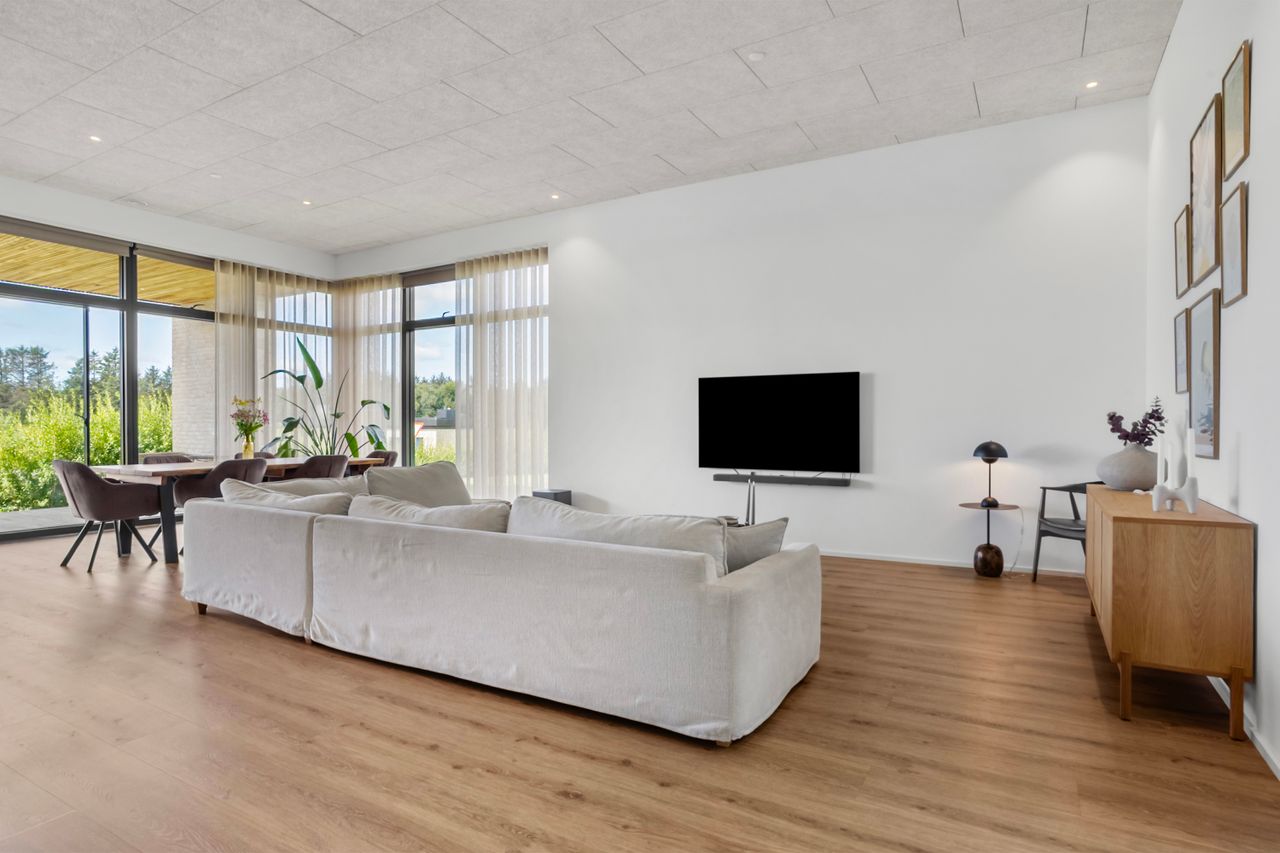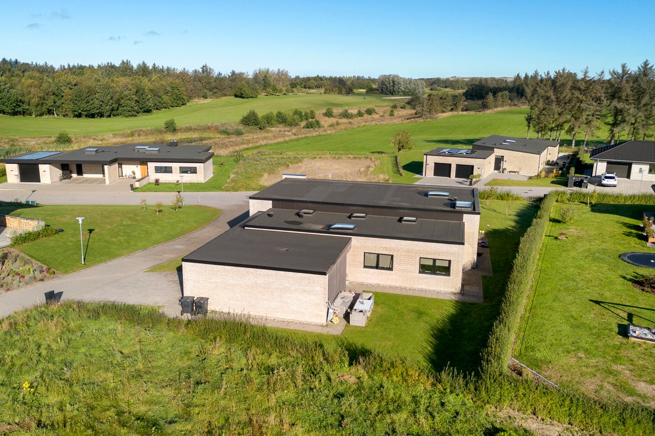 Denne moderne funkisvilla på Golfhaven 12 i Højene er opført i 2021 og rummer hele 214 m2 bolig, der er gennemtænkt ned til mindste detalje. Ejendommen er placeret på en 1.109 m2 stor grund i et attraktivt nybyggerkvarter, hvor boligerne skyder op side om side, og hvor nabolaget emmer af ro og tryghed. Her kan børnene frit cykle, lege og færdes sikkert, mens de voksne kan nyde områdets mange muligheder for golf, mountainbike, løb eller gåture i den nærliggende skov. Skole og indkøb ligger blot få hundrede meter fra ejendommen, hvilket gør hverdagen nem og overskuelig.