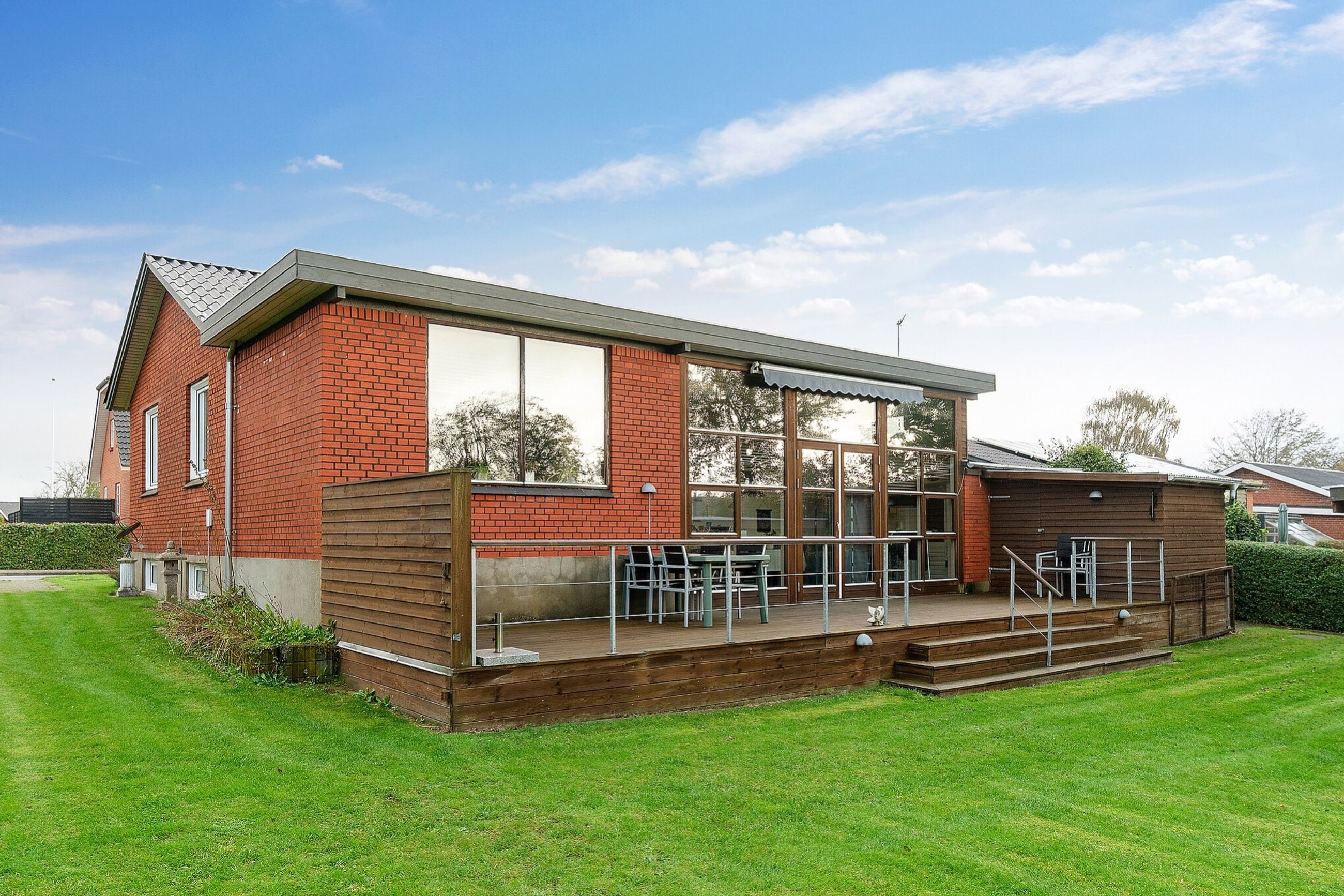 Fra udestuen er der udgang til træterrasse. Herfra nedgang til haven, der er udlagt i græs og store træer.