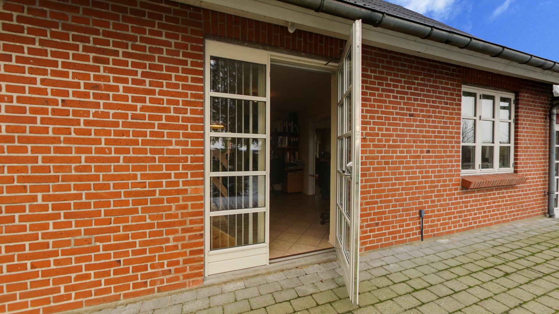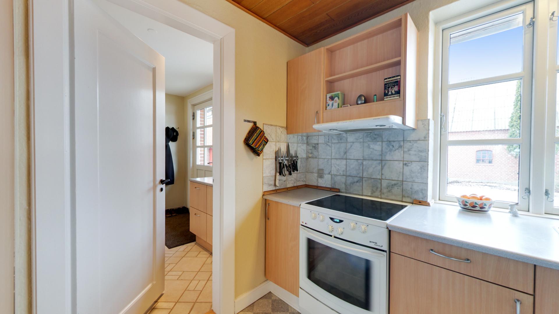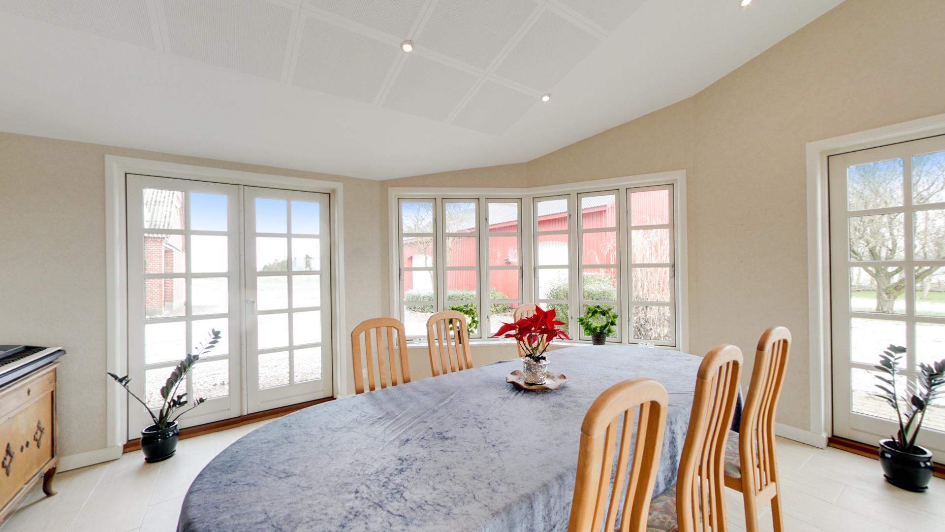 med gulvvarme, spots i loftet og 3 udgange til gården og/eller haven. Ydermere er der en storslået udsigt gennem de sprossede