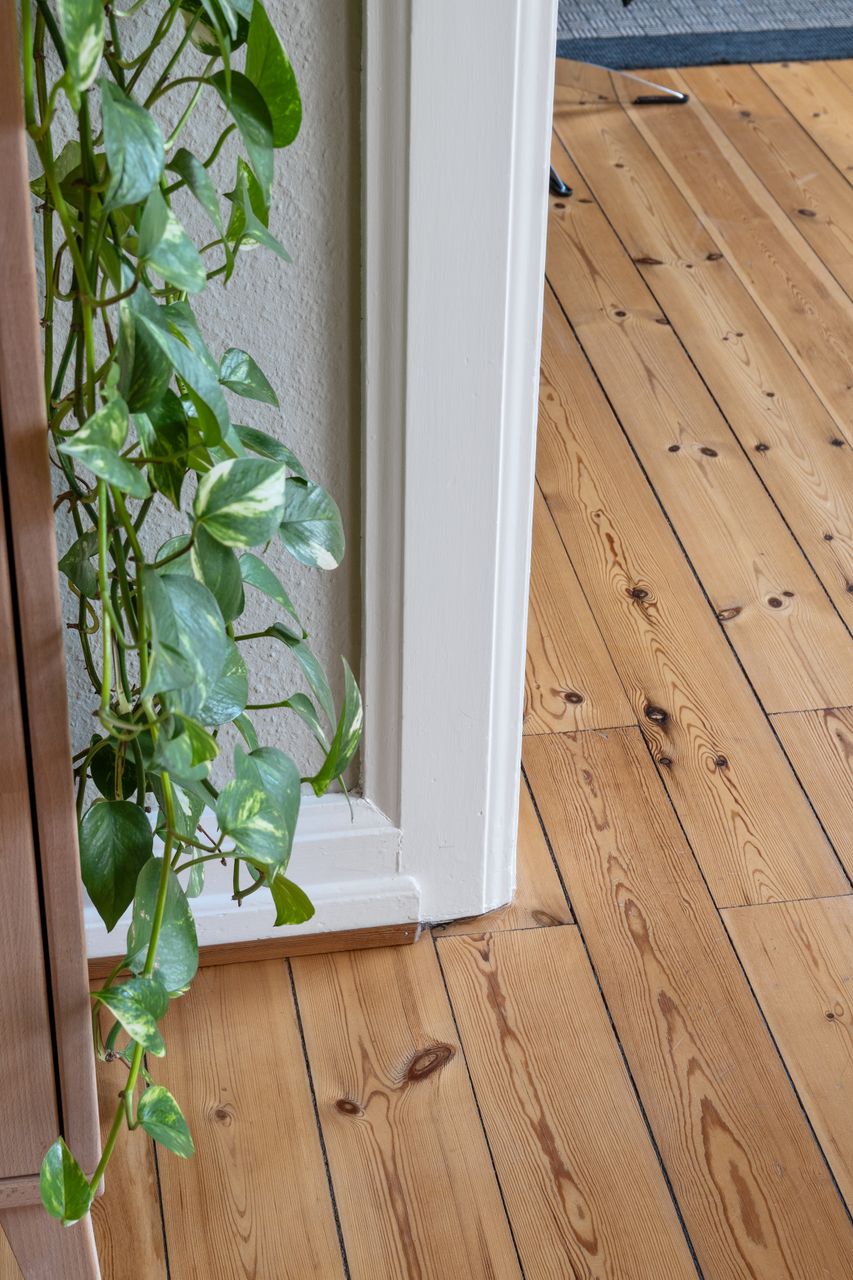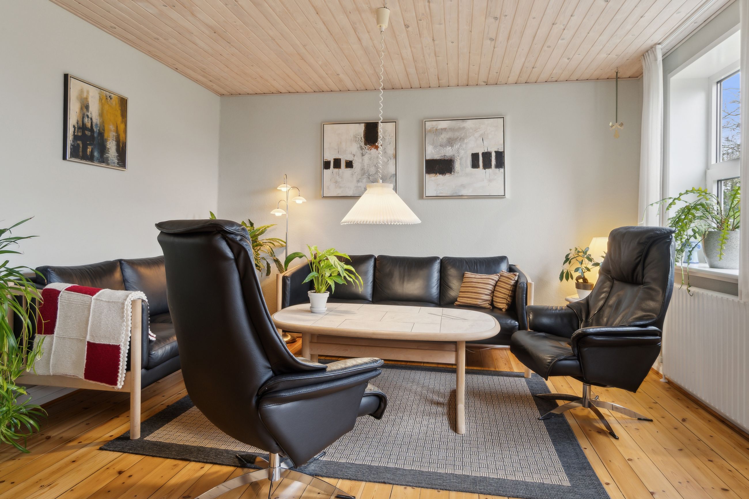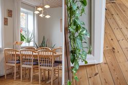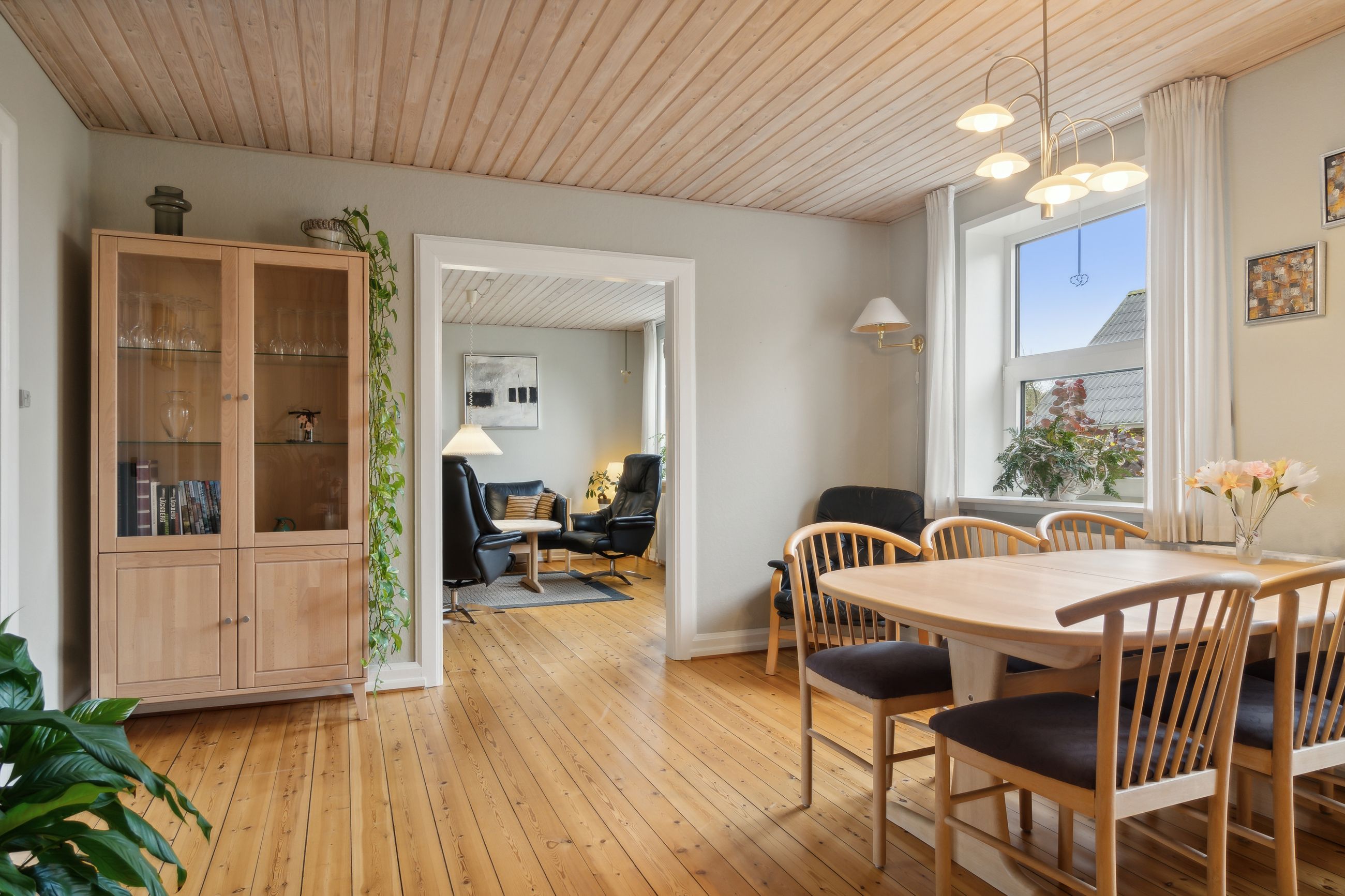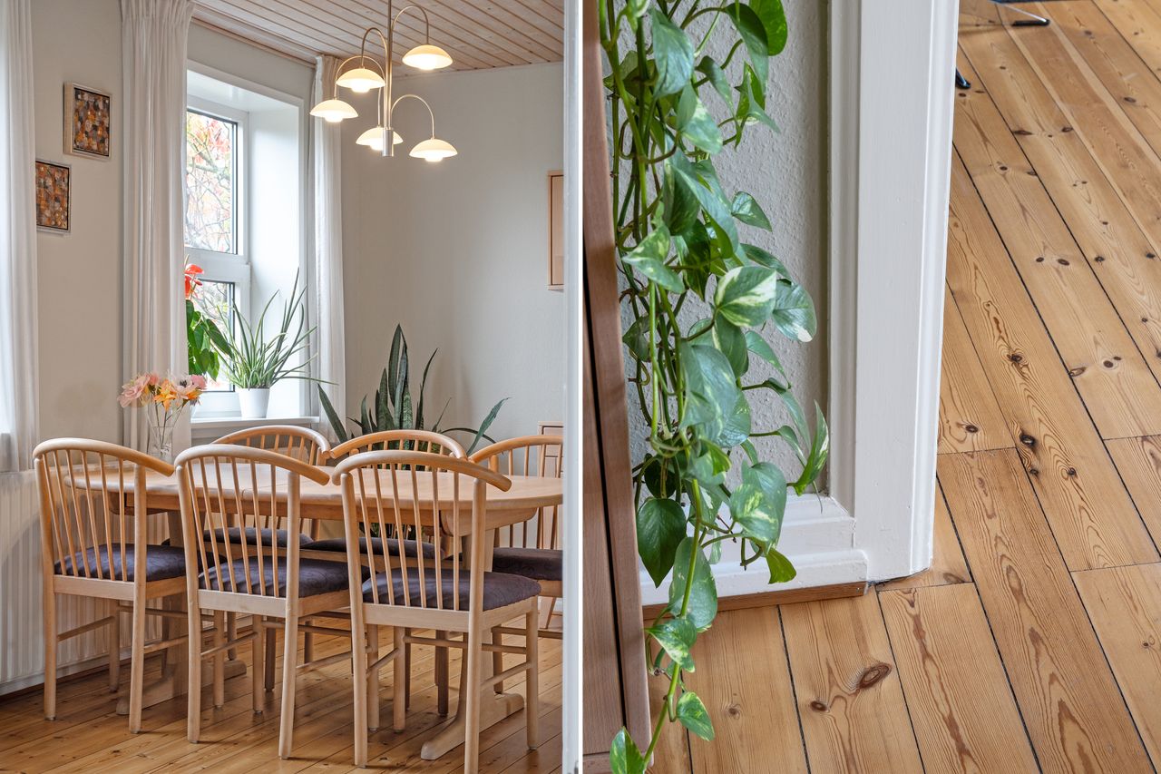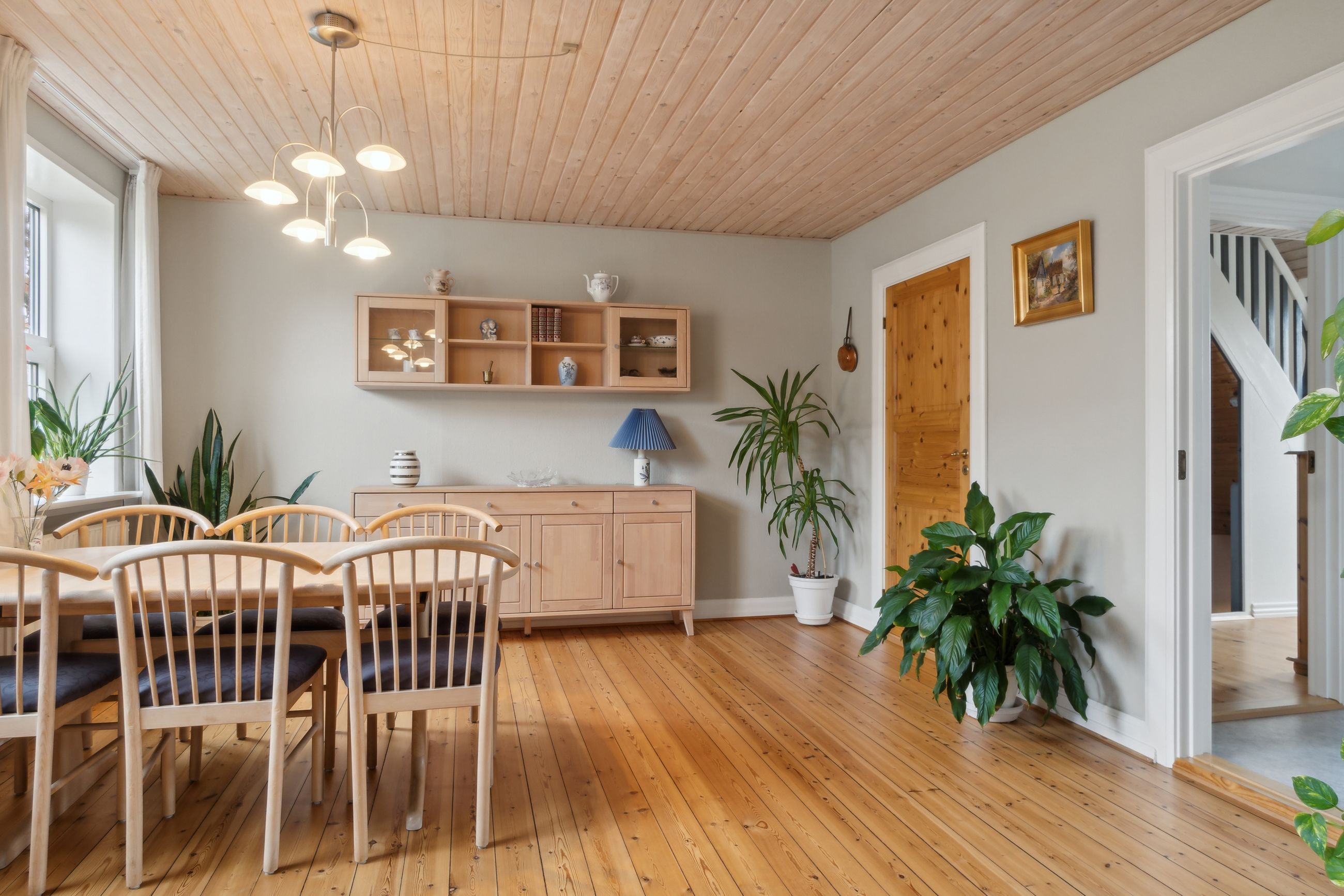 Stueplanen imponerer med en lys spisestue med smukke fyrretræsgulve og klassiske listelofter, som fortsætter til den hyggelige opholdsstue - perfekt til afslappende stunder og samvær.