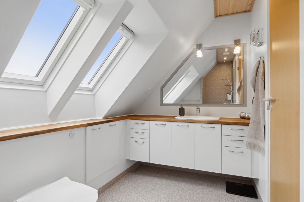 Et lyst badeværelse med bruseniche og gulvvarme fuldender etagen.
