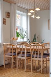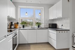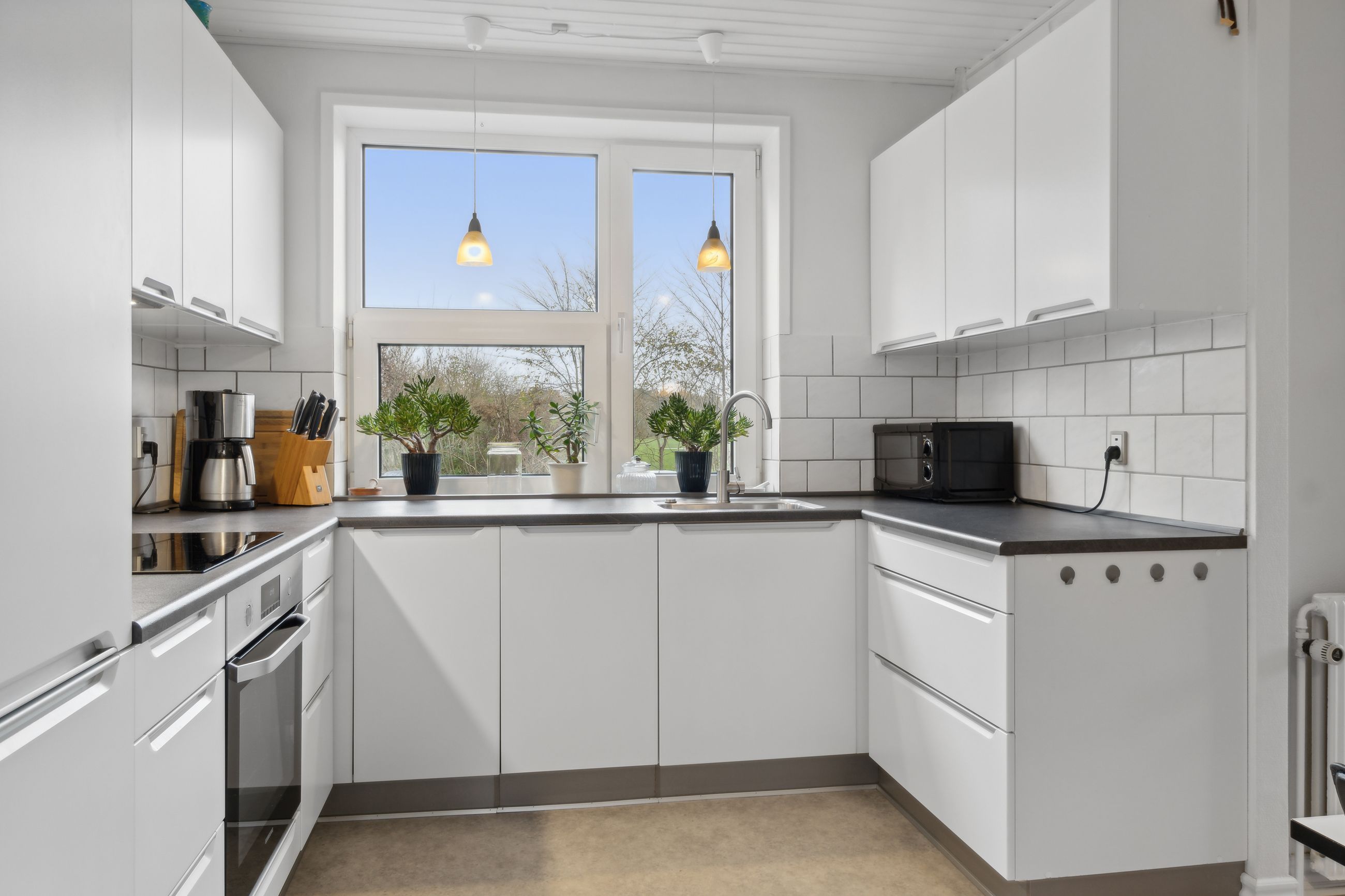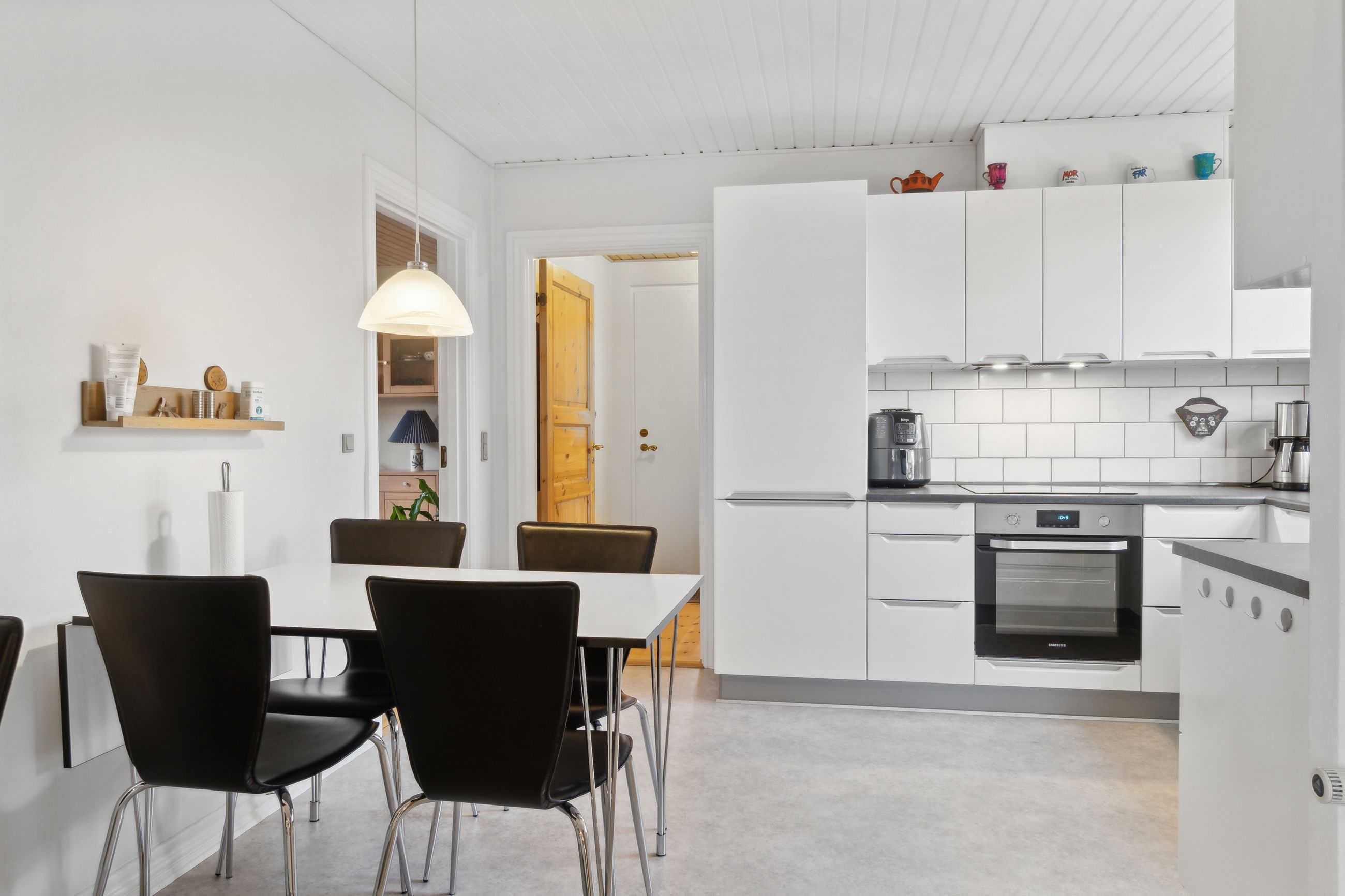 Det rummelige spisekøkken har plads til spisebord og byder på et lyst og funktionelt miljø.
