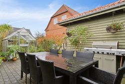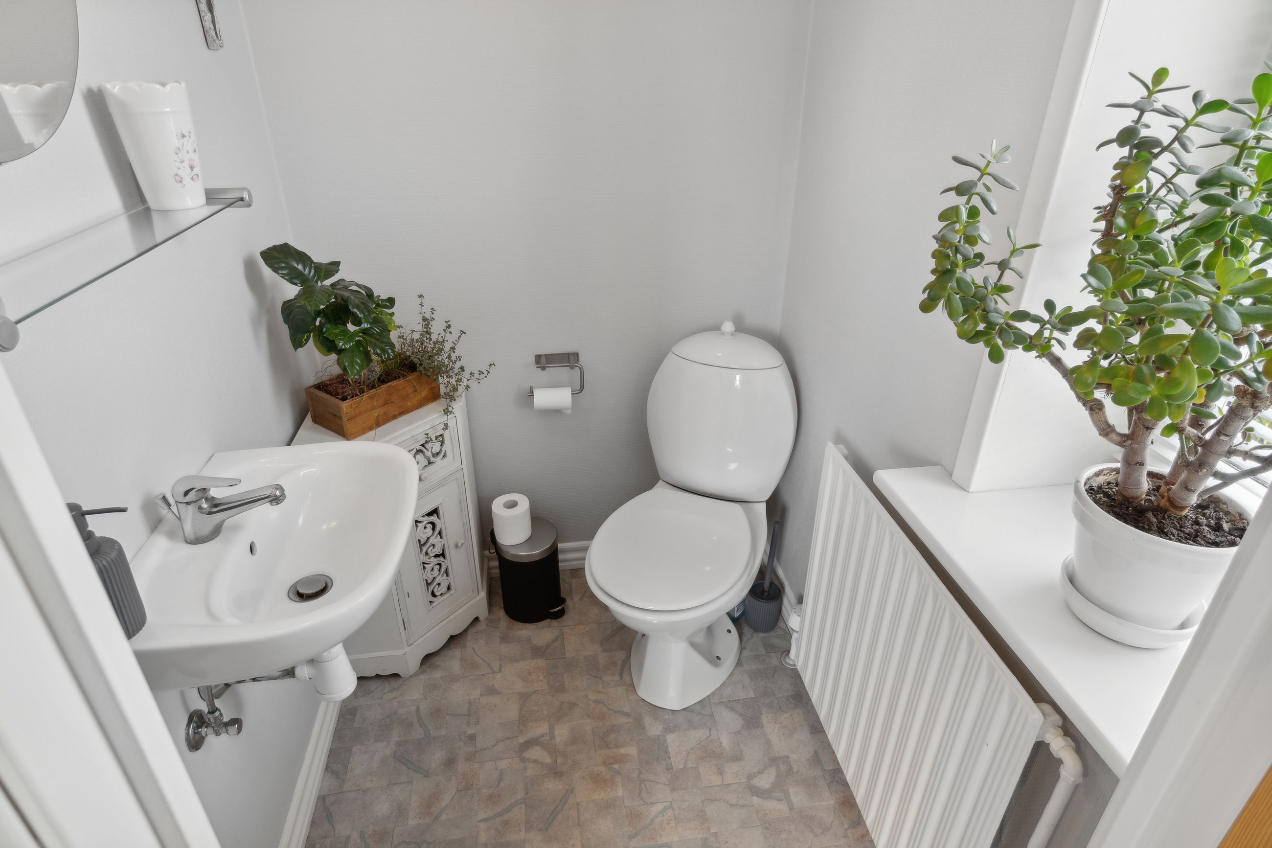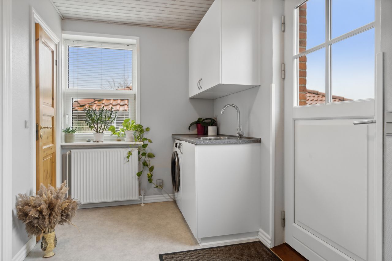 Fra den renoverede baggang (2021), er der direkte udgang til haven, samt adgang til et lyst gæstetoilet.