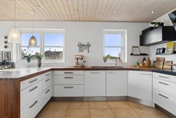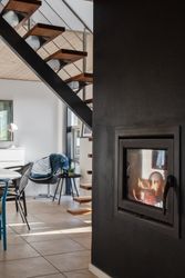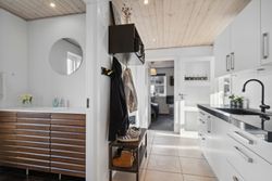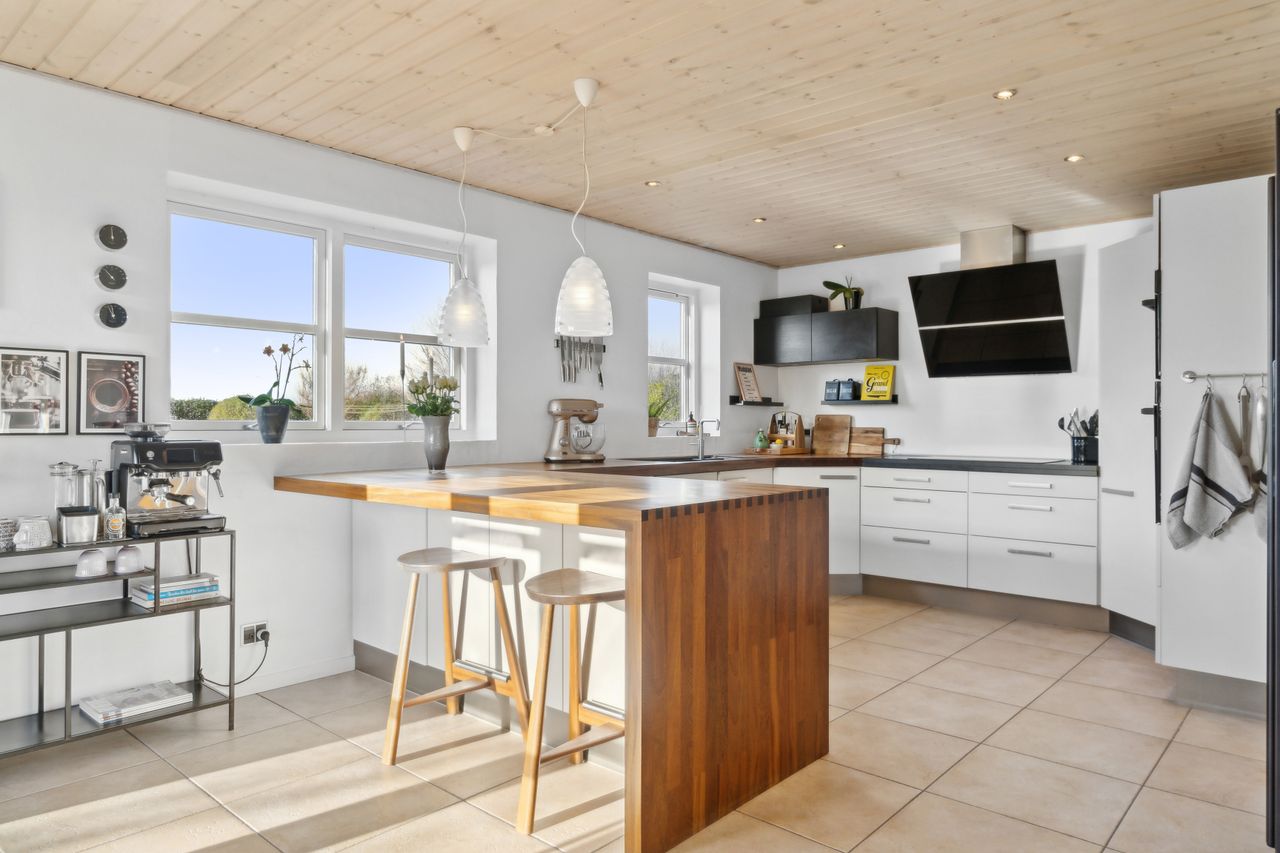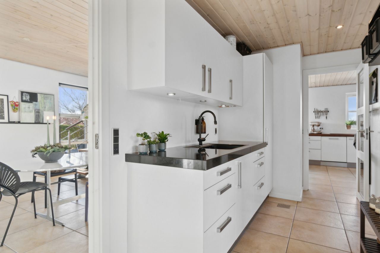 Når I træder ind, mødes I af en smagfuldt indrettet entré med klinker og elegante granitdetaljer, som straks sætter en standard for resten af huset. Villaens hjerte er det åbne Invita-køkken, hvor mahognibordpladen og de luksuriøse hvidevarer skaber en perfekt balance mellem æstetik og funktionalitet. Her er der plads til at samle familien ved barstolene, mens madlavningen foregår – en naturlig ramme for hyggelige stunder i hverdagen. Alrummet, som er i åben forbindelse til køkkenet, byder på en indbygget pejs, der spreder varme og en hyggelig stemning. Herfra har I direkte udgang til en solrig stor syd-vestvendt træterrasse, hvor I kan nyde lange, lyse sommeraftener.