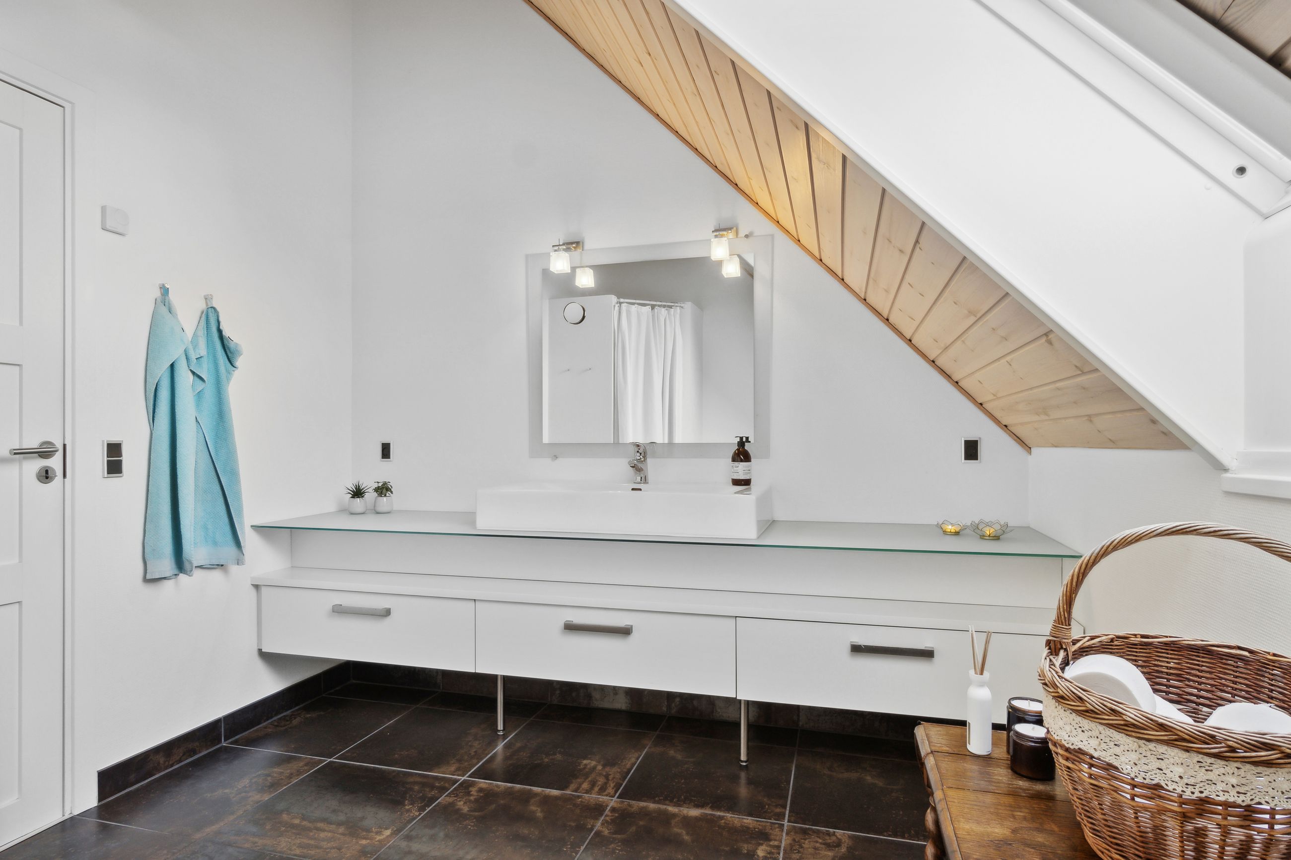 I stueplan findes desuden to store, lyse værelser og et badeværelse, indrettet med nyere JKE-interiør og brus.
