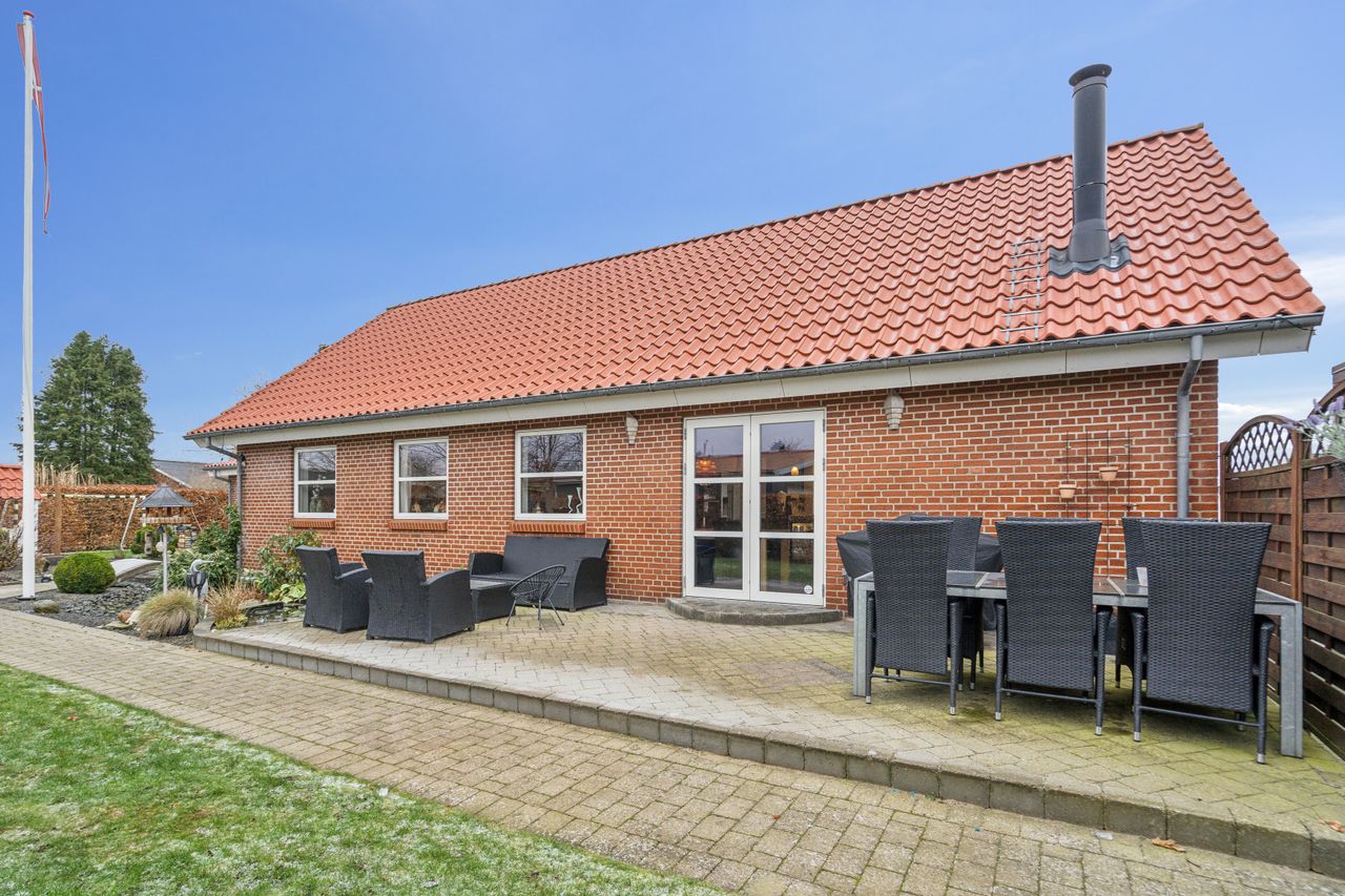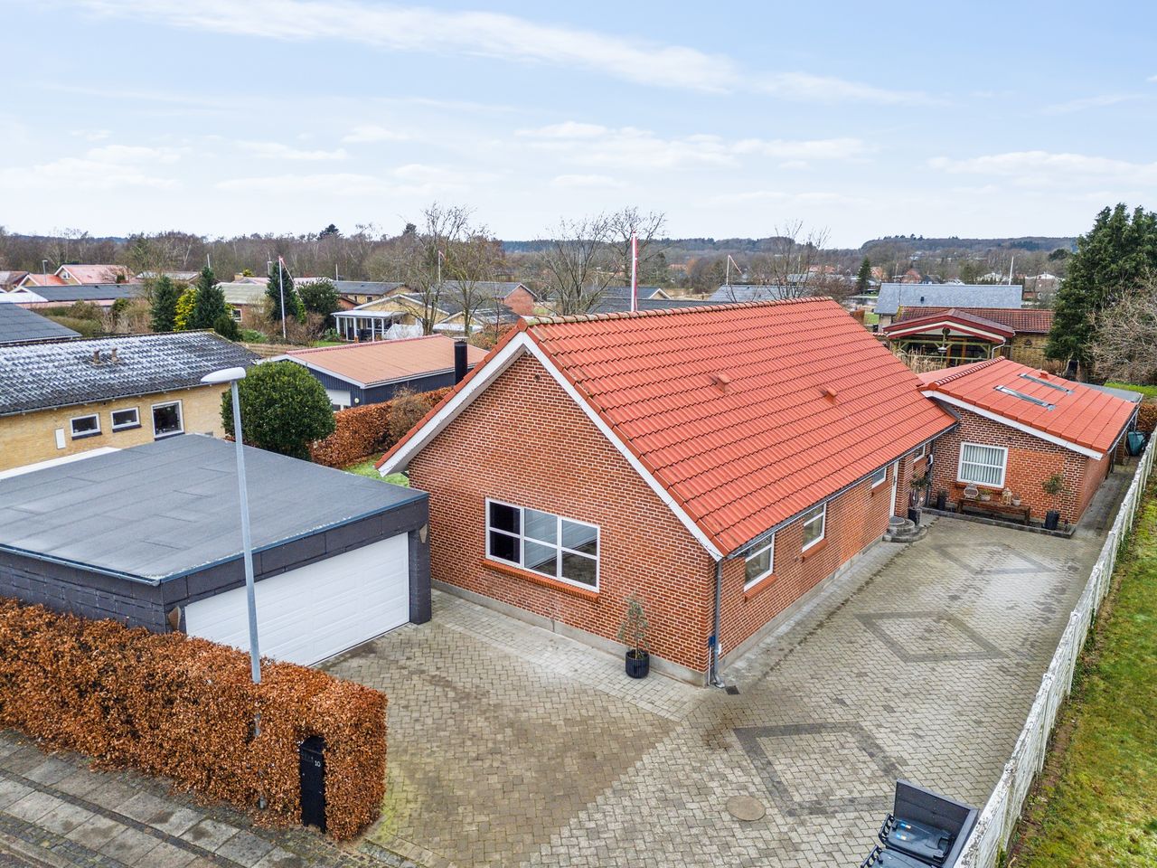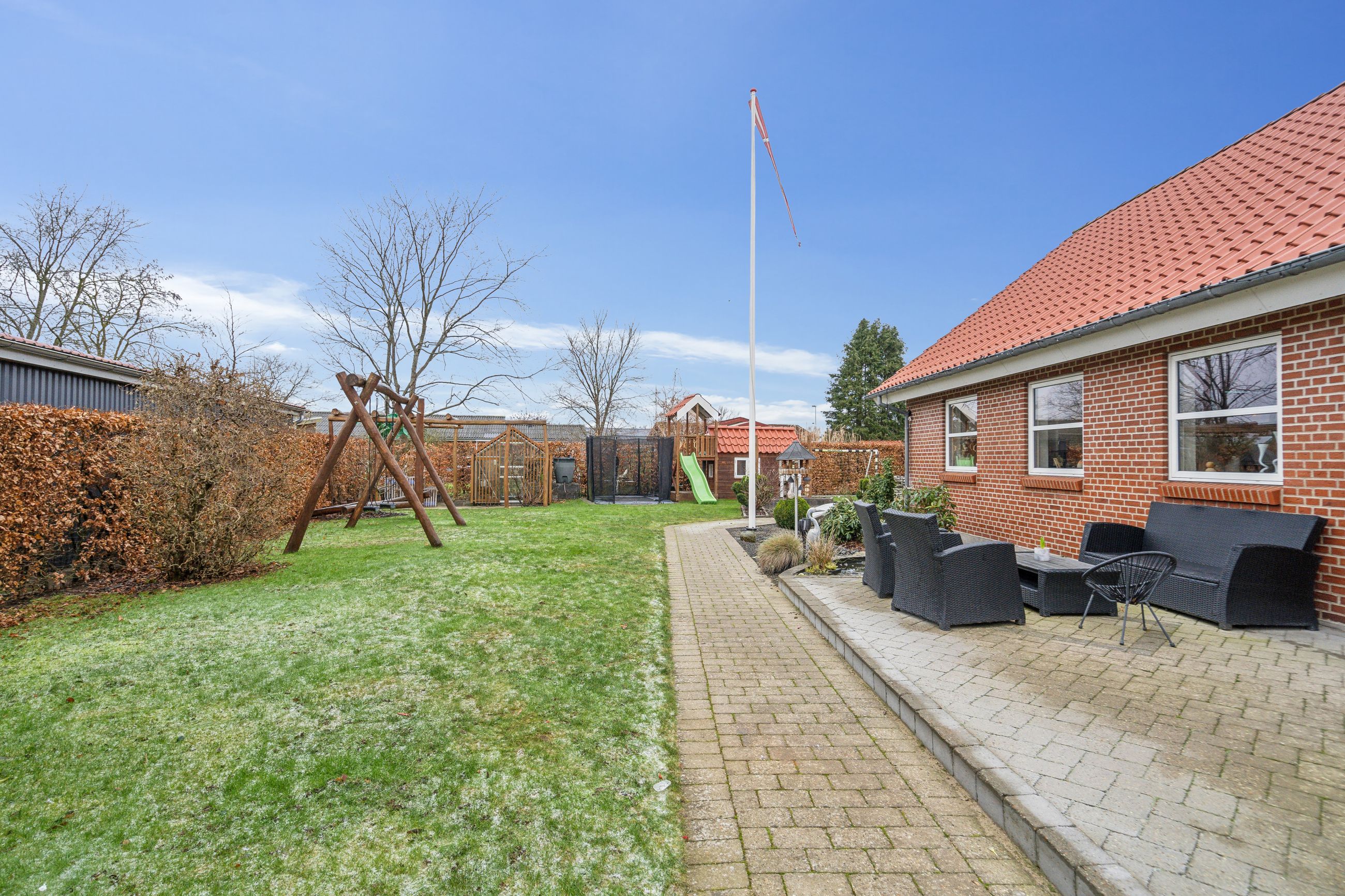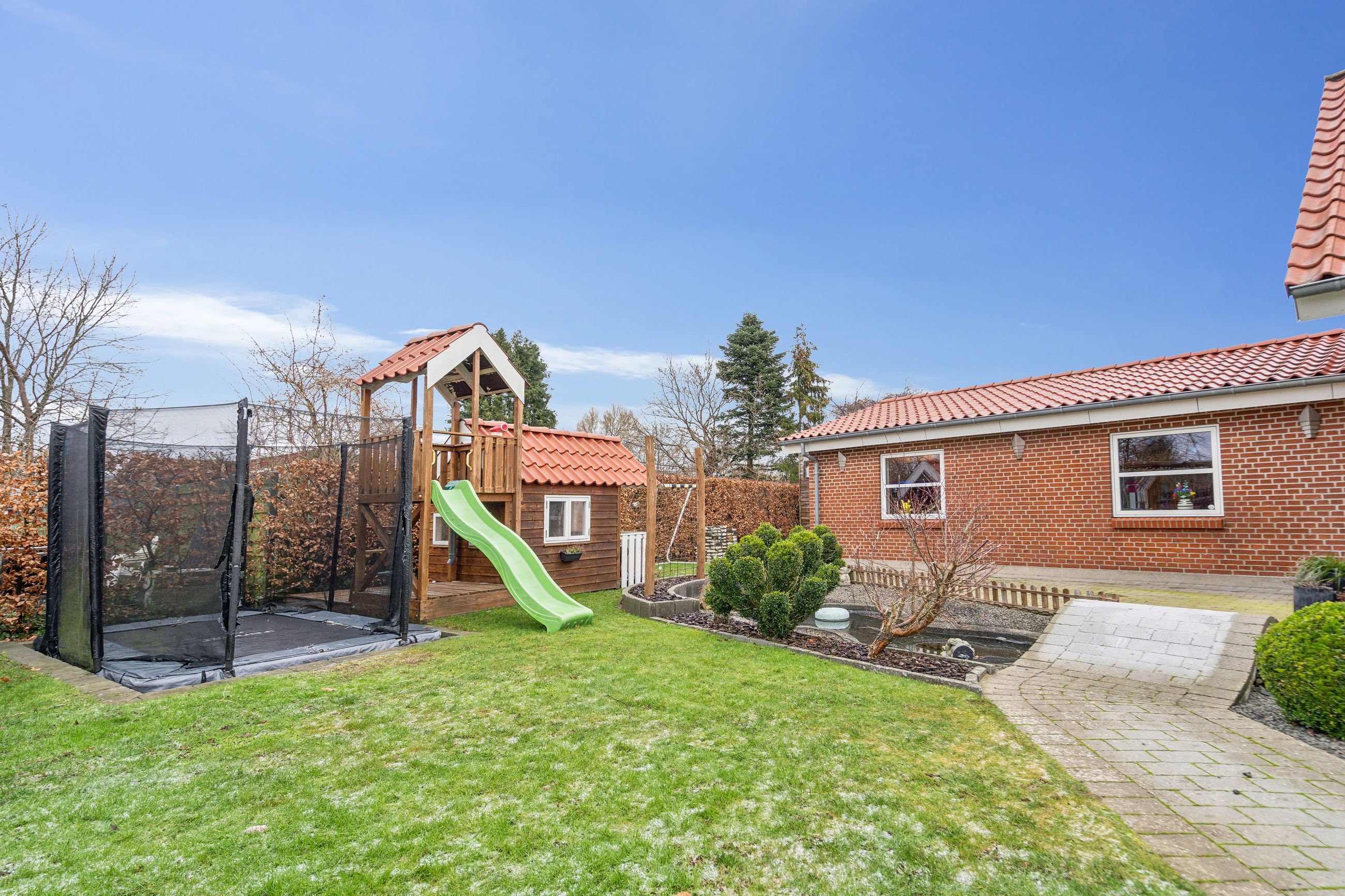 Til villaen hører flisebelagt indkørsel til isoleret og opvarmet garage på 49 kvm fra 2016 med el-port. Garagen er udstyret med en luft-til-luft varmepumpe, troldtekt loft med spots og solvarme. Derudover er villaen omkranset af sin egen lille oase med plads til både afslapning og leg. Den indbydende have rummer bl.a. en nedgravet trampolin, et legehus og en gynge, som gør den til børnenes eget lille paradis. Flere smukke terrasser, en pergola og et drivhus skaber hyggelige oaser rundt om huset, mens et mindre vandløb giver ekstra charme til haven.