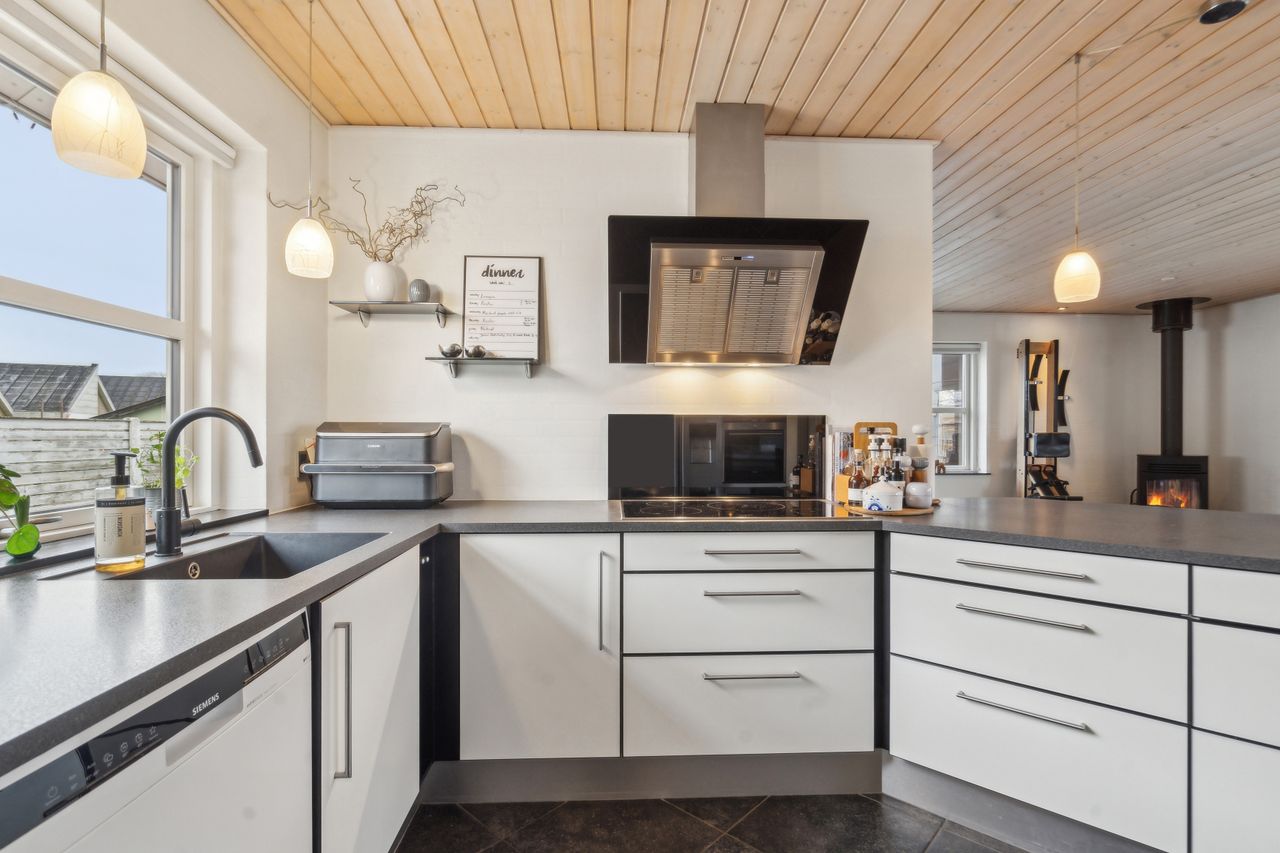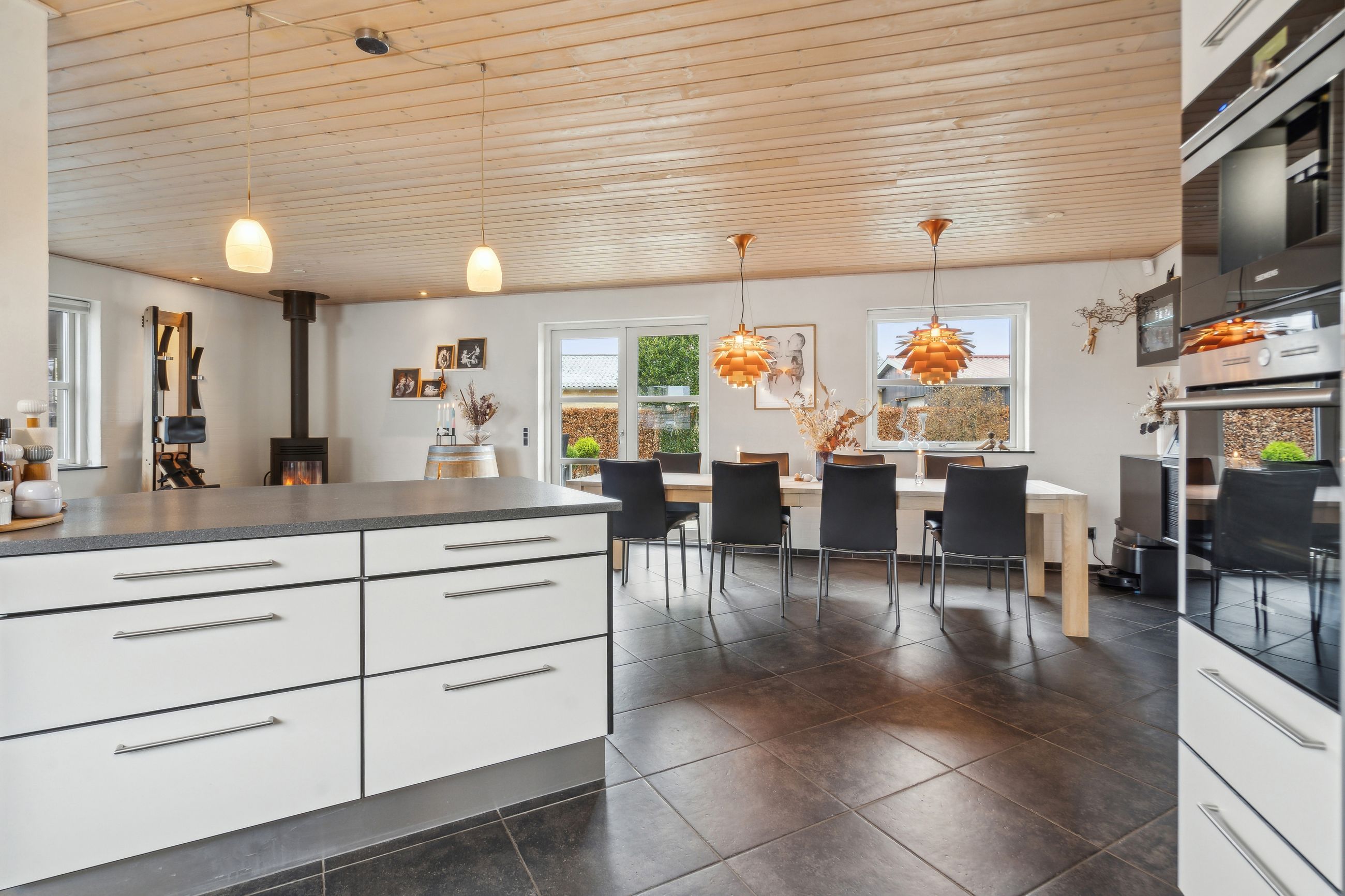 Du bydes velkommen via en lys og indbydende entré/bryggers med direkte adgang til et åbent og rummeligt køkken/alrum. Køkkenet, fra Biga (i dag Kreum), er både funktionelt og stilrent og indrettet med bl.a. et hjørne(walk-in) skab og forbinder sig perfekt med den store stue, der har en hyggelig brændeovn og udgang til syd-/vestvendt privat terrasse og en smuk, ugenert have.