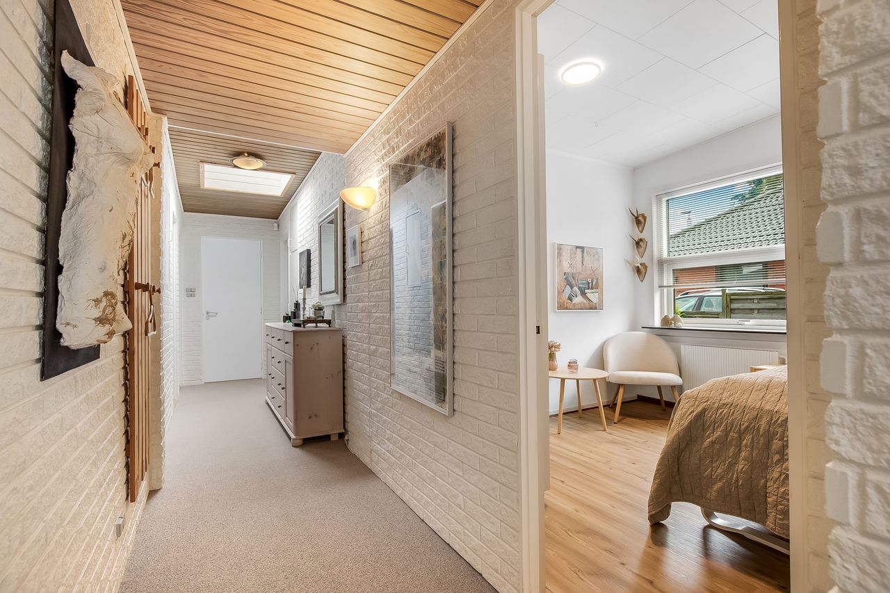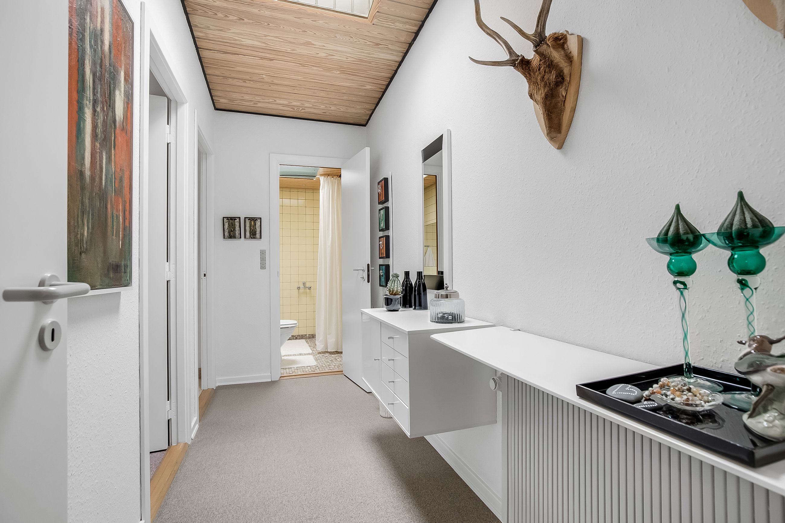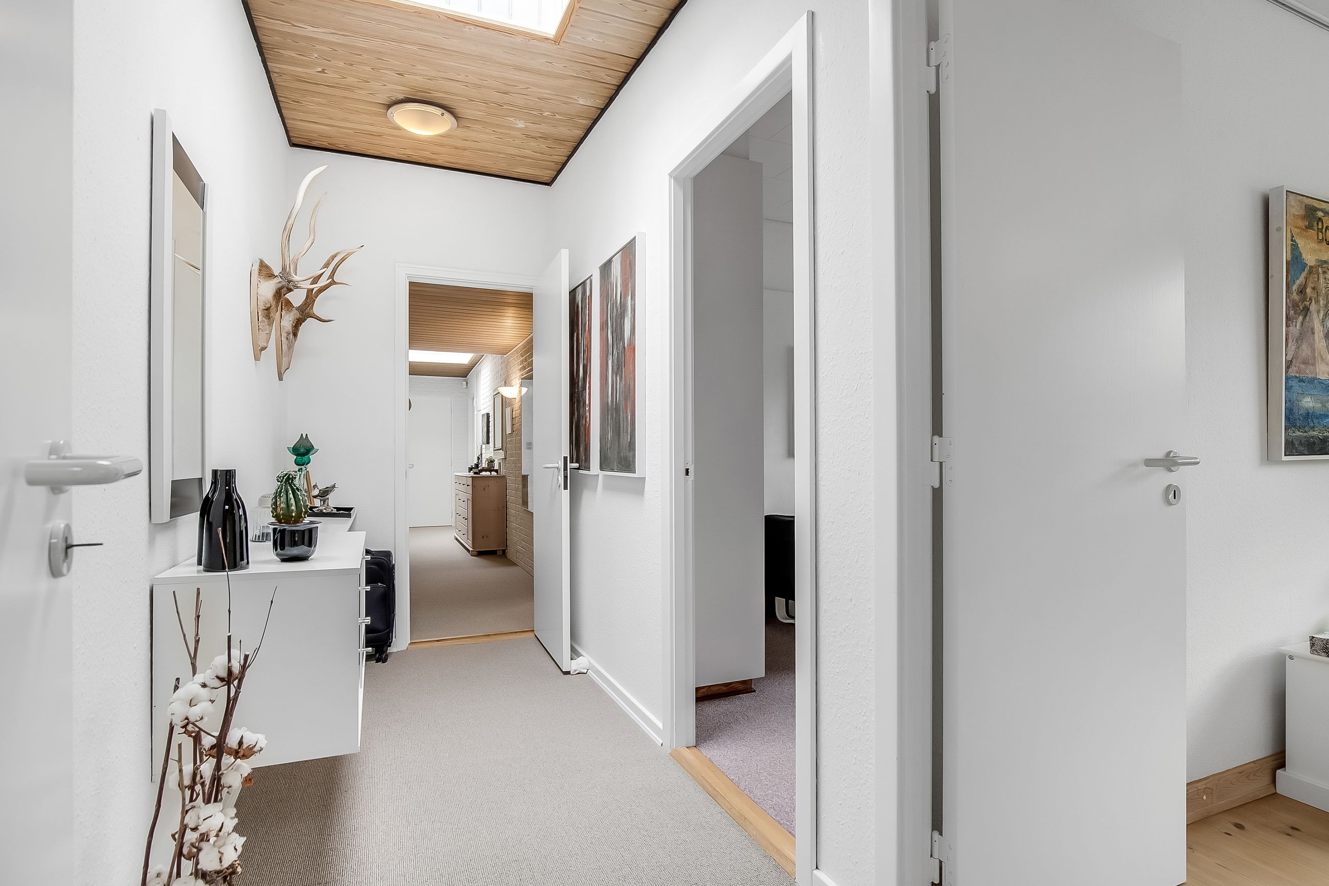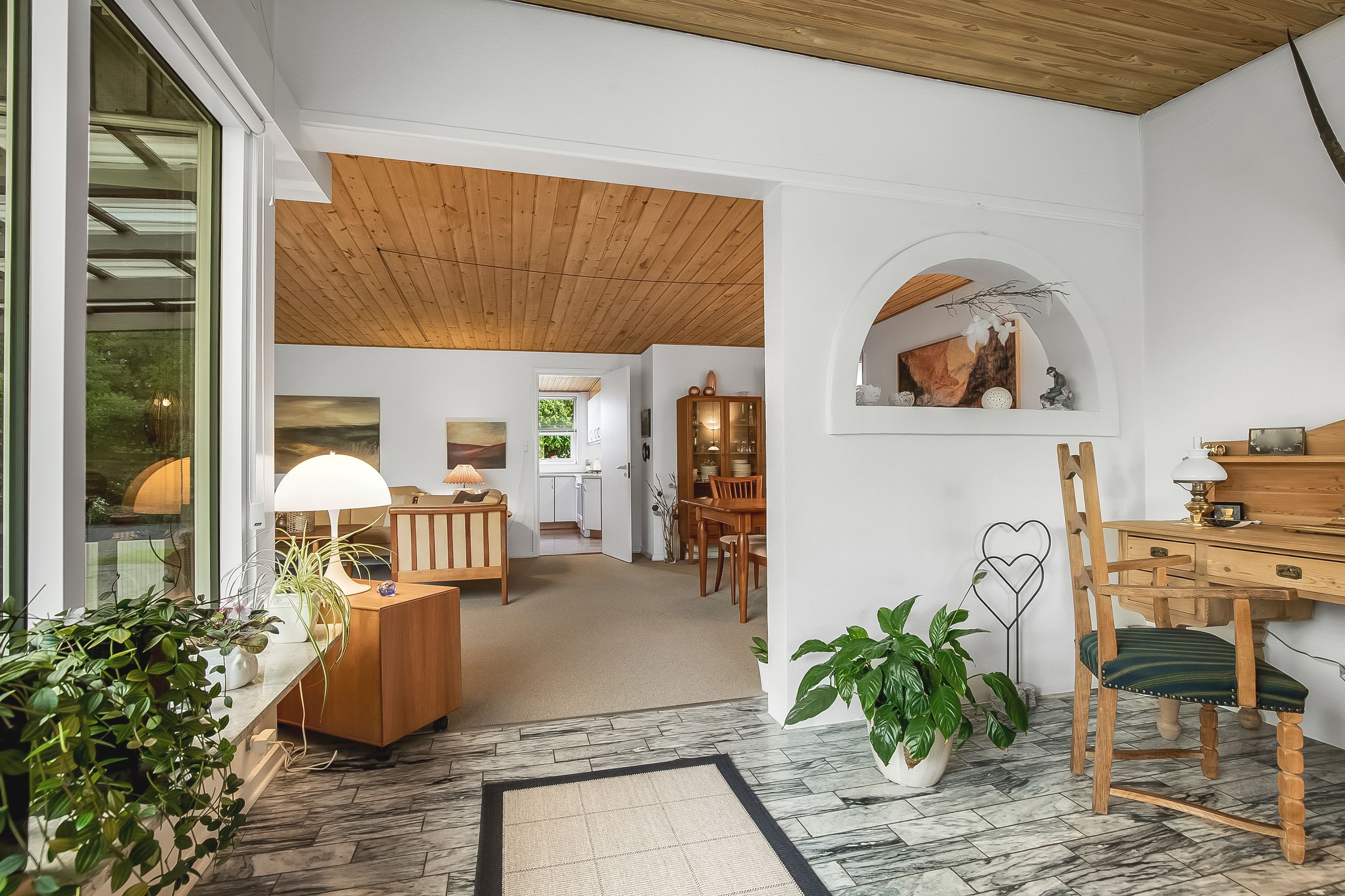 Indretningen består af entre / bryggers i forb. hermed køkken m. spiseplads. Herfra mellemgang i forb. m. entre, bad m. brus samt 2 værelser ( heraf det ene oprindelig opdelt i 2 ). Særskilt sovegang indrettet med værelse, soveværelse samt bad m. brus. Gangarealerne og bad er forsynet med ovenlys. Man oplever således dagslyset overalt i bygningen. Fra køkken og mellemgang adgang til til rummelig spise-/ opholdsstue i åben forbindelse til pejsestue med indsats. Herfra udgang til vestvendt overdækket terrasse.