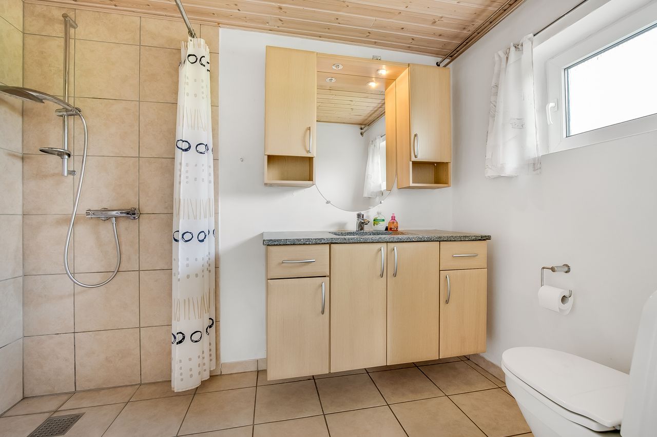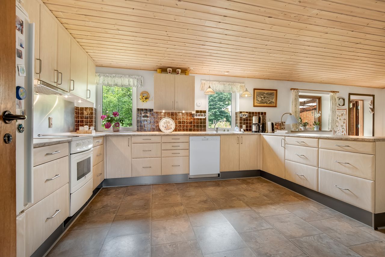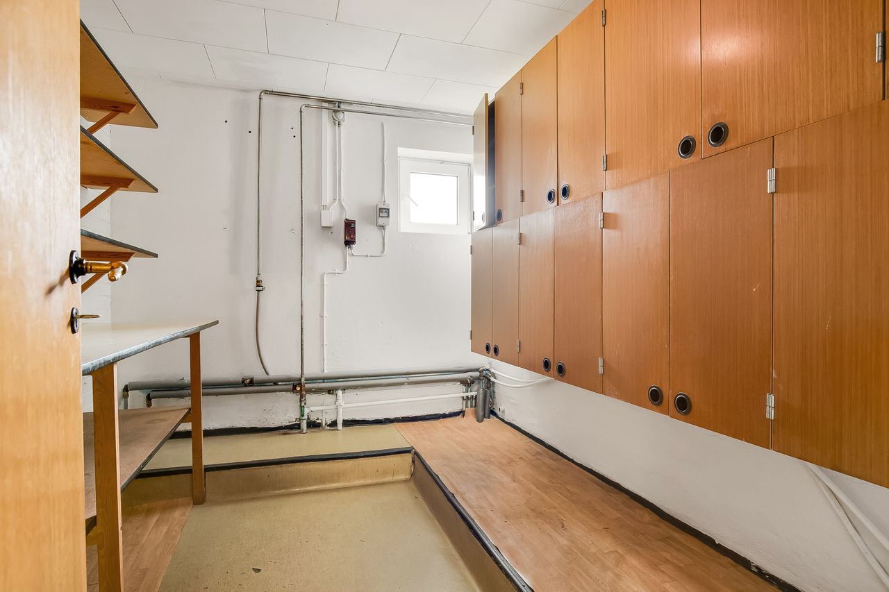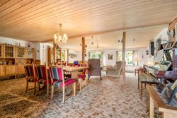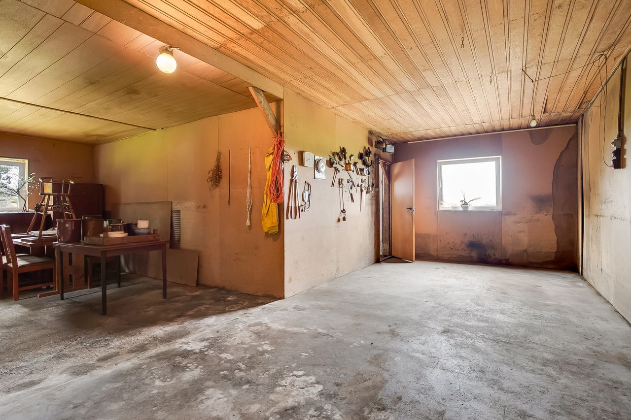 Indretningen består af bryggers / vaskerum i forb. m. 2 værelser og bad m. brus. og meget rummelig køkken alrum i forb. m viktualierum og med udgang til havestue. Meget rummelig spise-/ opholdsstue i forb. m. entre og gæstetoilet / bad samt værelse. Sidefløj med værksted / hobbyrum, stort værelse samt mindre stald og disponibelt rum.