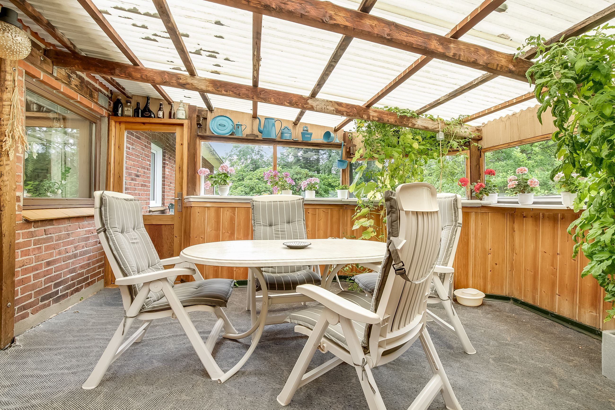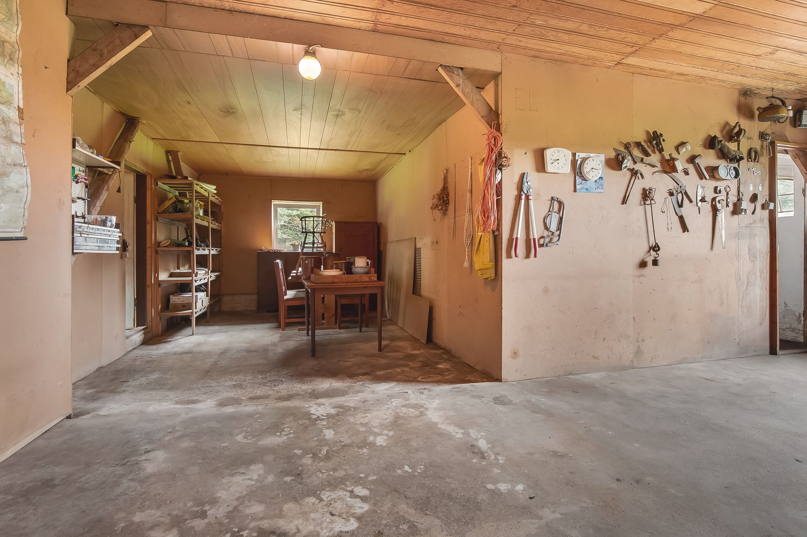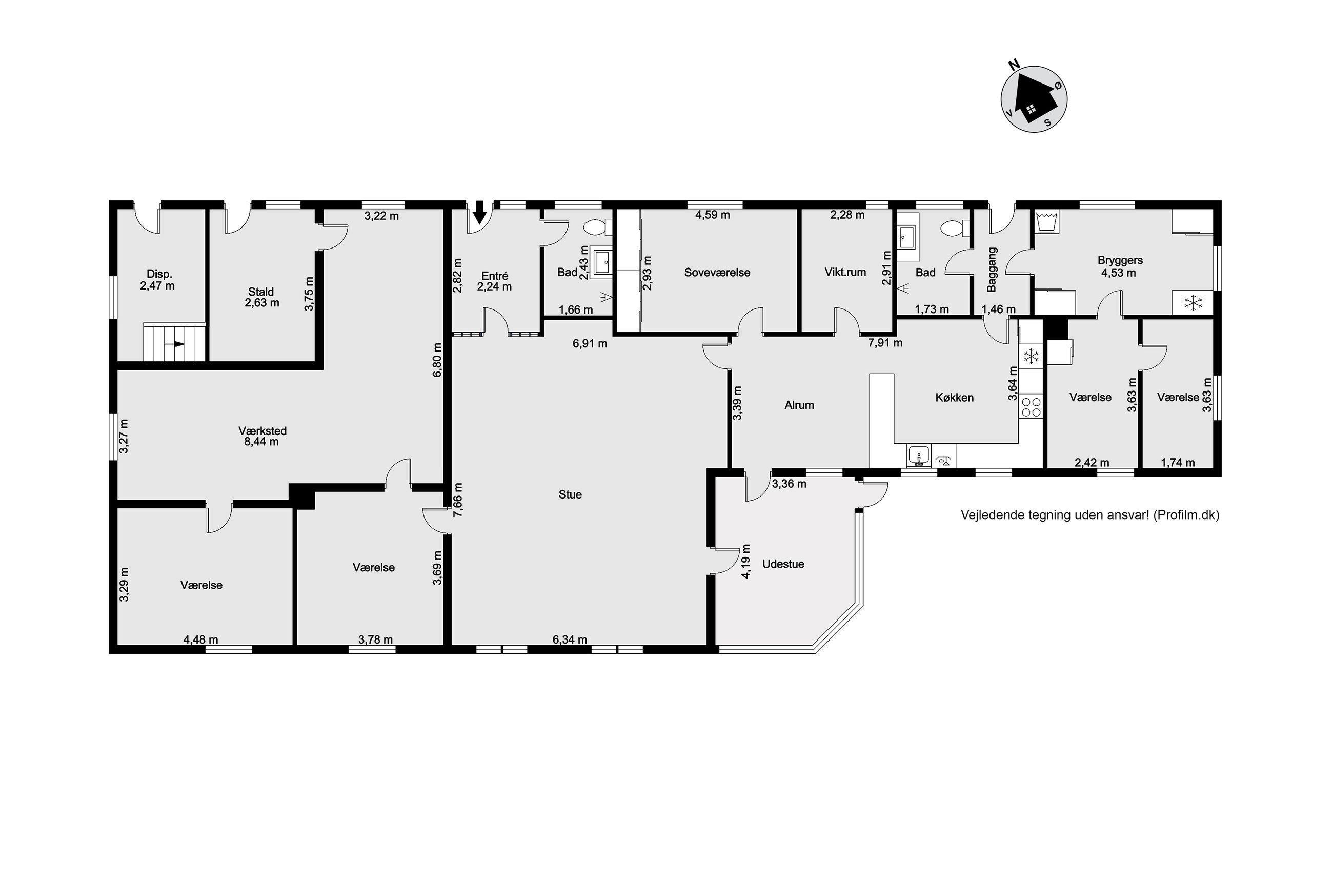 Indretningen består af bryggers / vaskerum i forb. m. 2 værelser og bad m. brus. og meget rummelig køkken alrum i forb. m viktualierum og med udgang til havestue. Meget rummelig spise-/ opholdsstue i forb. m. entre og gæstetoilet / bad samt værelse. Sidefløj med værksted / hobbyrum, stort værelse samt mindre stald og disponibelt rum.