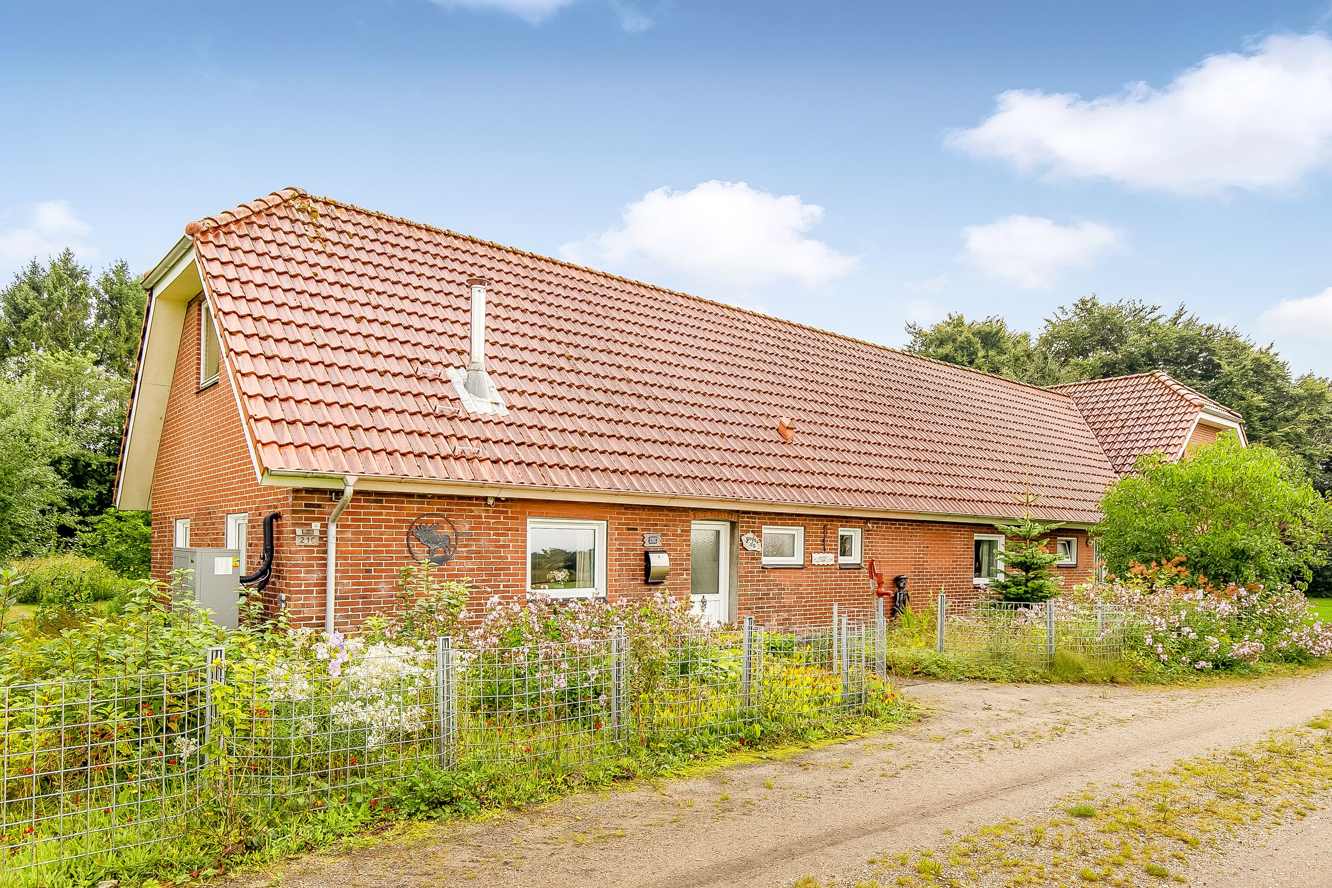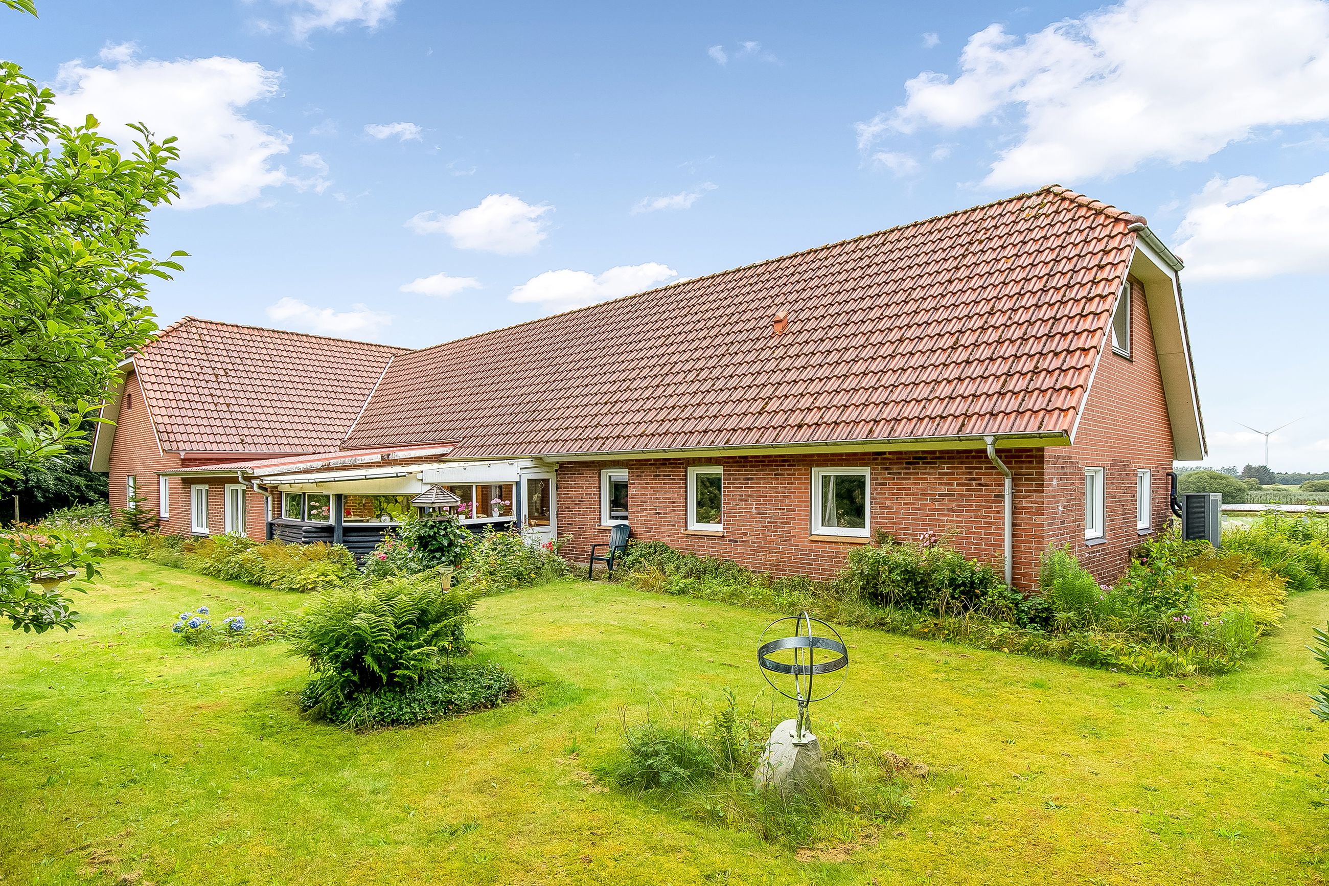 Velholdt landbolig bestående af stærke rødstensbygninger med tag af betontegl.