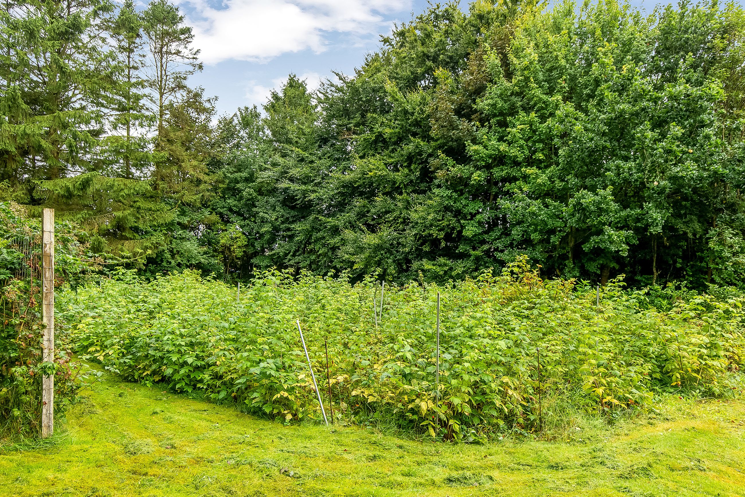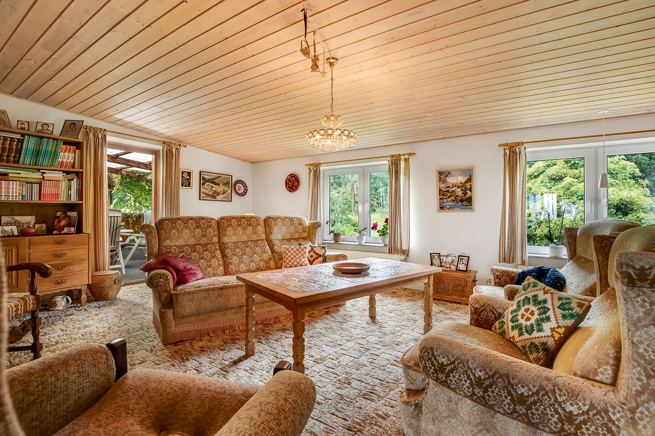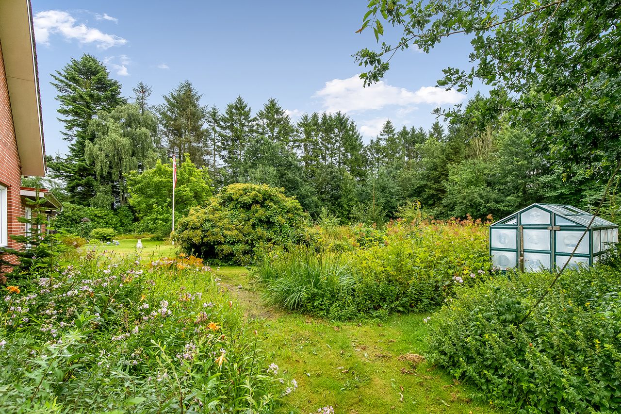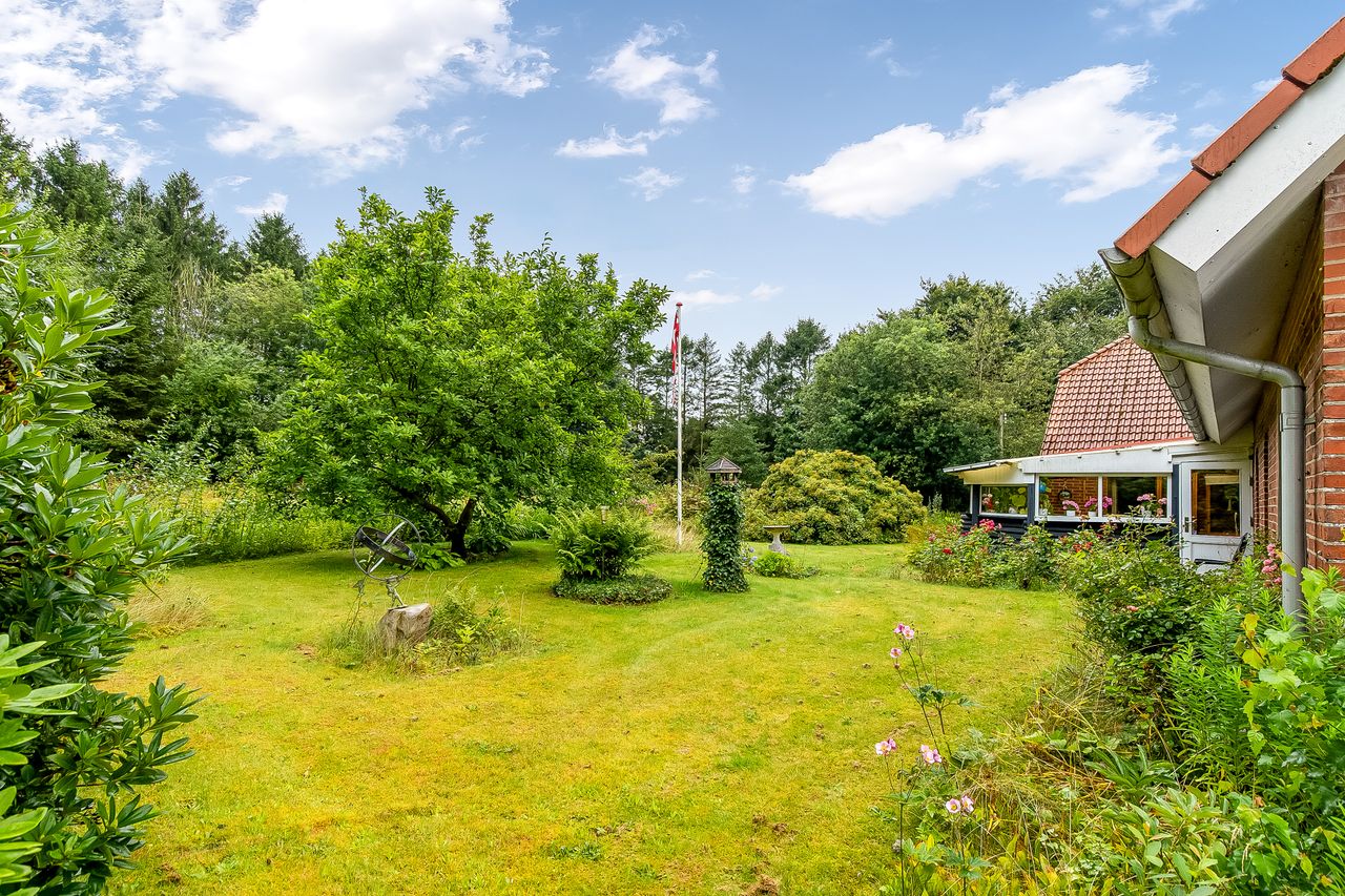 Ejendommen er beliggende passende behagelig tilbagetrukket fra offentlig vej og man færdes ugeneret i læfulde omgivelser med samtidig mulighed for aktiviteter på den 9653 m2 store naturgrund med varierende bevoksning