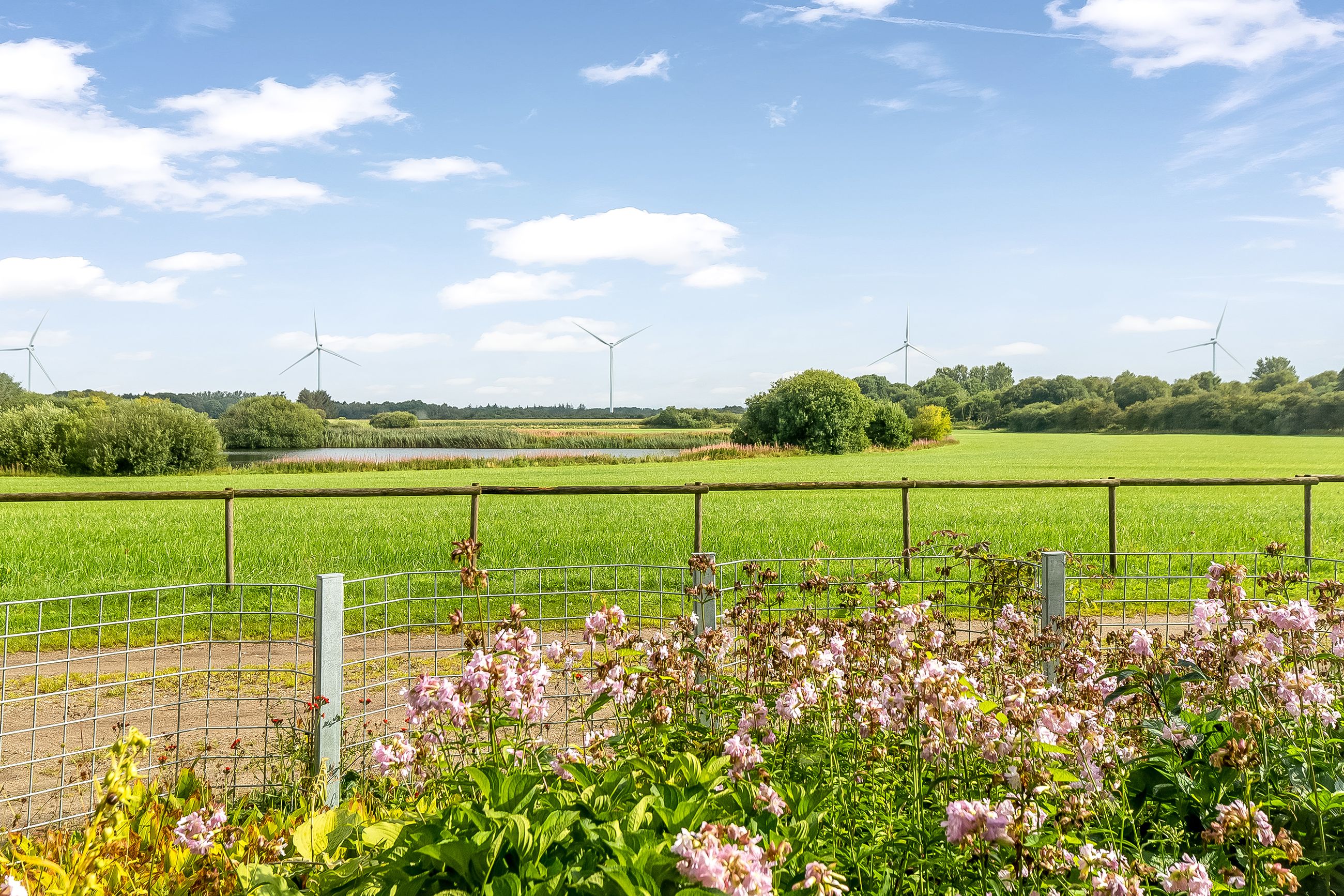 Fra ejendommen udsigt over omgivelserne med bl.a. søanlæg.