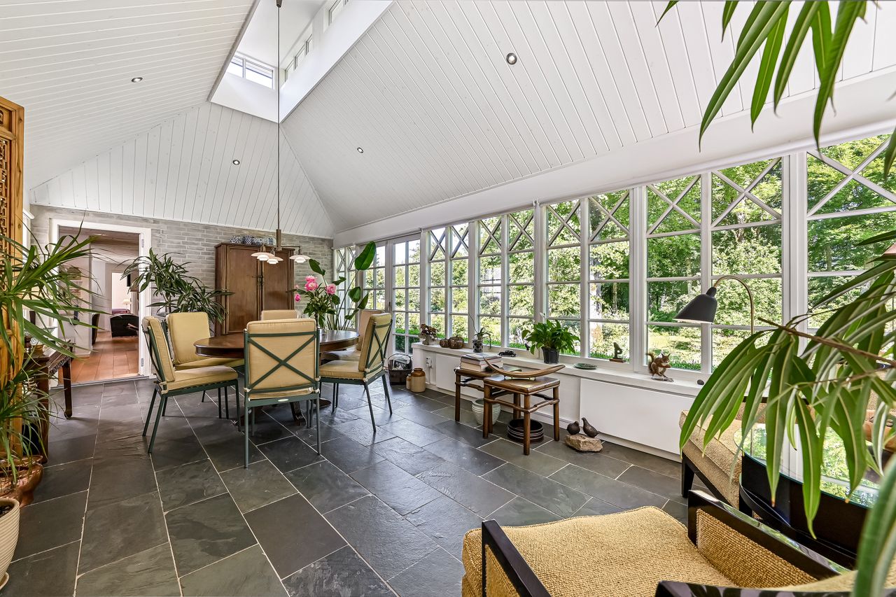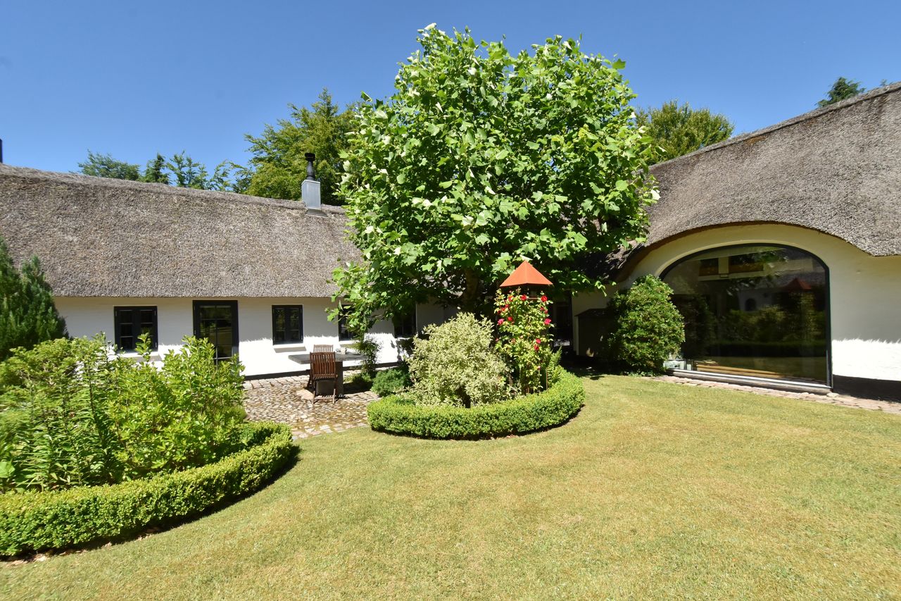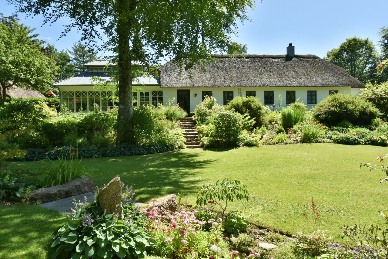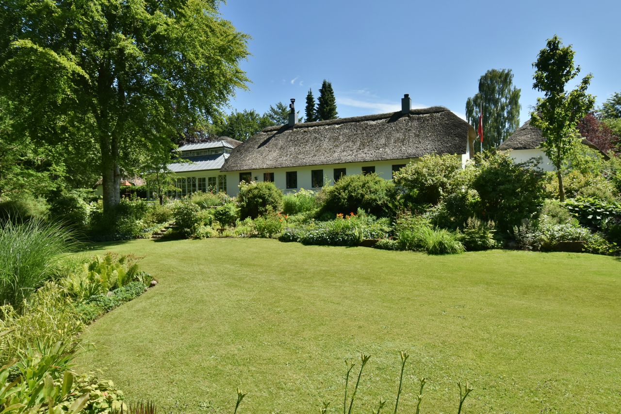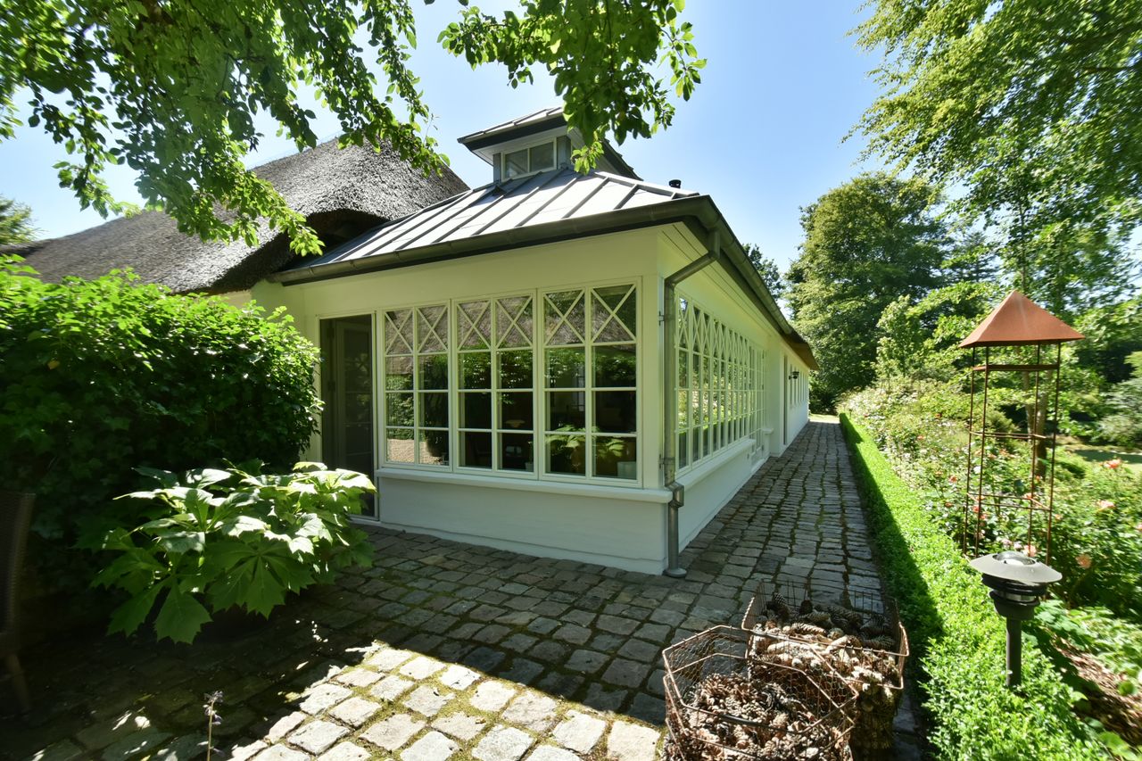 De 2 længer med bolig er smukt forbundet gennem den flotte charmerende havestue, der giver en direkte forbindelse til den naturskønne parklignende have med mange spændende og sjældne træer og buske. I samme forbindelse er boligen moderniseret med et stilfuldt HTH køkken fra 2014.