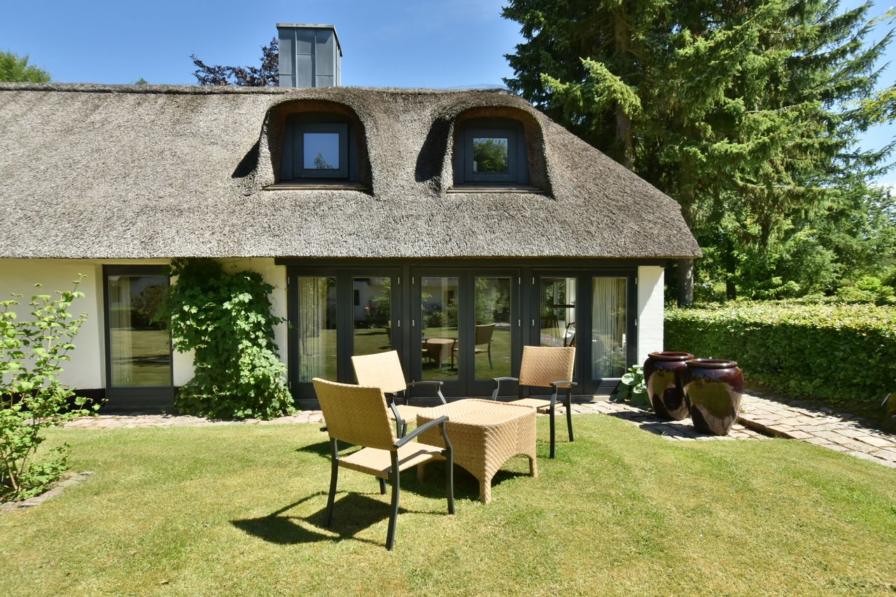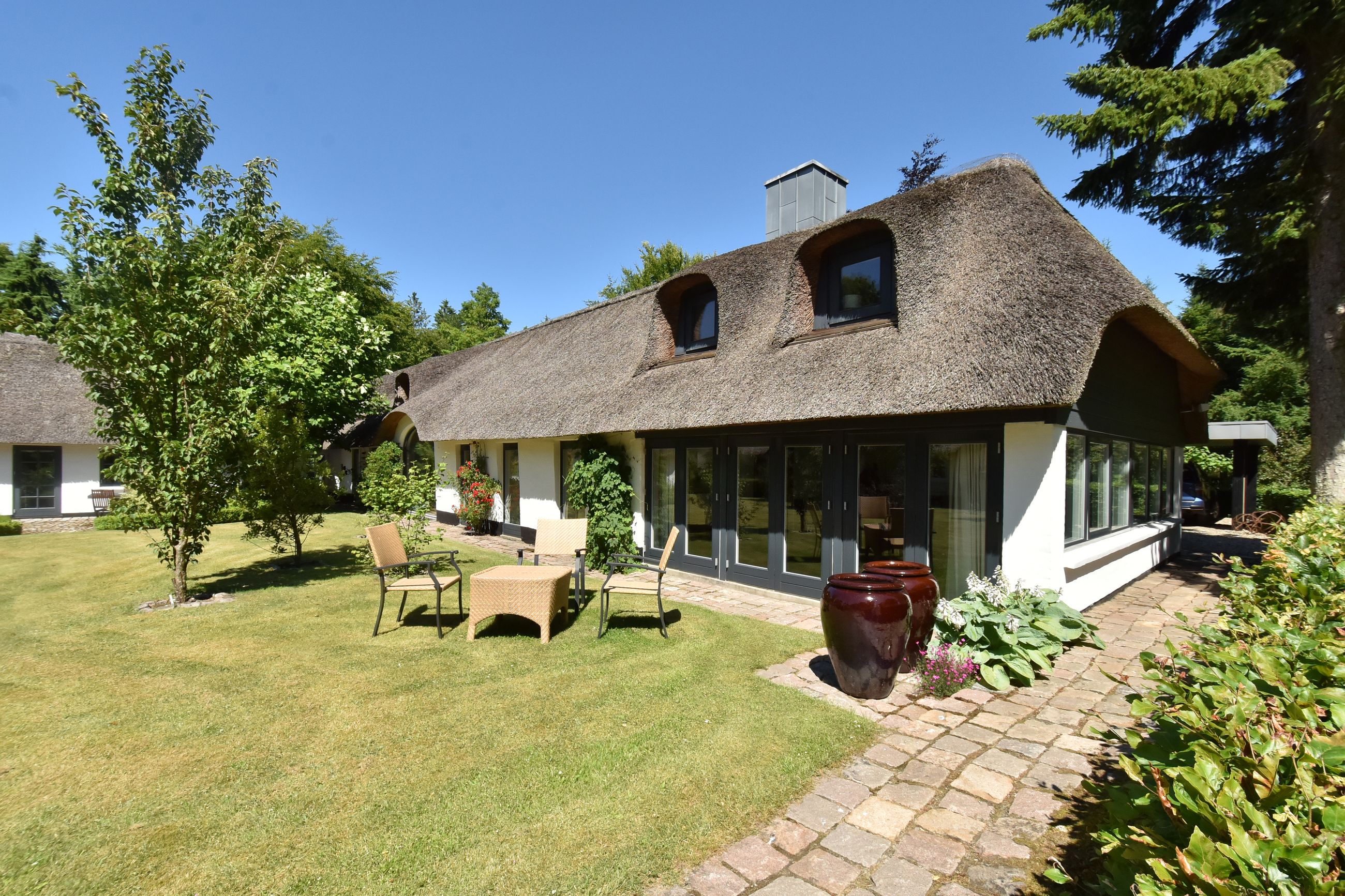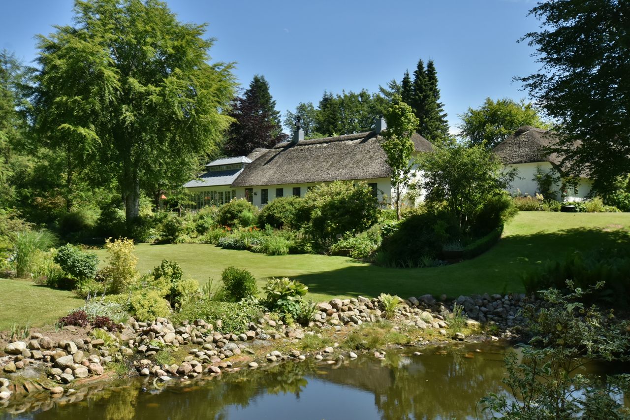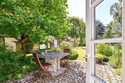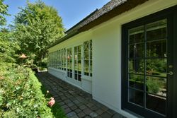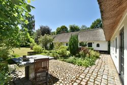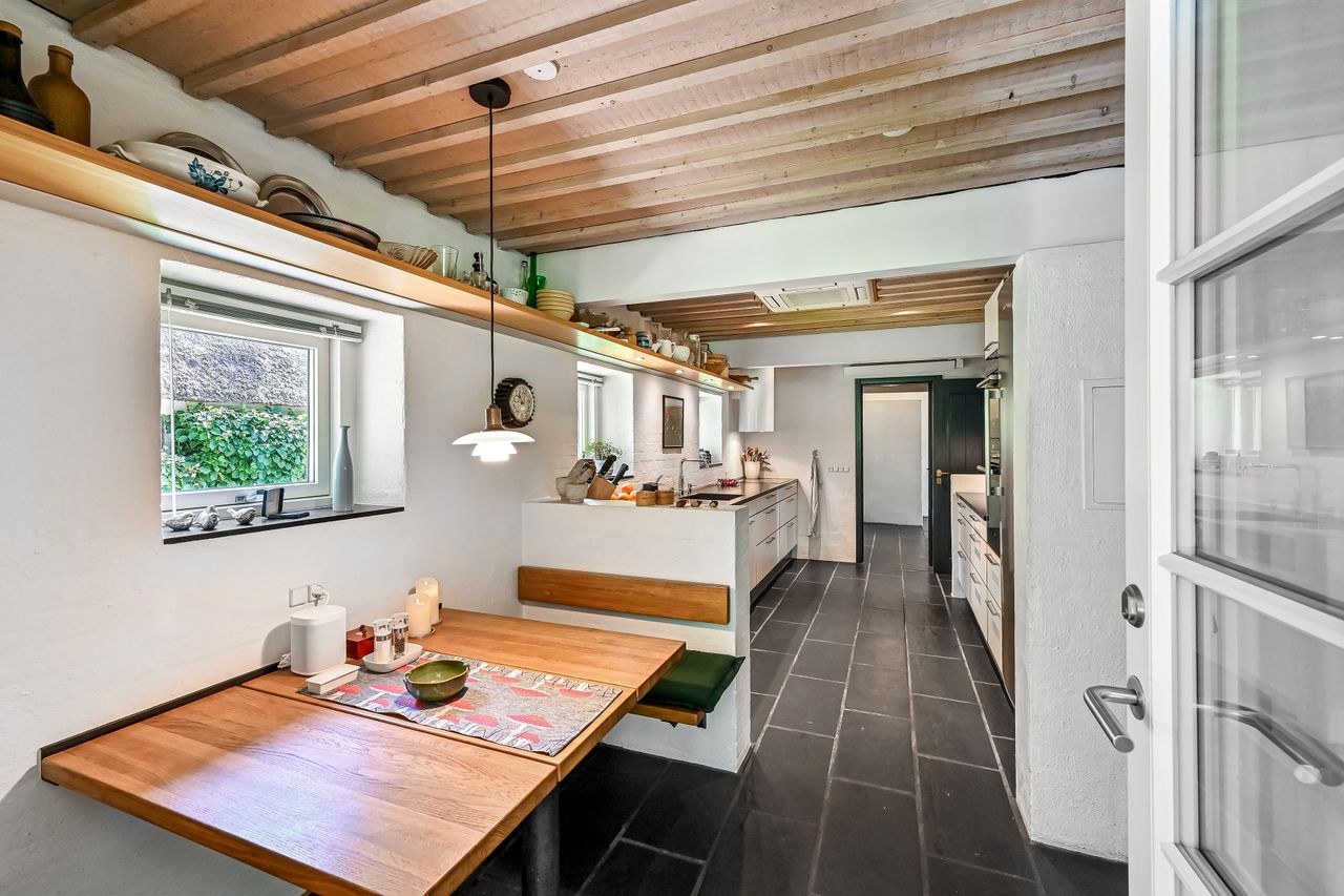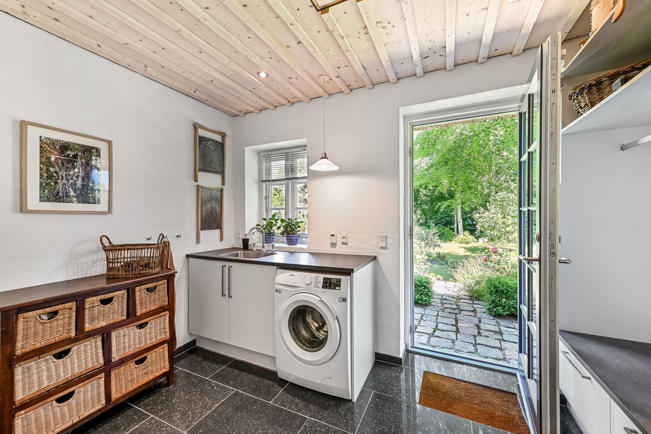 De 2 længer med bolig er smukt forbundet gennem den flotte charmerende havestue, der giver en direkte forbindelse til den naturskønne parklignende have med mange spændende og sjældne træer og buske. I samme forbindelse er boligen moderniseret med et stilfuldt HTH køkken fra 2014.