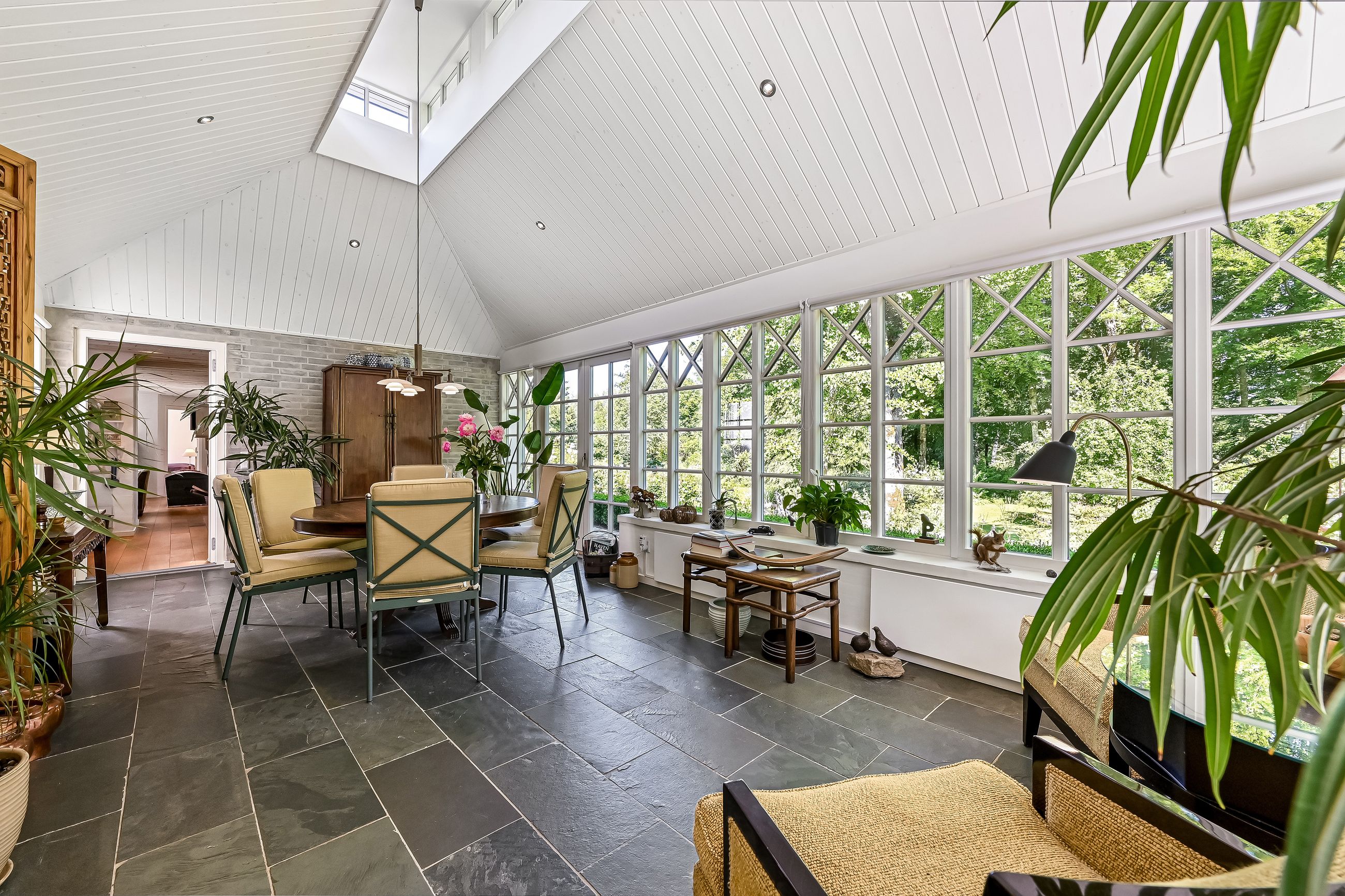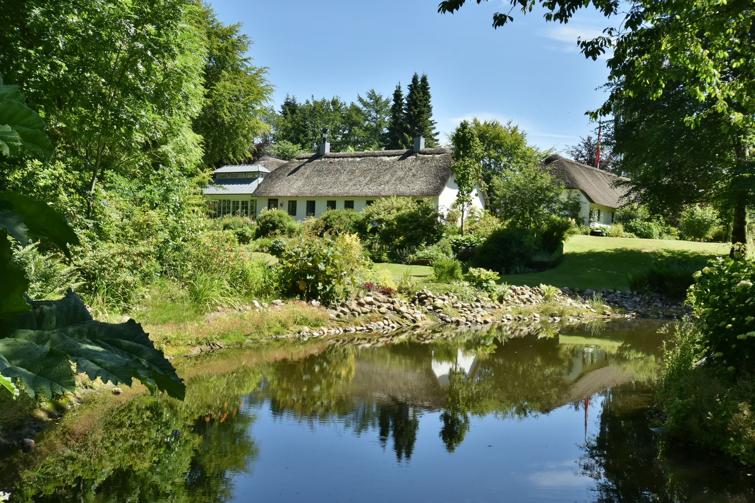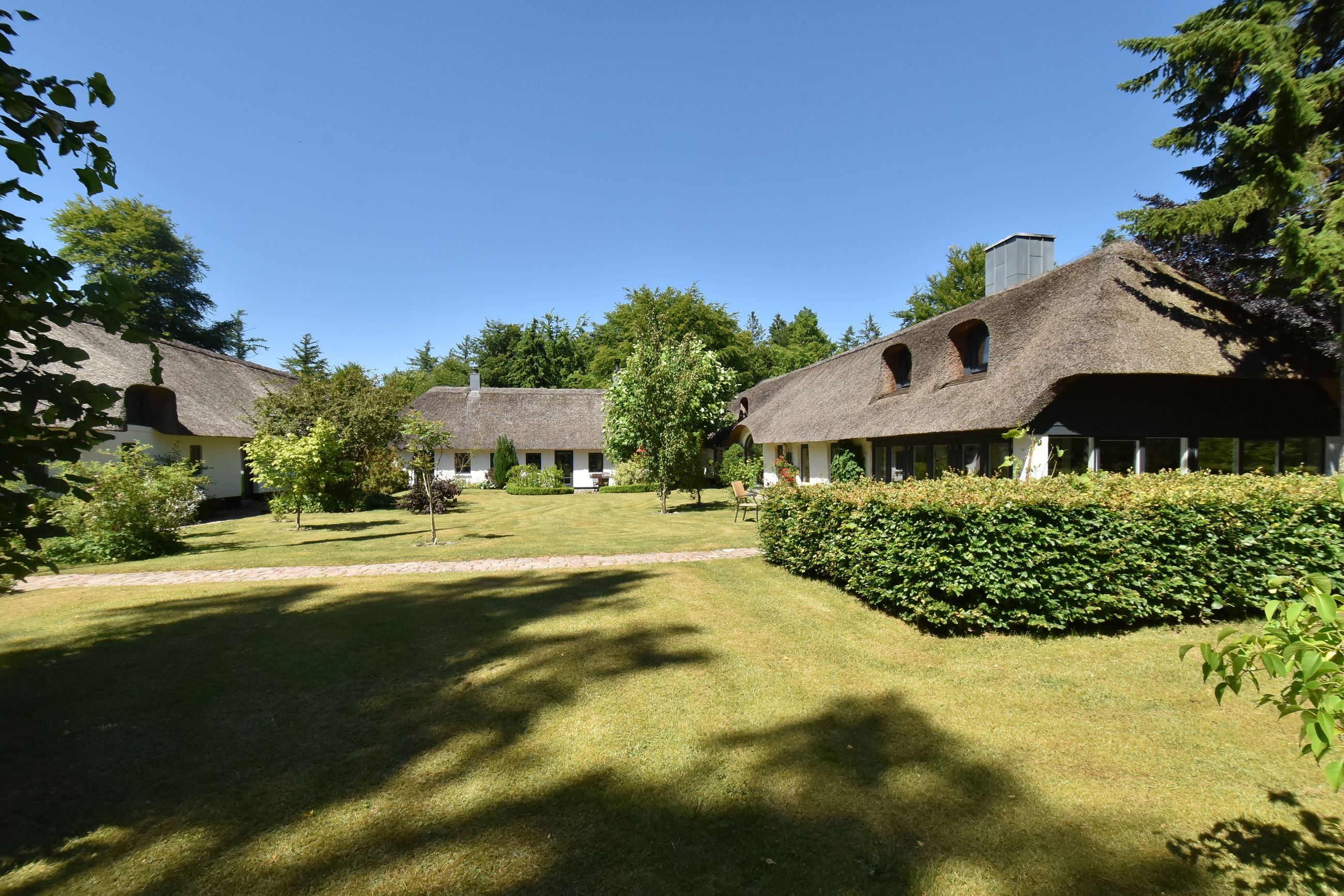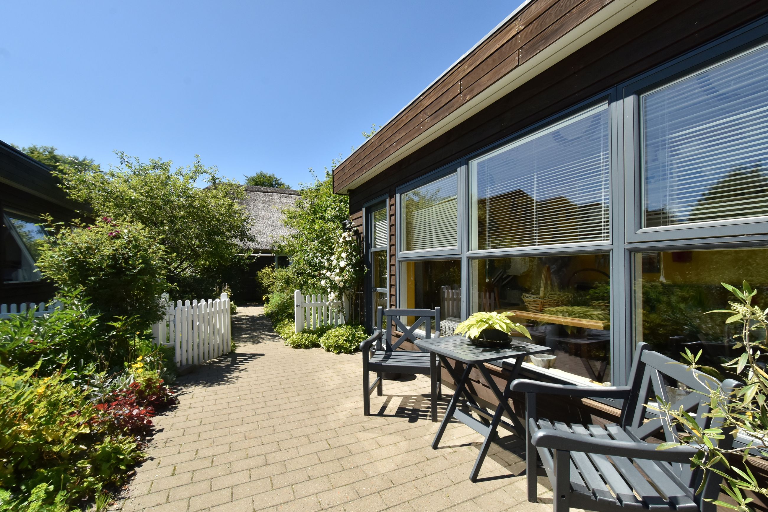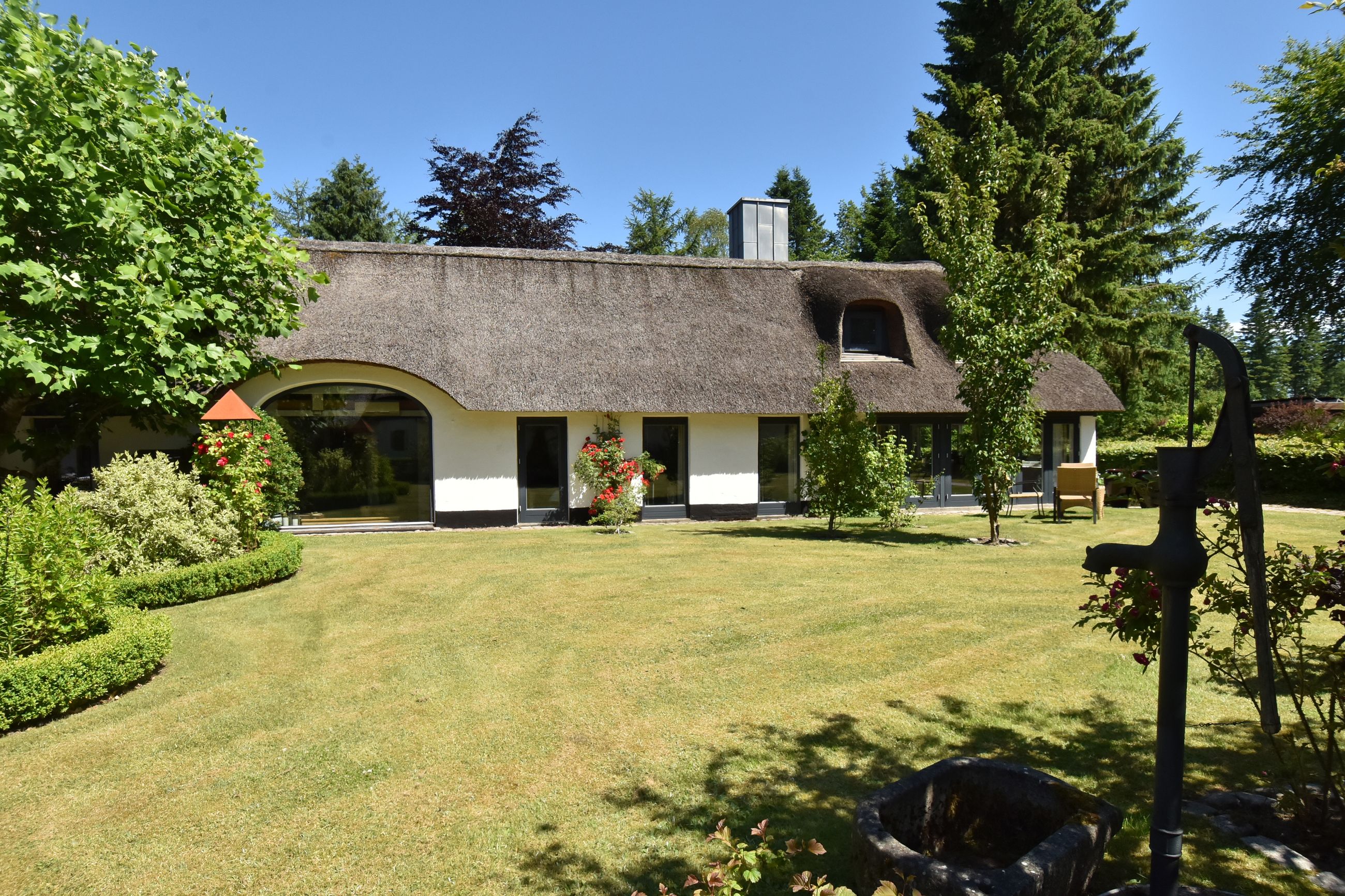 De 2 længer med bolig er smukt forbundet gennem den flotte charmerende havestue, der giver en direkte forbindelse til den naturskønne parklignende have med mange spændende og sjældne træer og buske. I samme forbindelse er boligen moderniseret med et stilfuldt HTH køkken fra 2014.