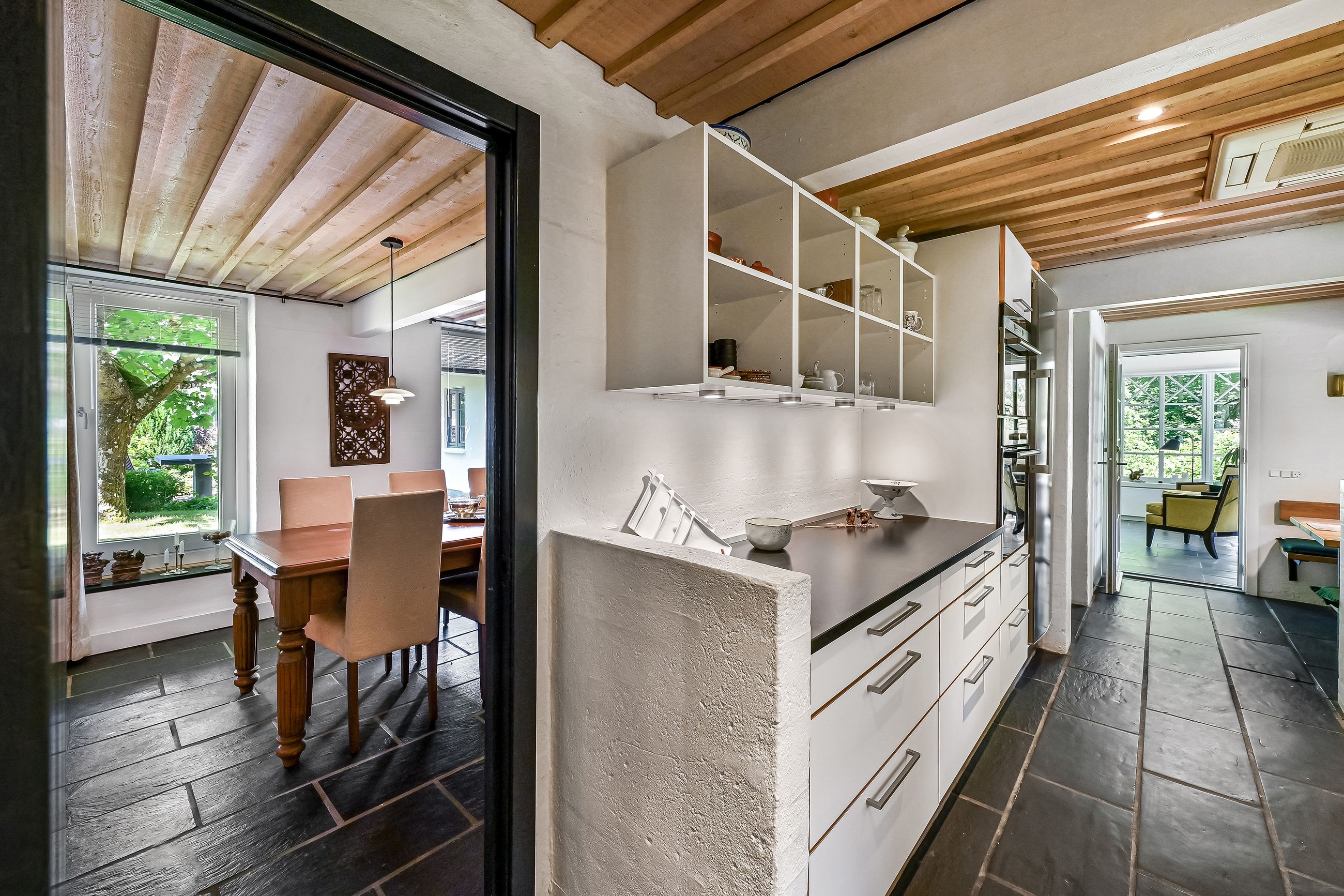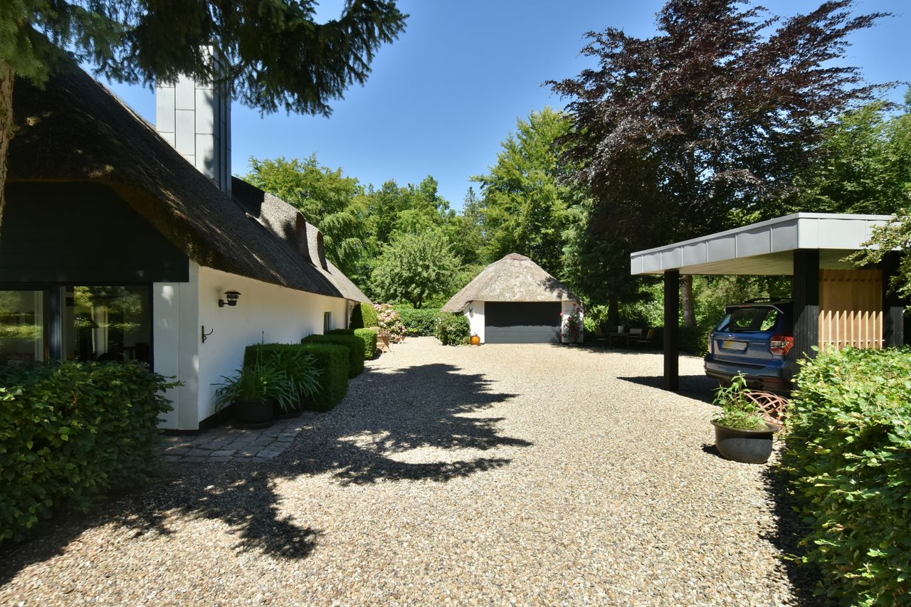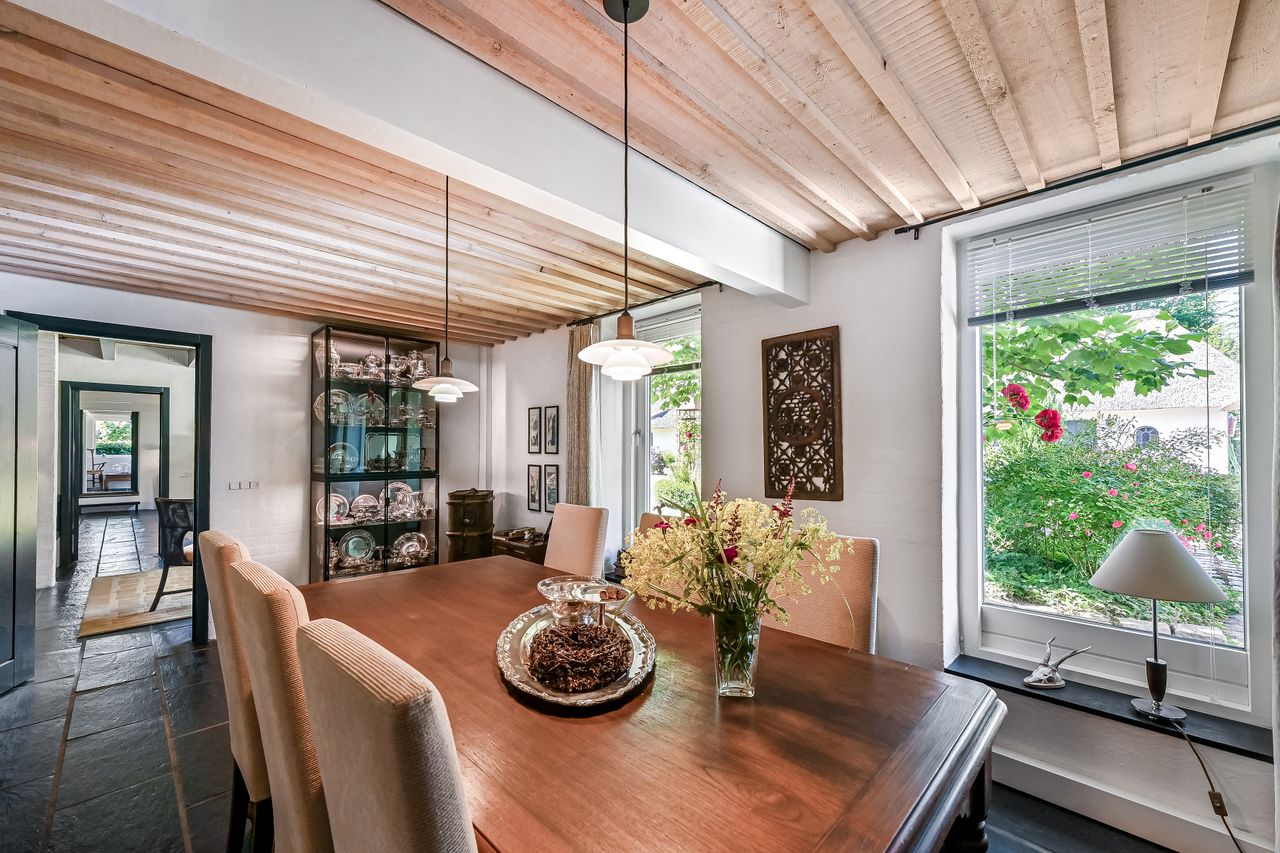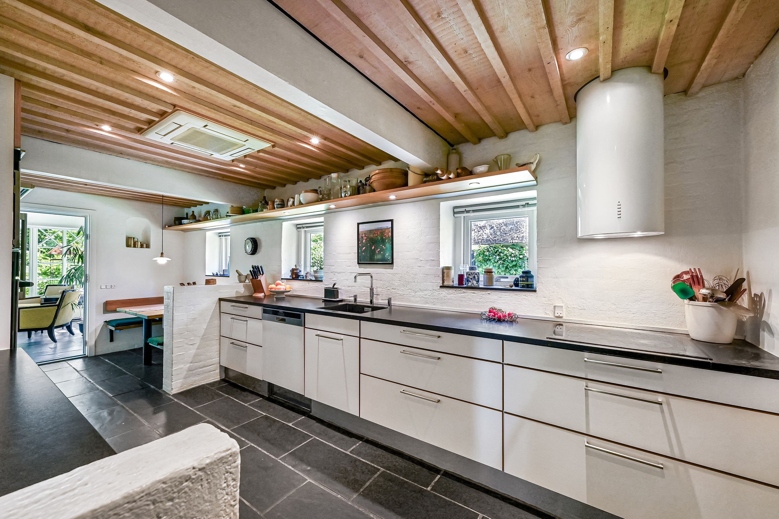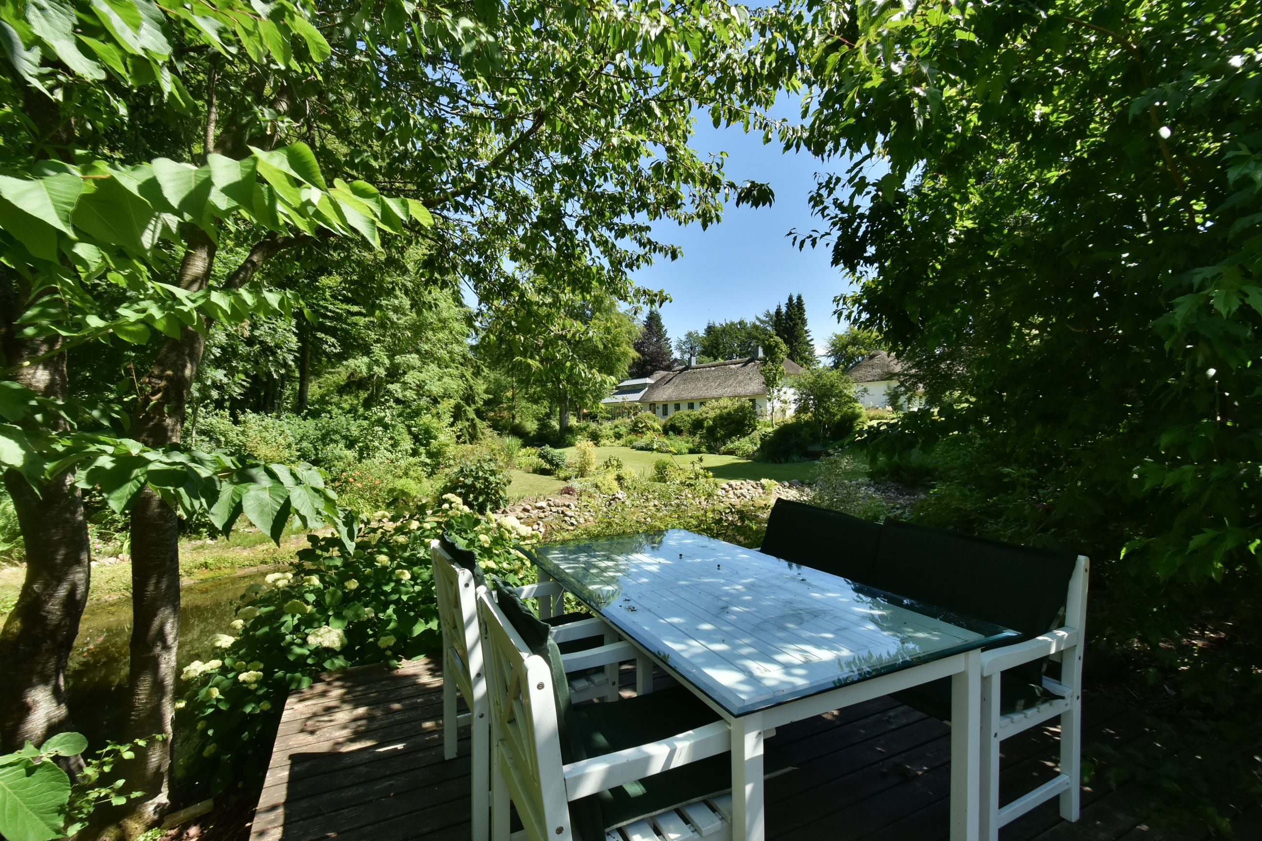 De 2 længer med bolig er smukt forbundet gennem den flotte charmerende havestue, der giver en direkte forbindelse til den naturskønne parklignende have med mange spændende og sjældne træer og buske. I samme forbindelse er boligen moderniseret med et stilfuldt HTH køkken fra 2014.