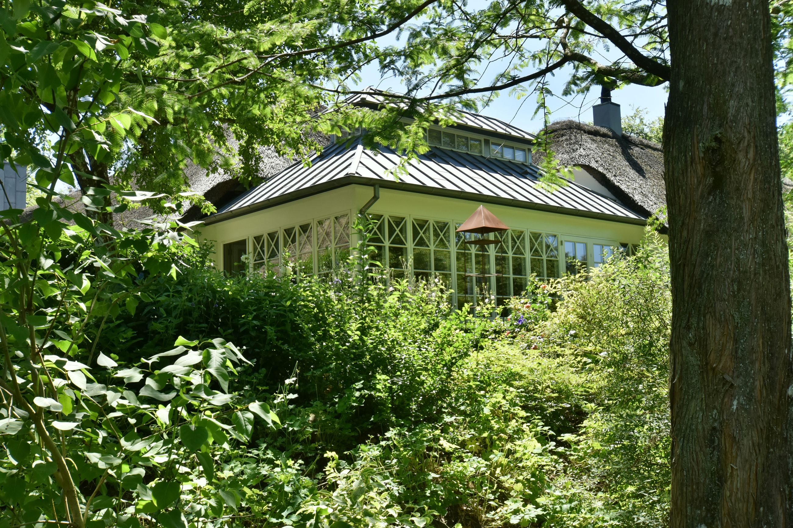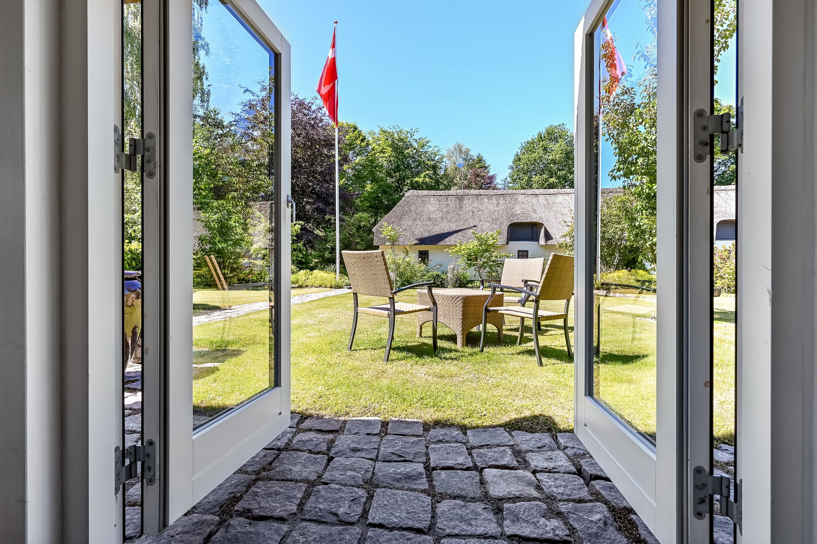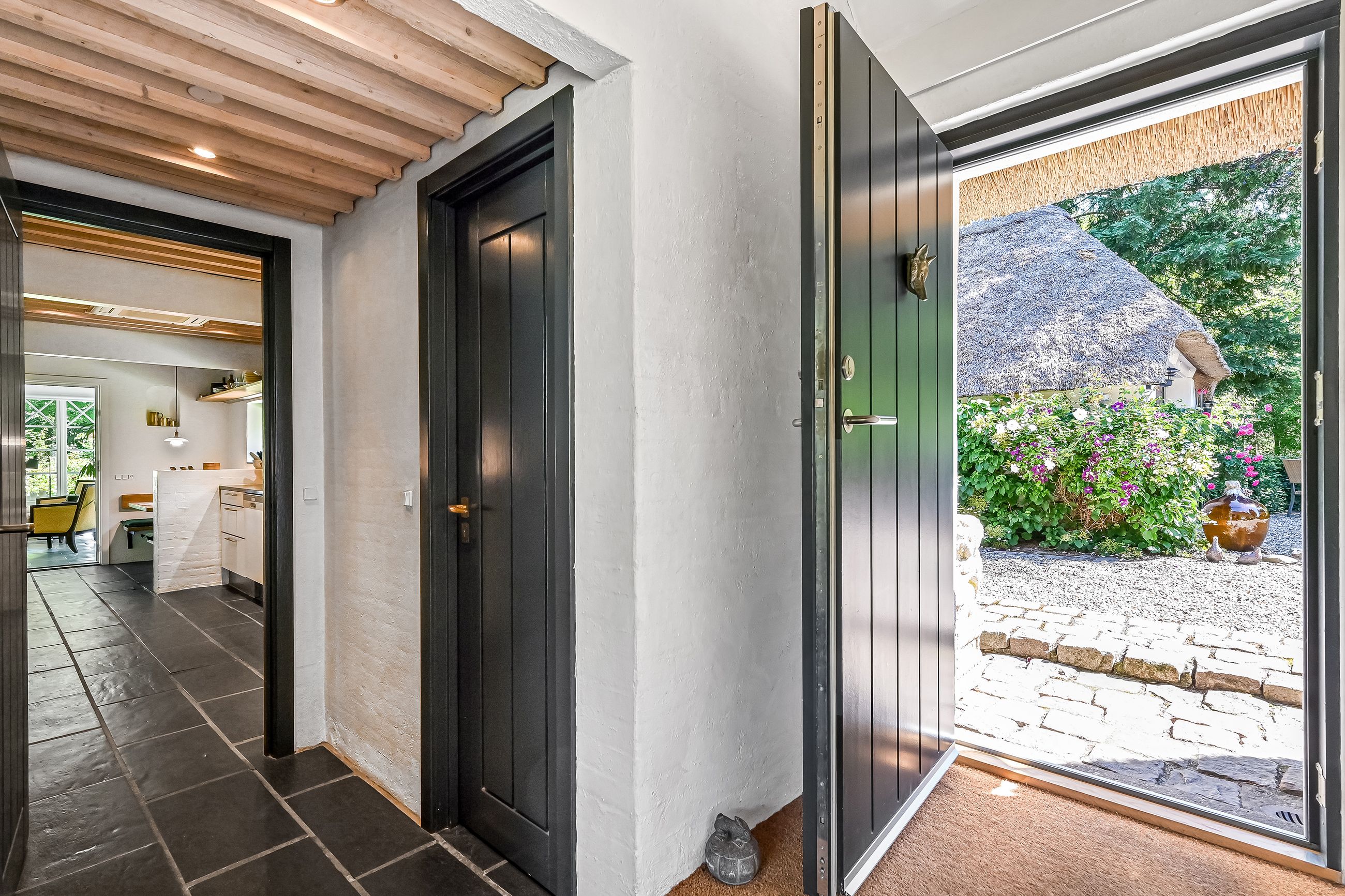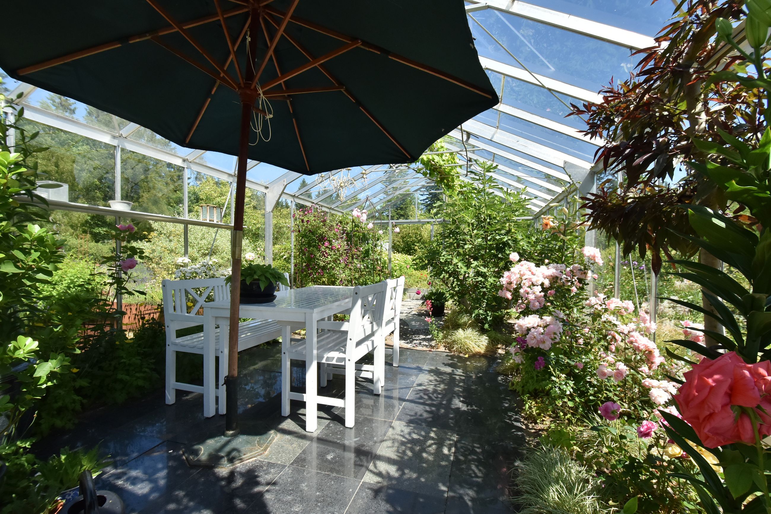 De 2 længer med bolig er smukt forbundet gennem den flotte charmerende havestue, der giver en direkte forbindelse til den naturskønne parklignende have med mange spændende og sjældne træer og buske. I samme forbindelse er boligen moderniseret med et stilfuldt HTH køkken fra 2014.