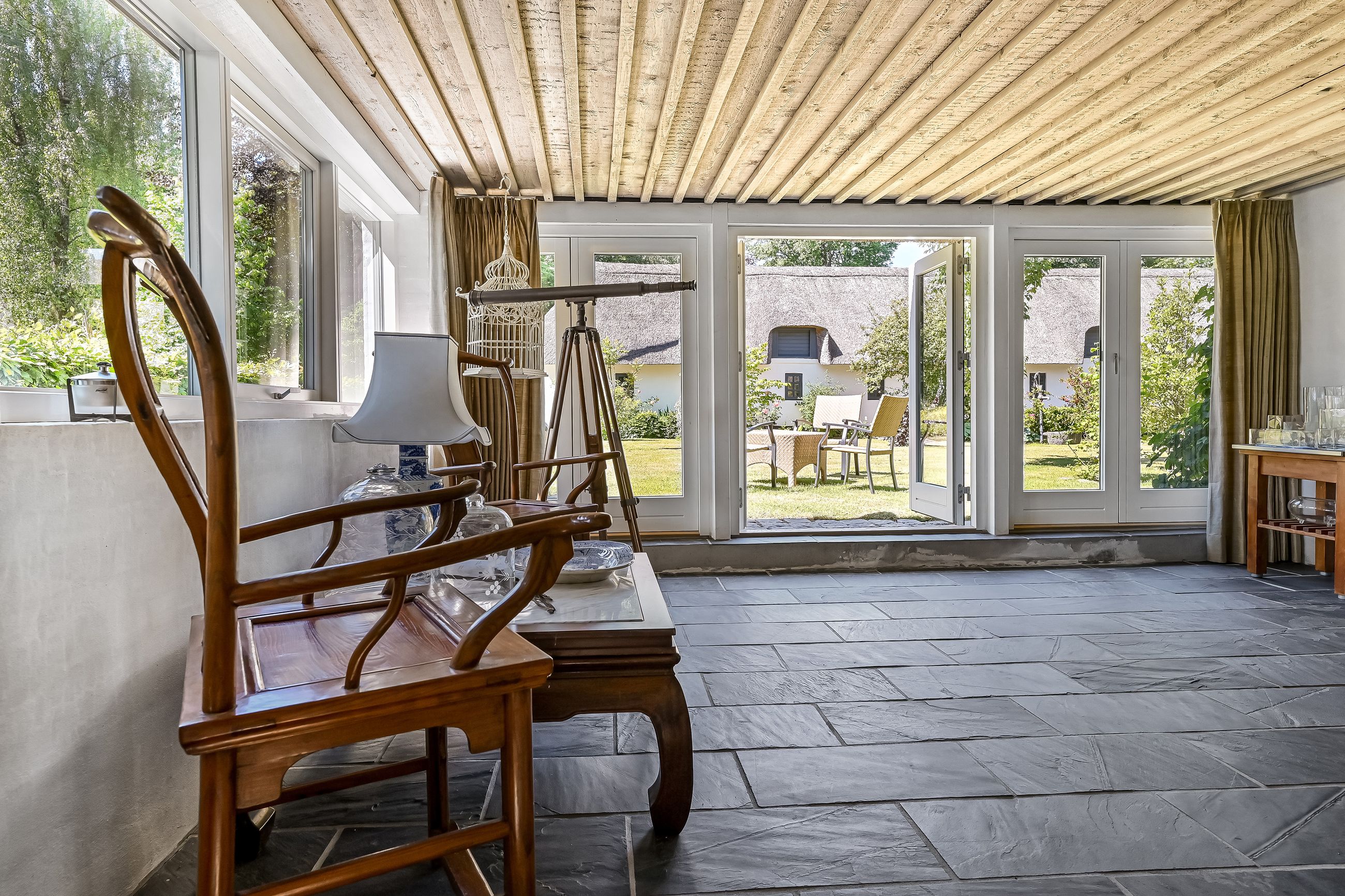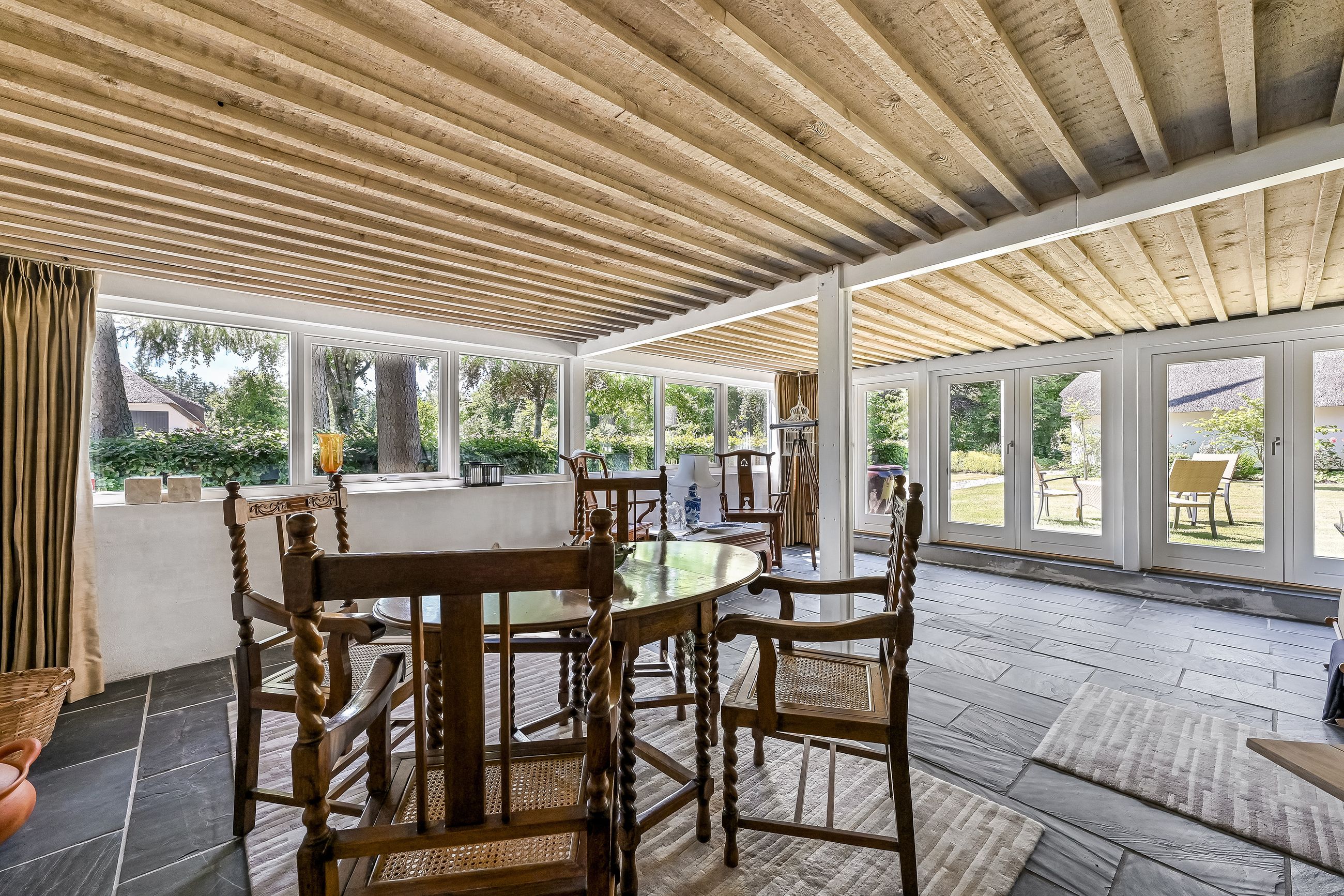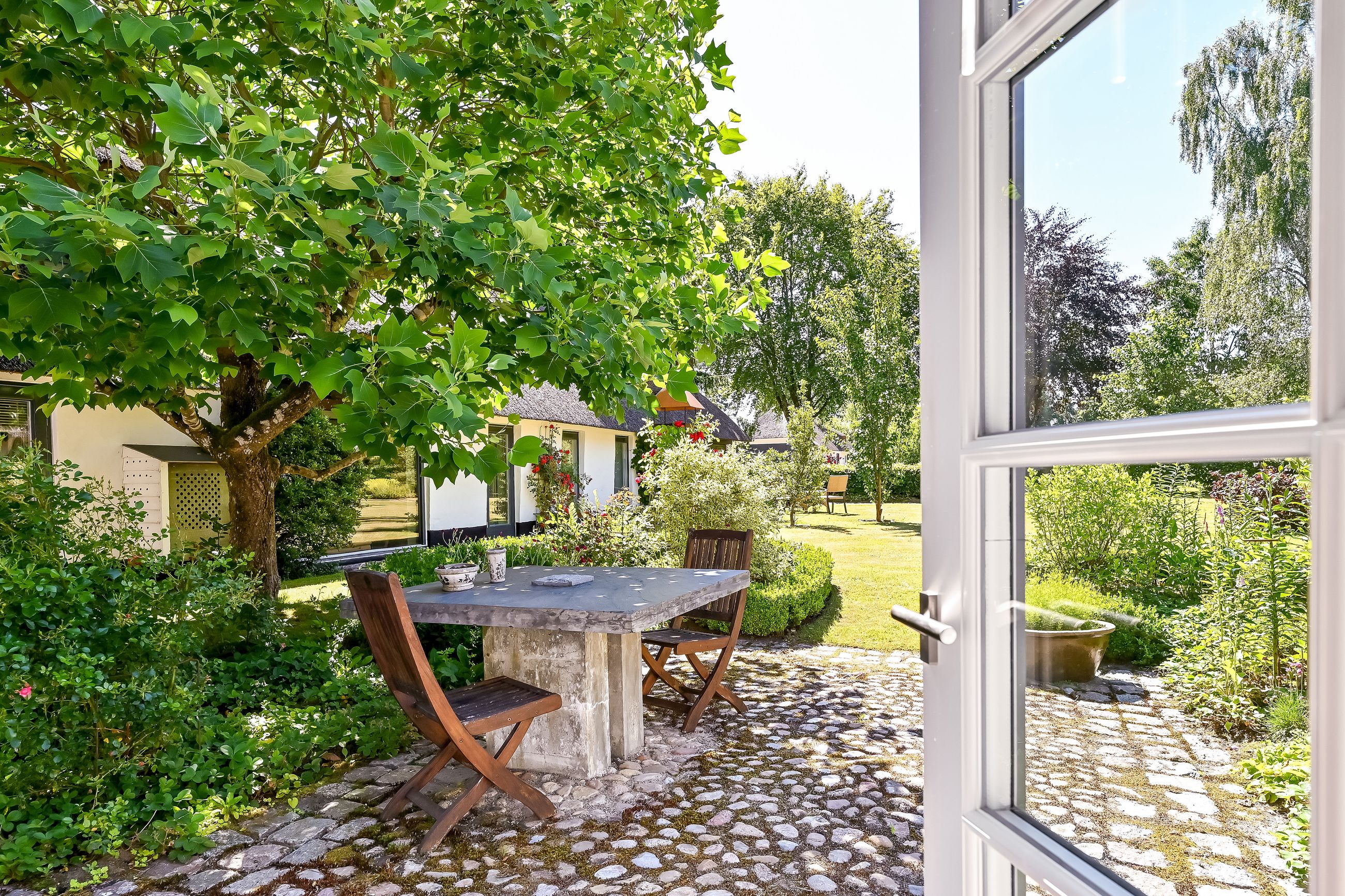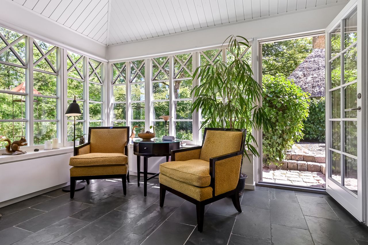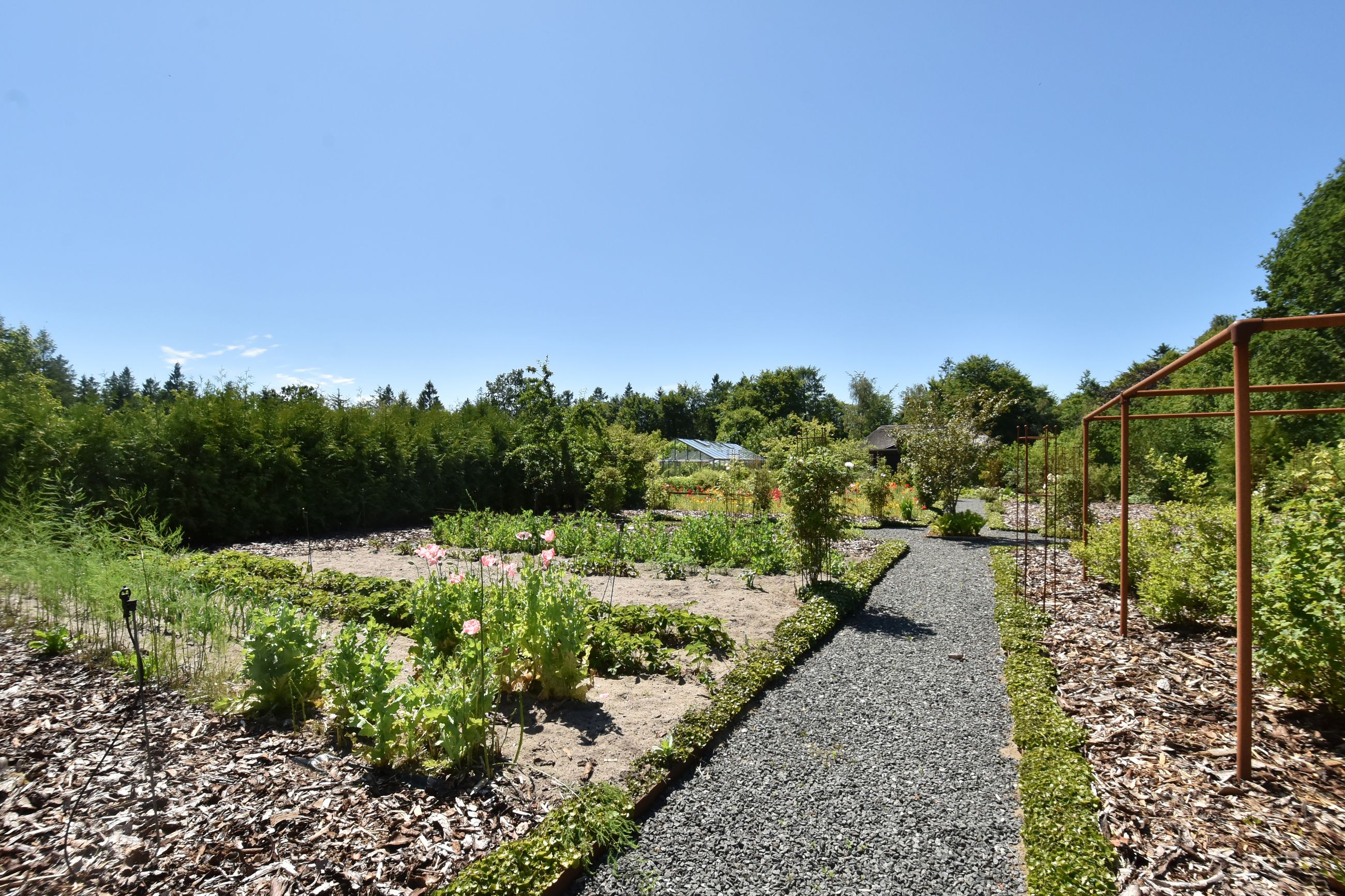De 2 længer med bolig er smukt forbundet gennem den flotte charmerende havestue, der giver en direkte forbindelse til den naturskønne parklignende have med mange spændende og sjældne træer og buske. I samme forbindelse er boligen moderniseret med et stilfuldt HTH køkken fra 2014.