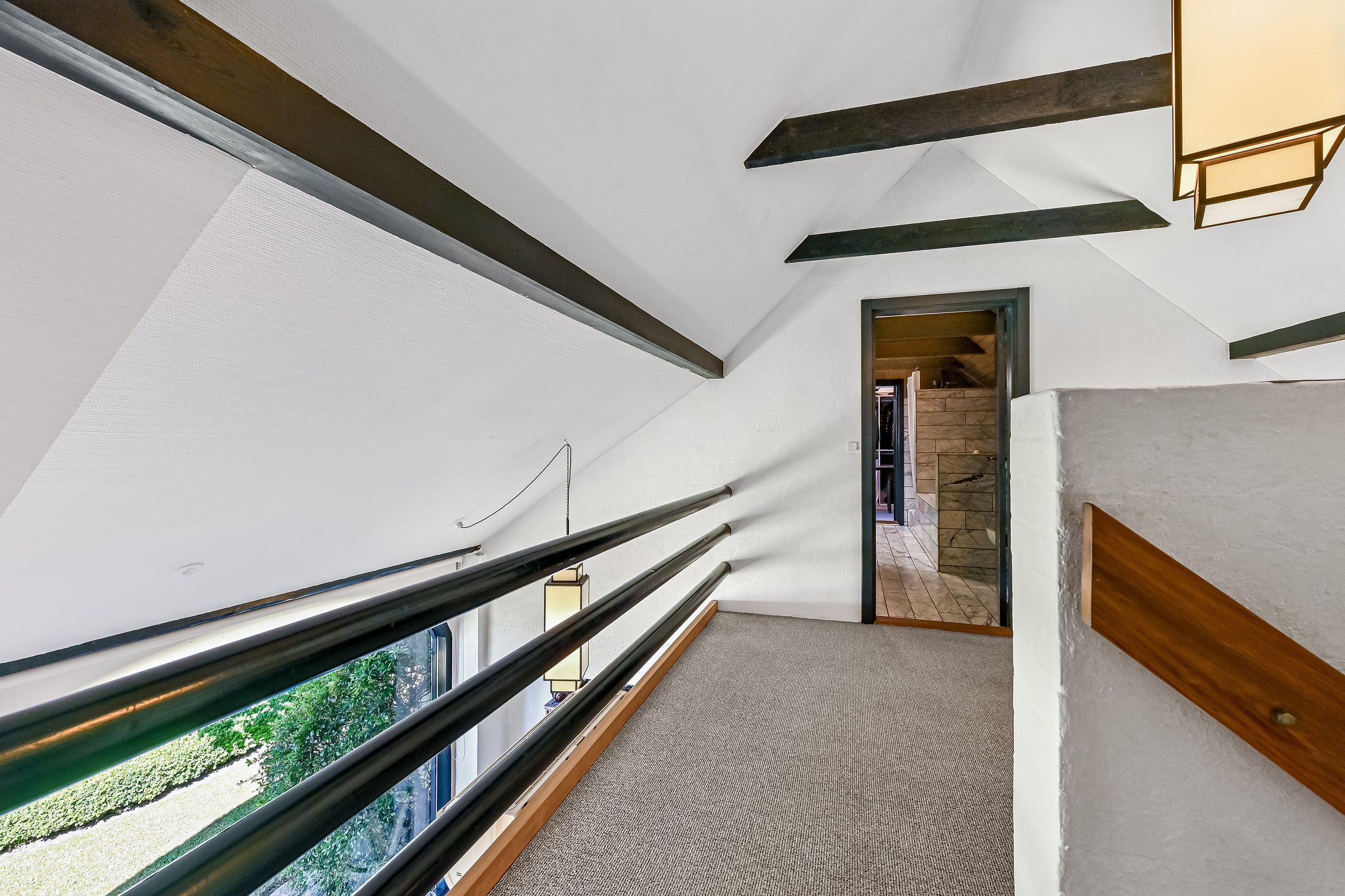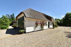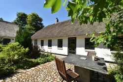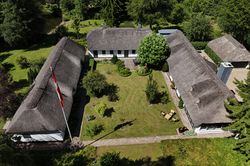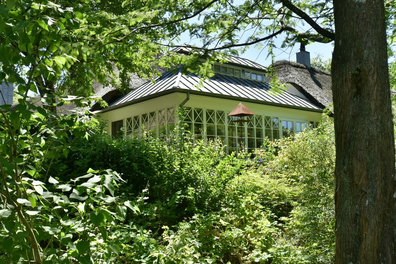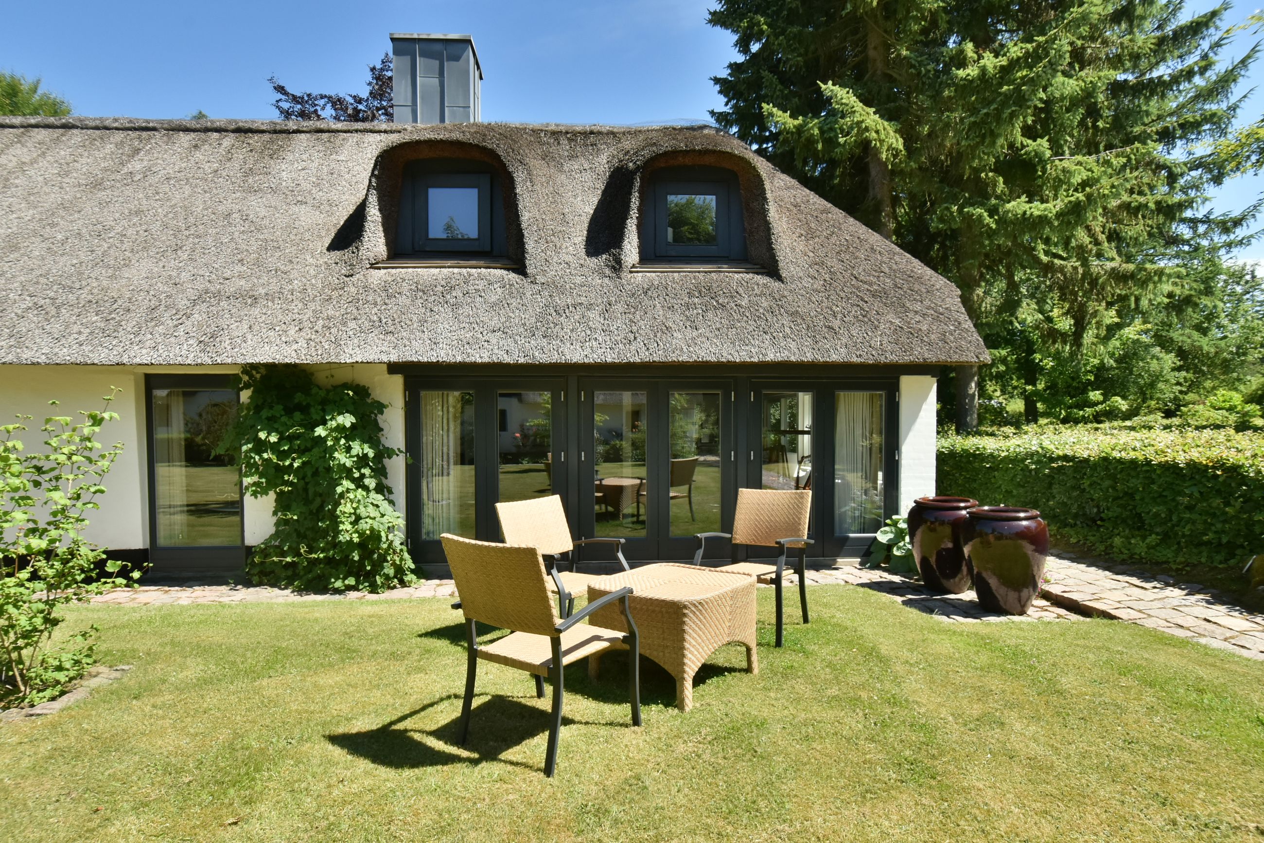 Udvendigt fremstår bygningerne med stråtag fra hhv. 2004 og 2018, hvidmalet og pudset facade samt træ/aluvinduer fra 2010 og 2014.
