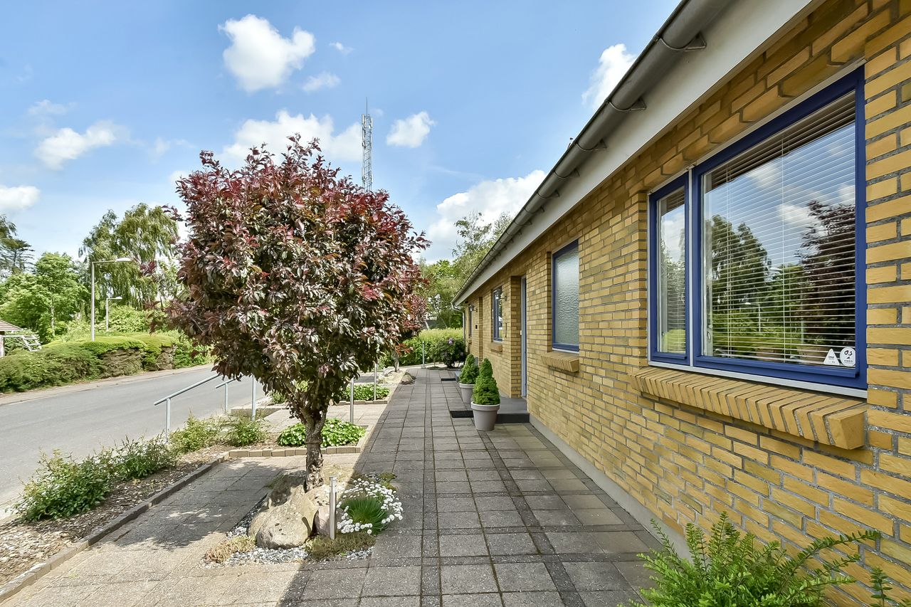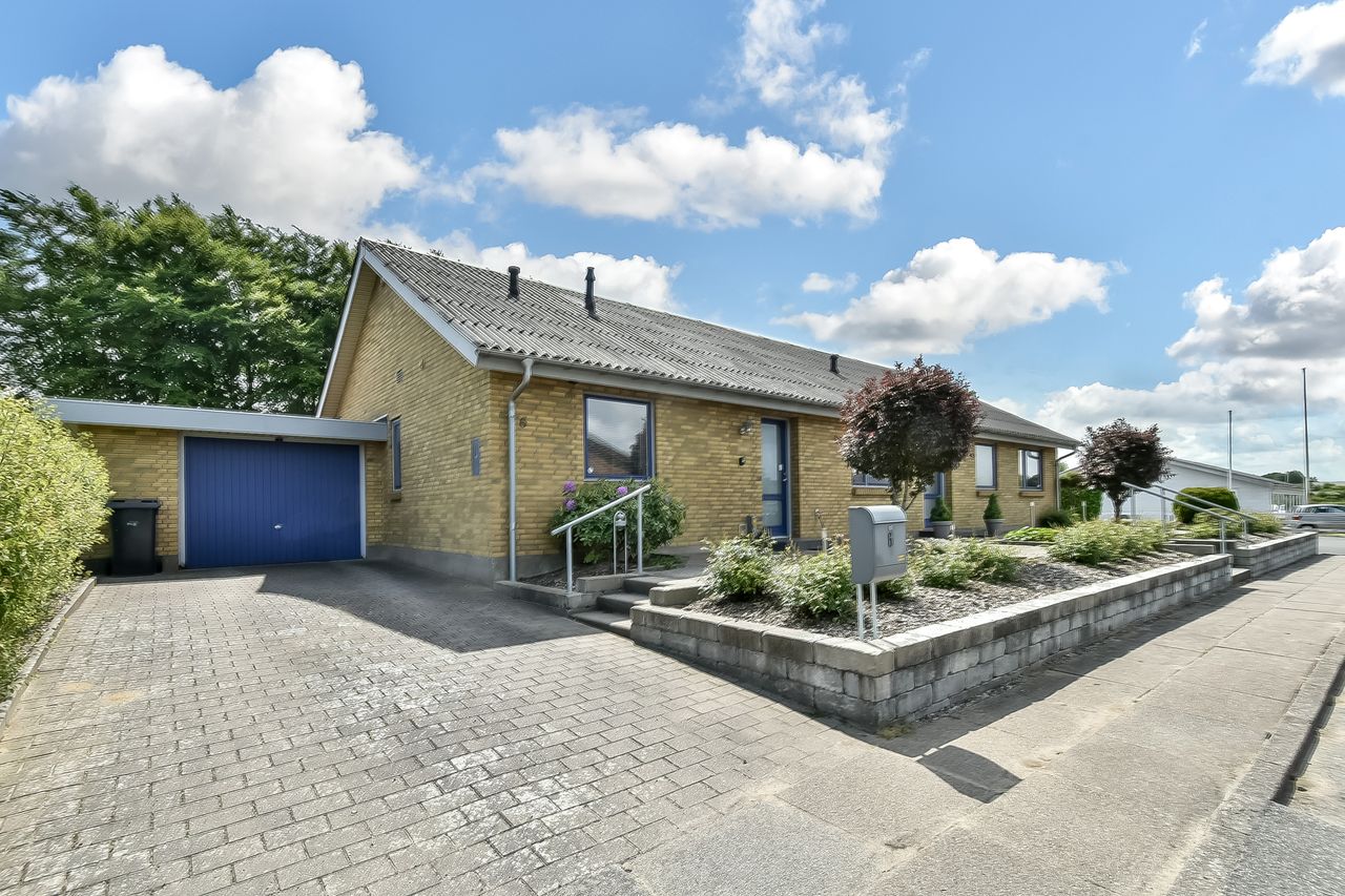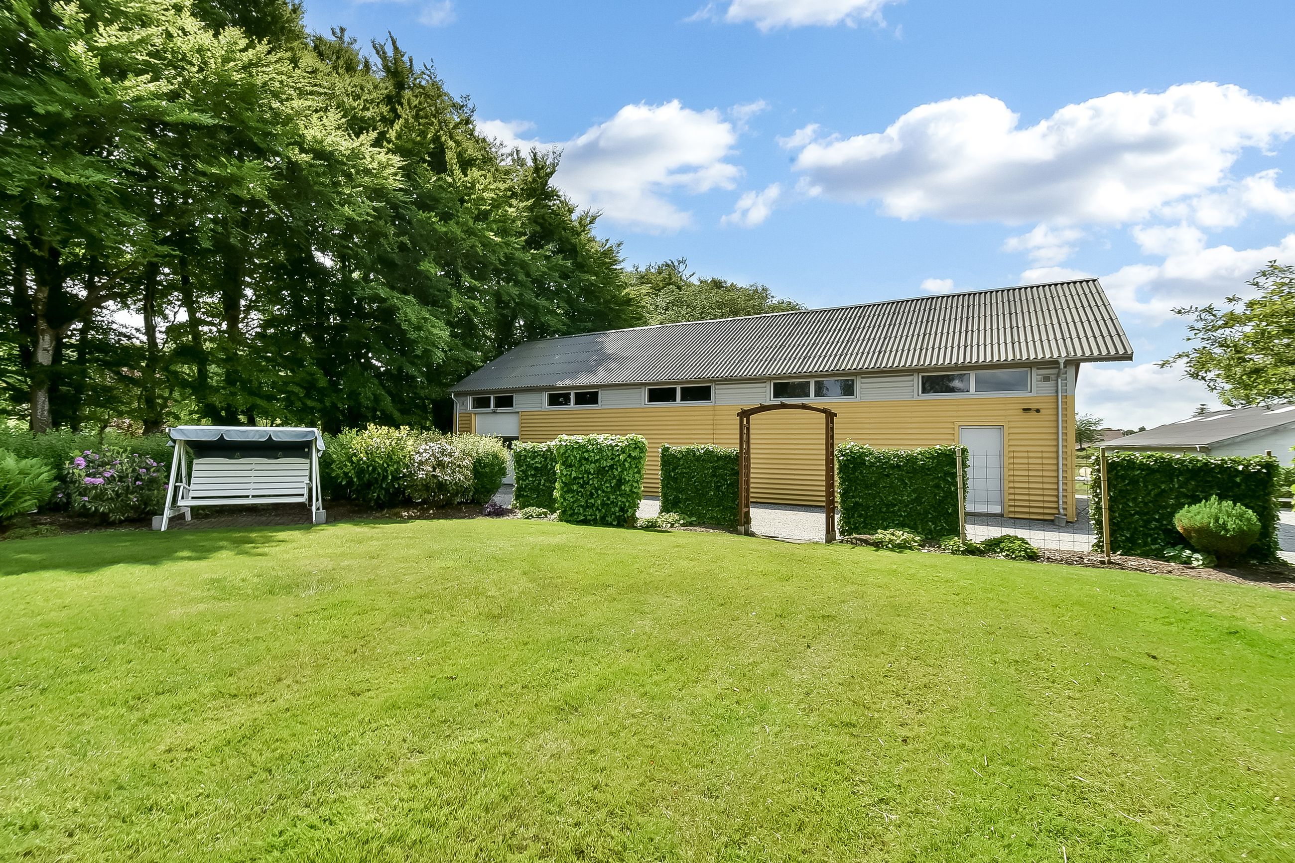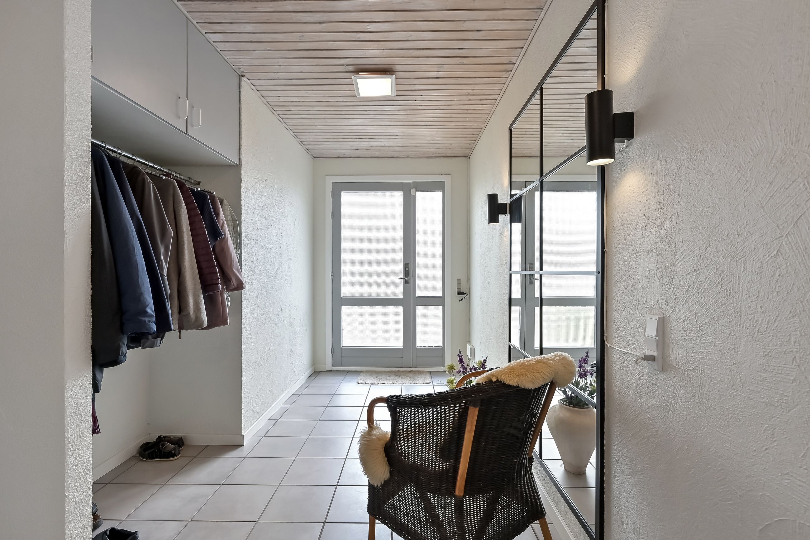 Entréen fungerer som en kombineret fordelingsgang med god bredde, der leder videre til et pænt nyere badeværelse samt soveværelset og et stort kontor. Udenfor venter flere terrasser omkring ejendommen, hvor man kan nyde de gode læforhold i den flot anlagte have. Garagen, der ligger i forlængelse af villaen, er udstyret med sedumtag - en bæredygtig løsning der også bidrager til husets æstetik.
