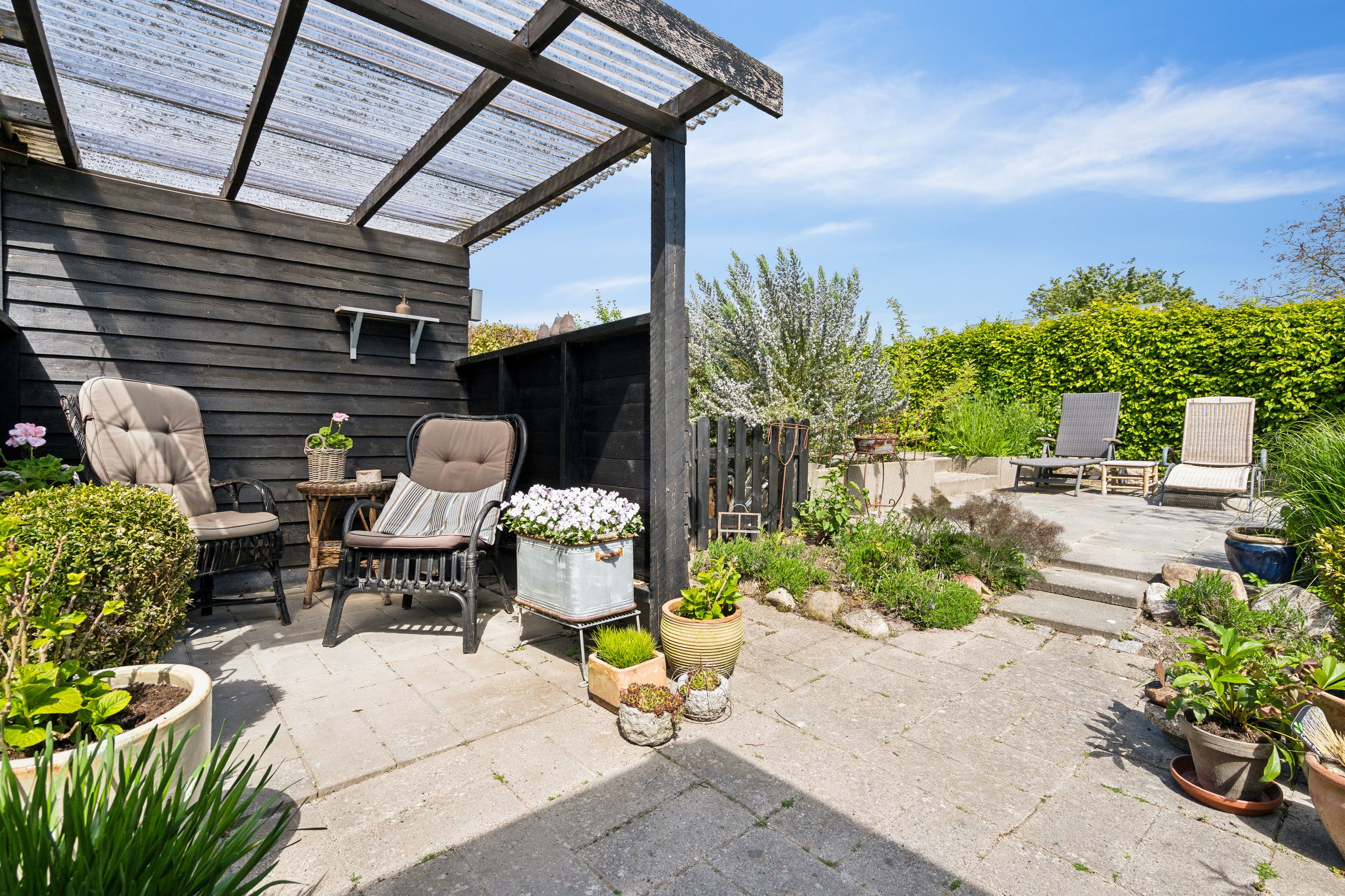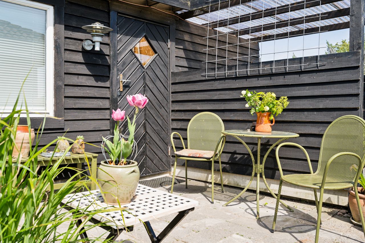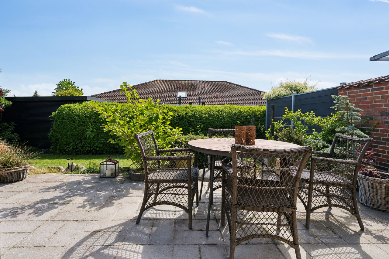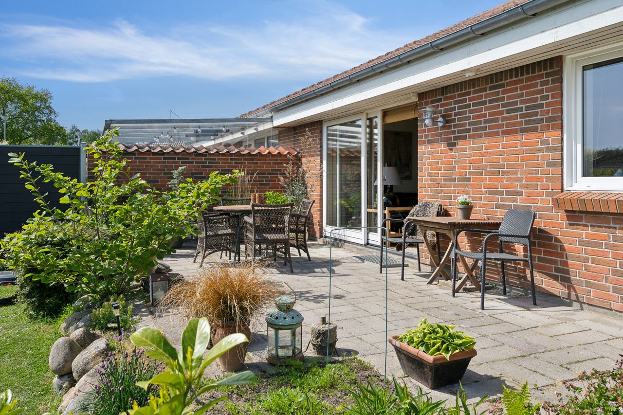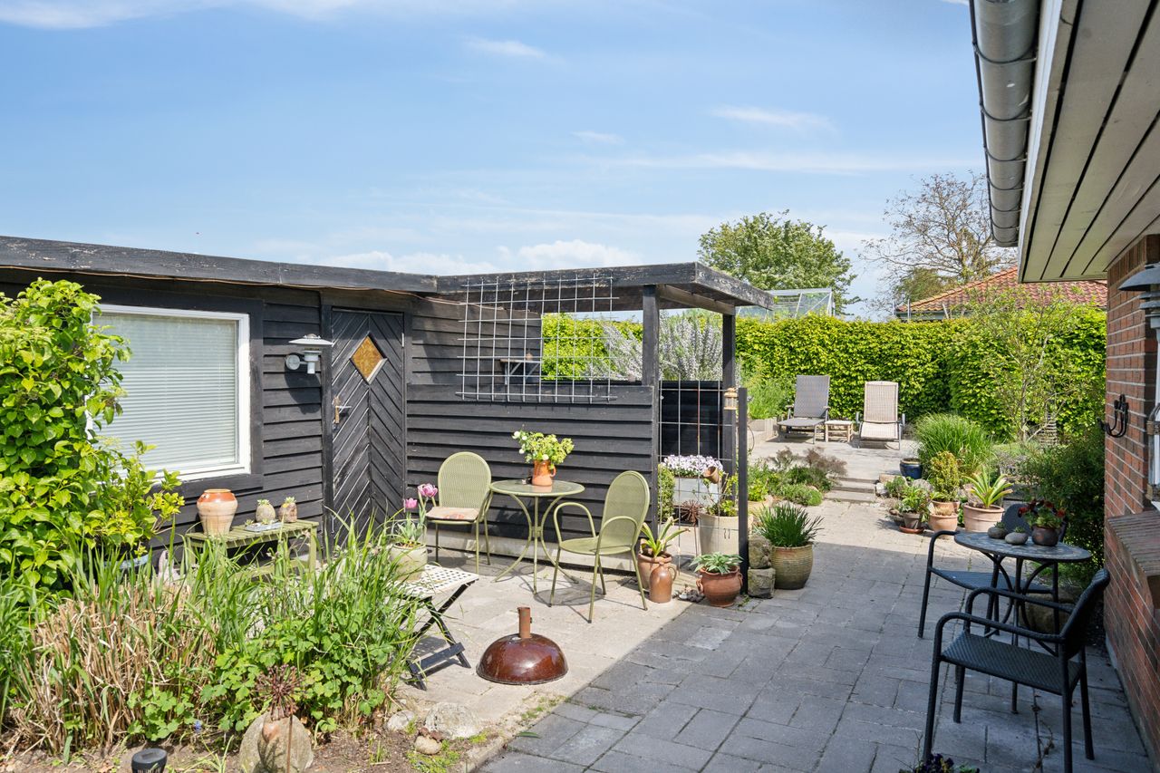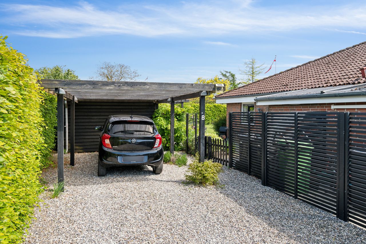 Udenfor får du en overskuelig, frodig have med plads til både afslapning og udeliv – samt en carport på 23 m2 med god plads til bilen.