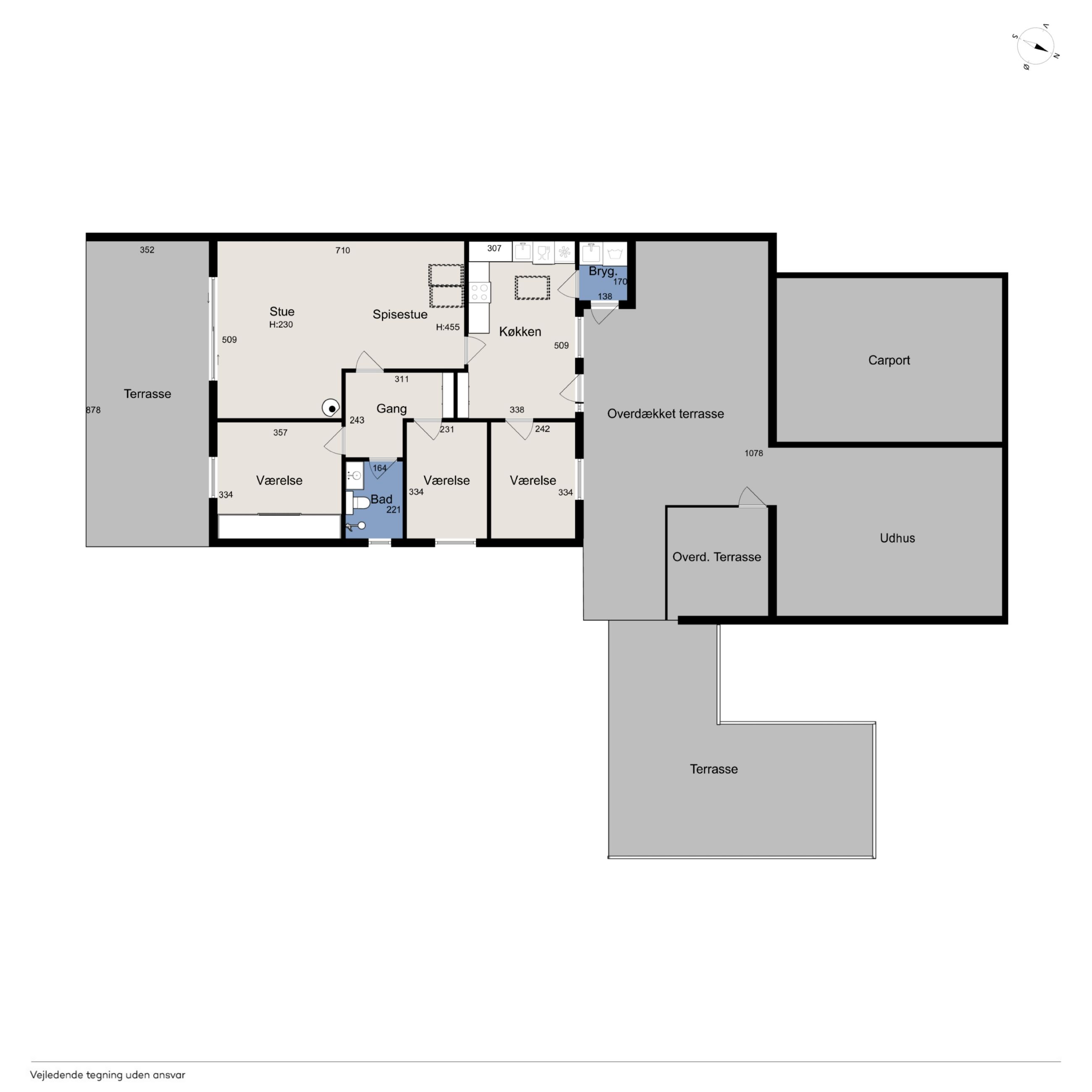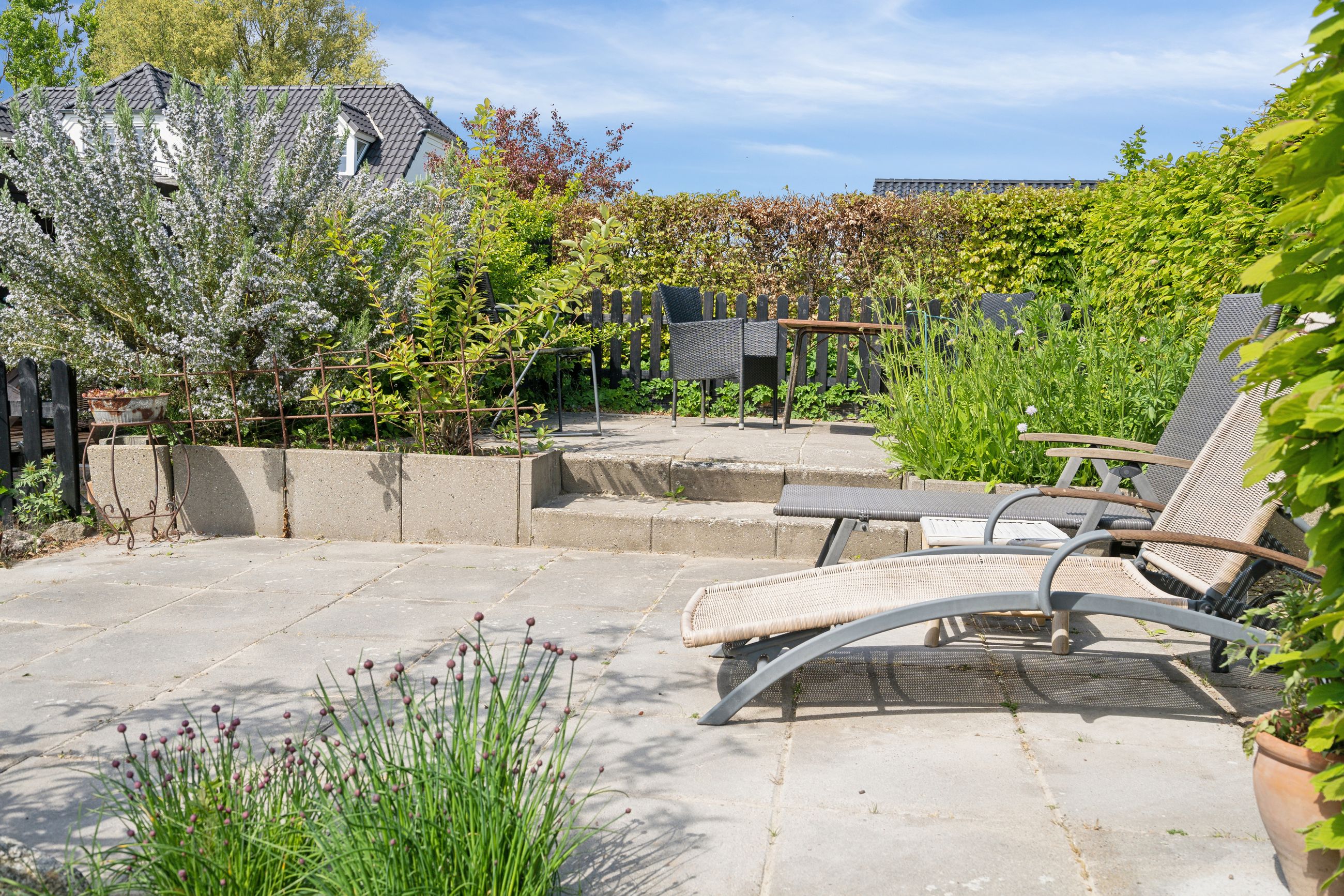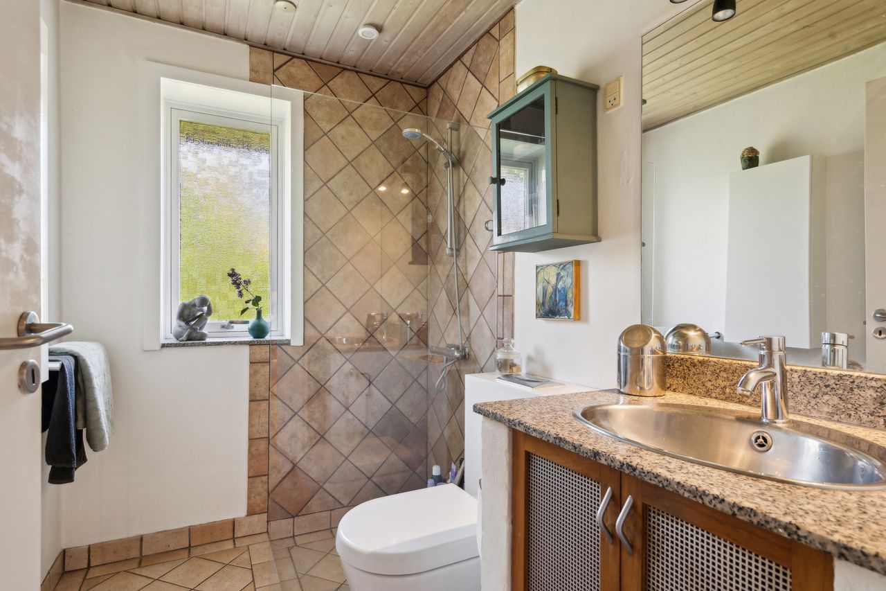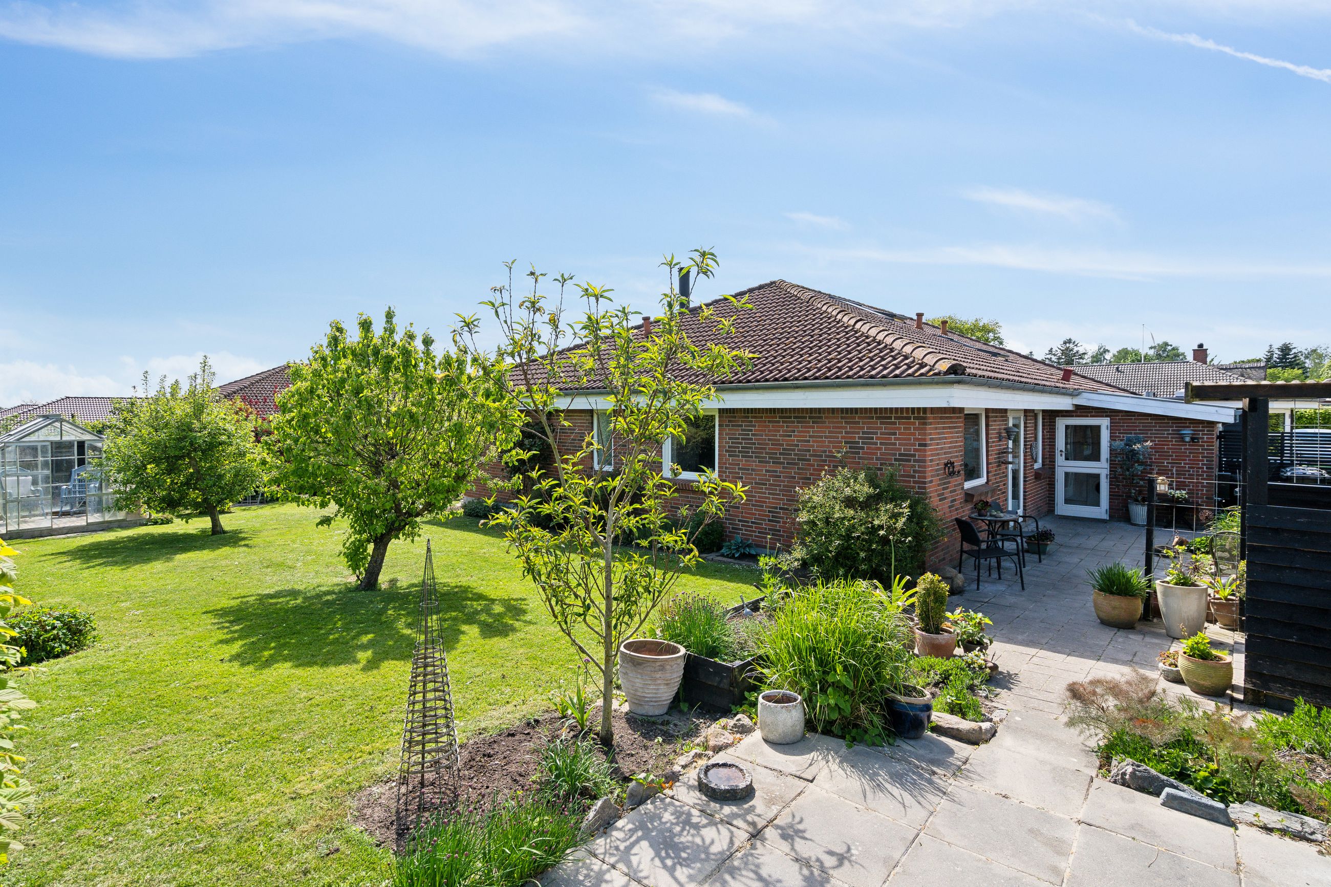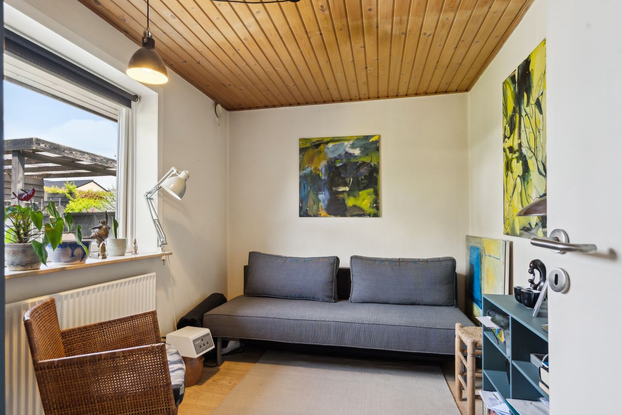 Udenfor får du en overskuelig, frodig have med plads til både afslapning og udeliv – samt en carport på 23 m2 med god plads til bilen.