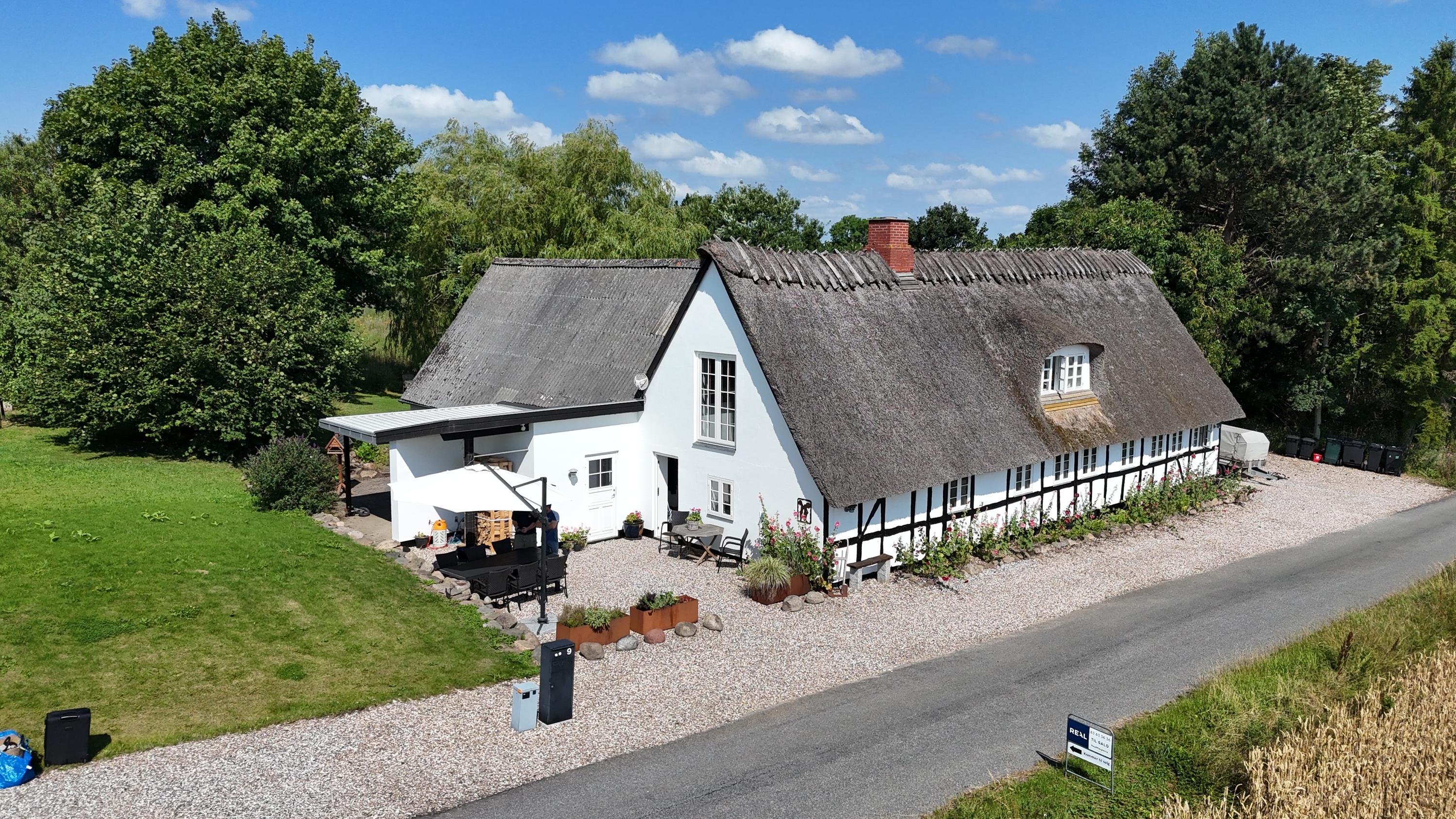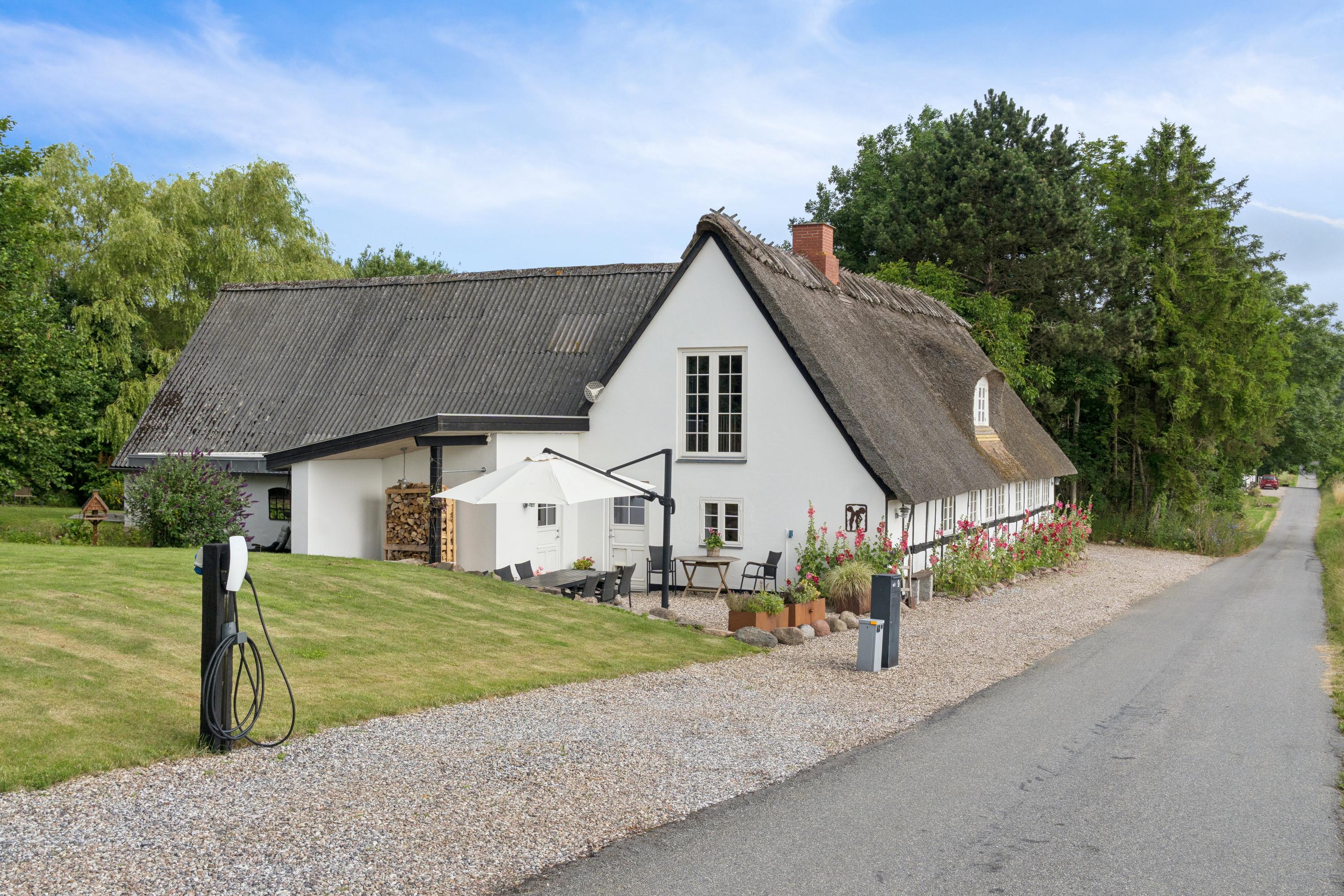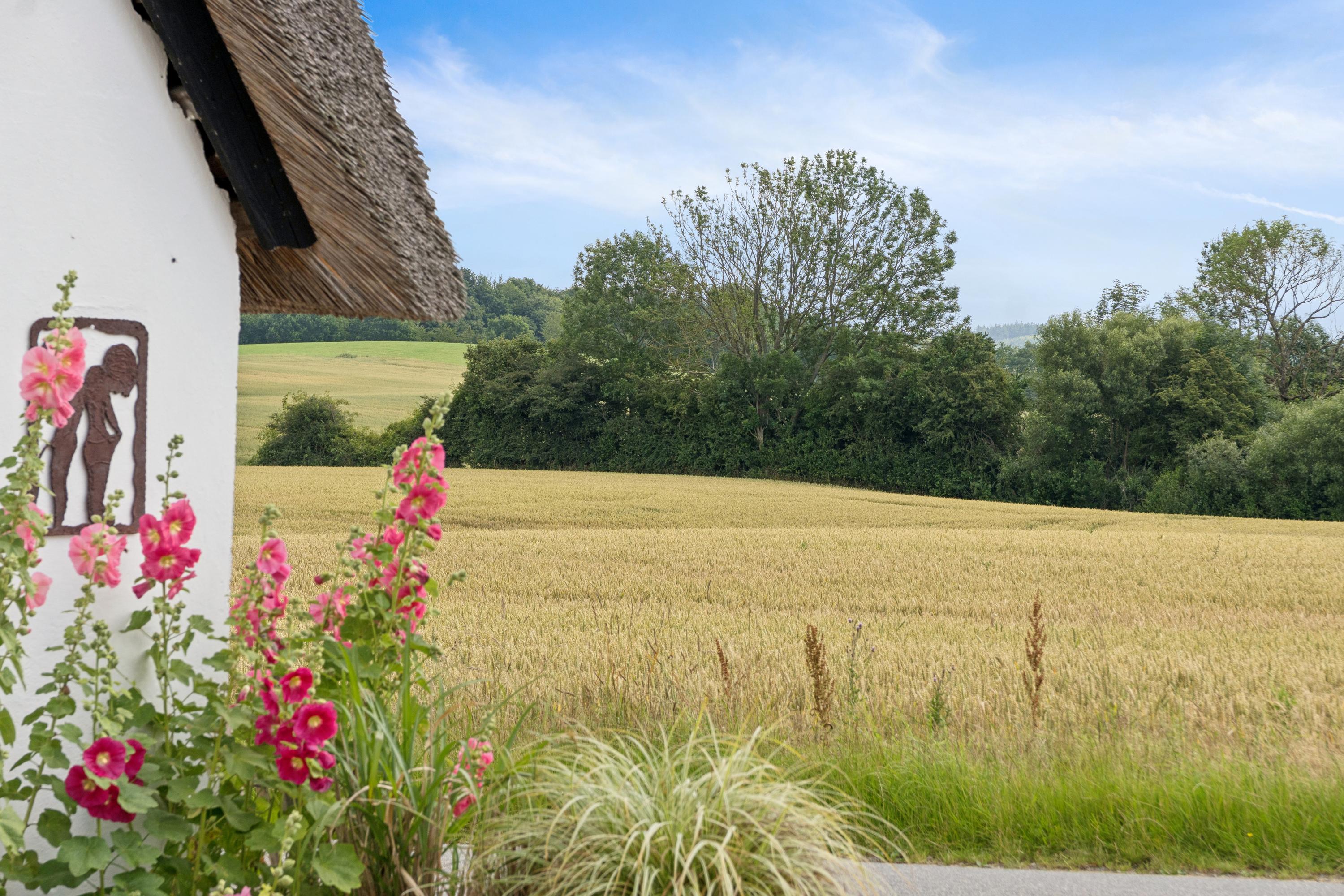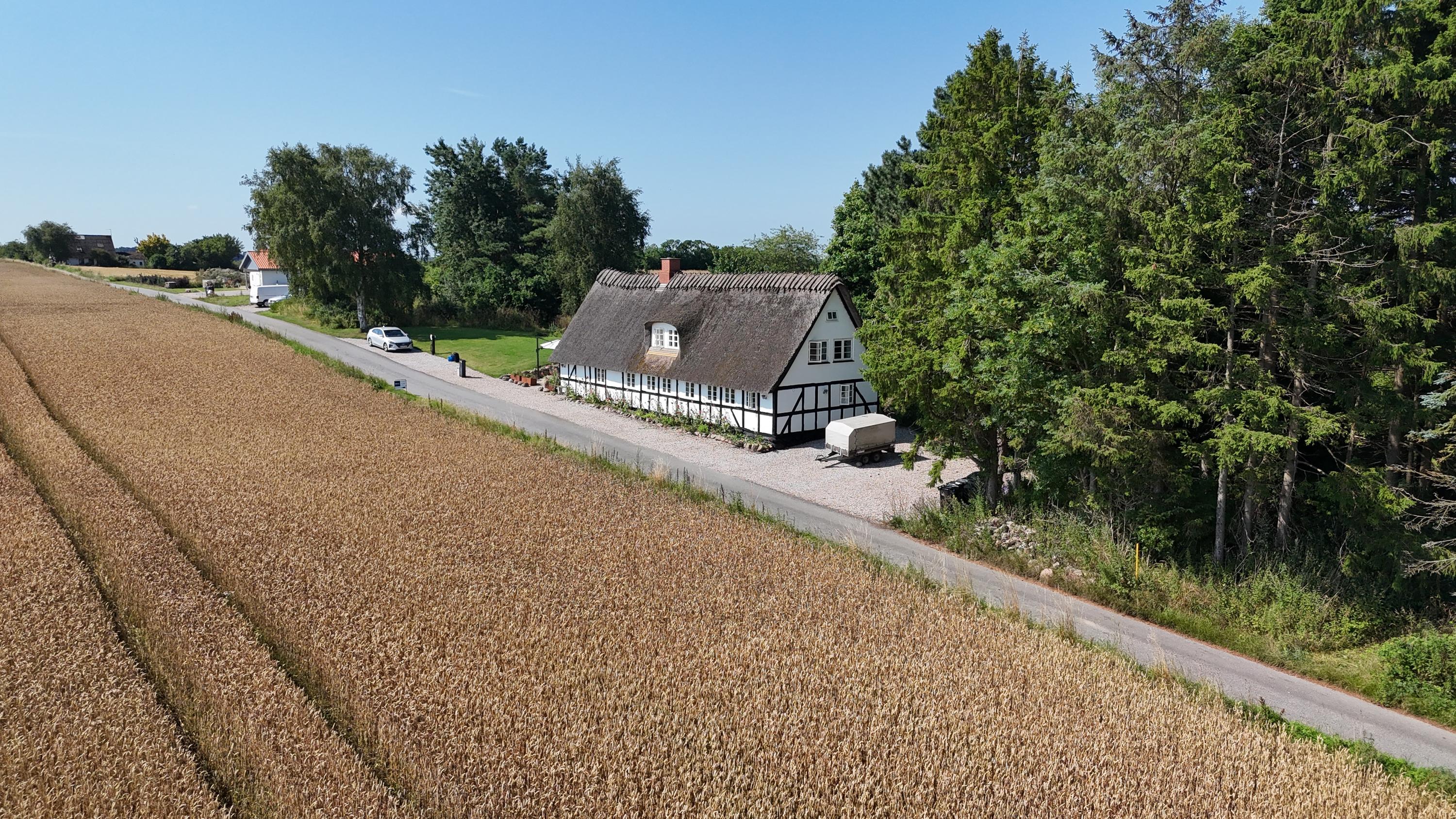 Her får I en charmerende og nænsomt renoveret bindingsværksejendom midt i det åbne landskab med frit udsyn til grønne marker, en levende mose, og skoven i horisonten. Beliggenheden på en fredelig, lukket vej skaber en særlig ro, hvor naturens lyde tager over.