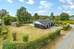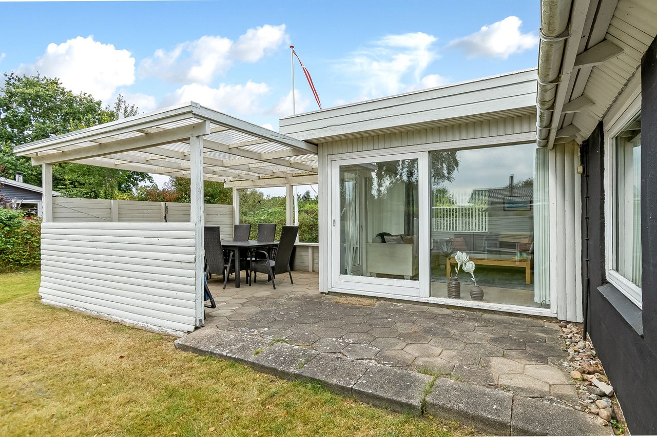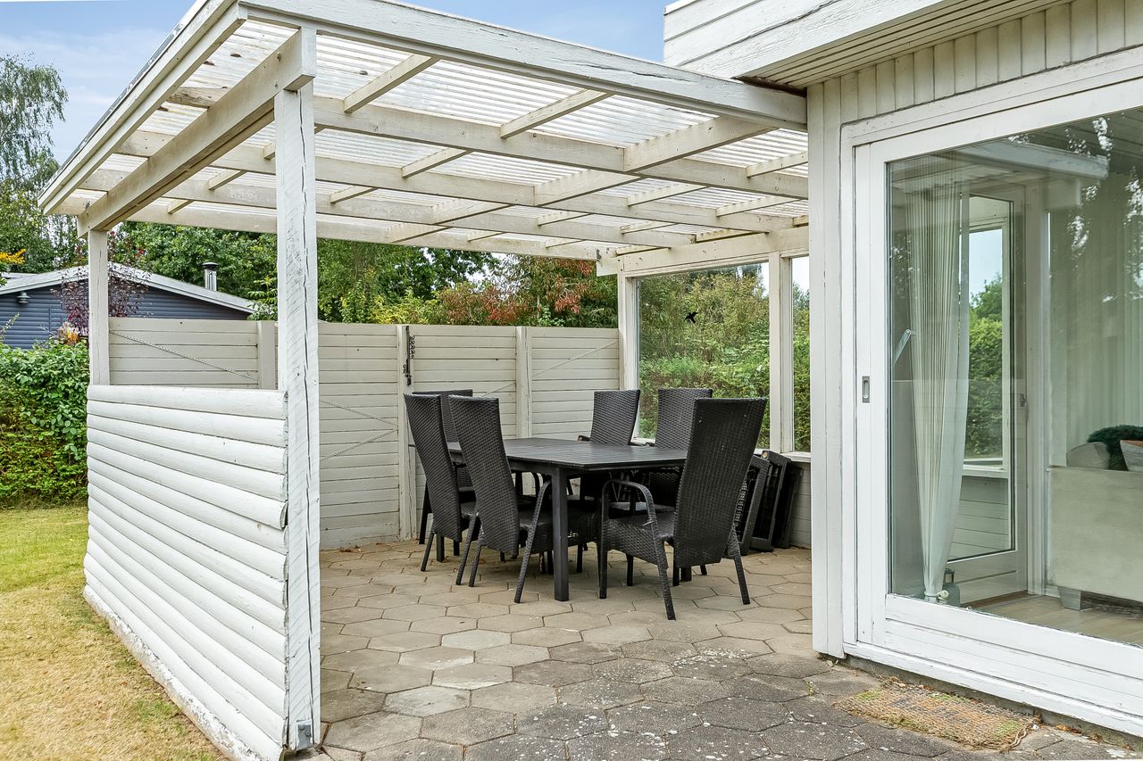Udvendigt er grunden nydeligt anlagt med plæne omkranset af hæk. Flere gode terrassemiljøer - inkl. en overdækning - sikrer gode forhold til at nyde både sol & læ.