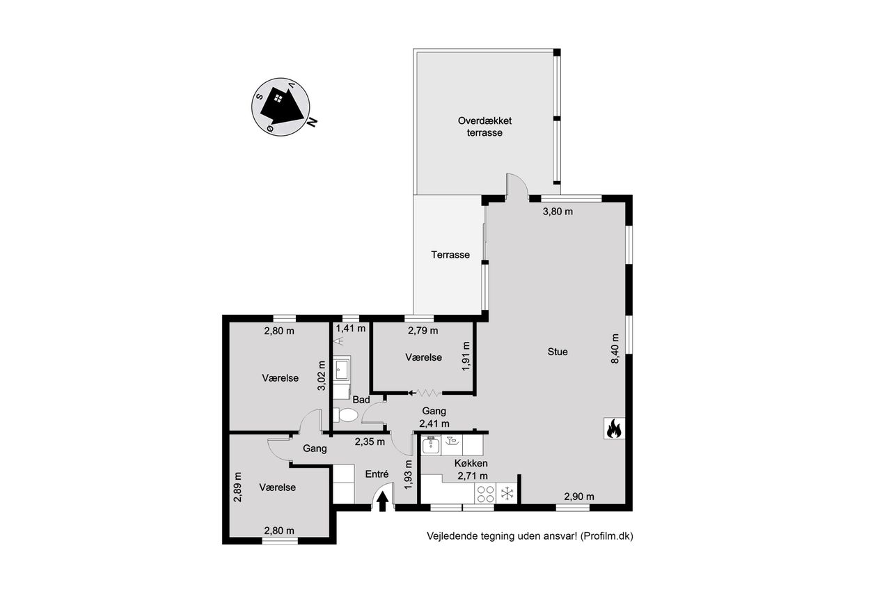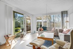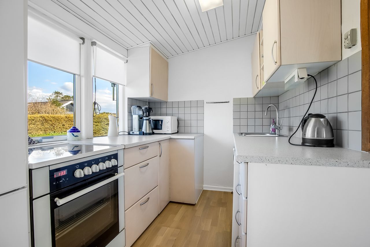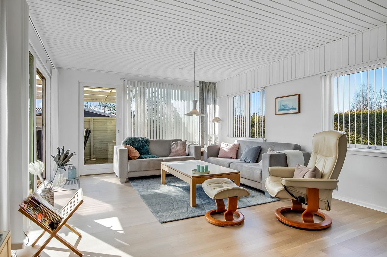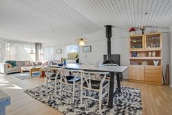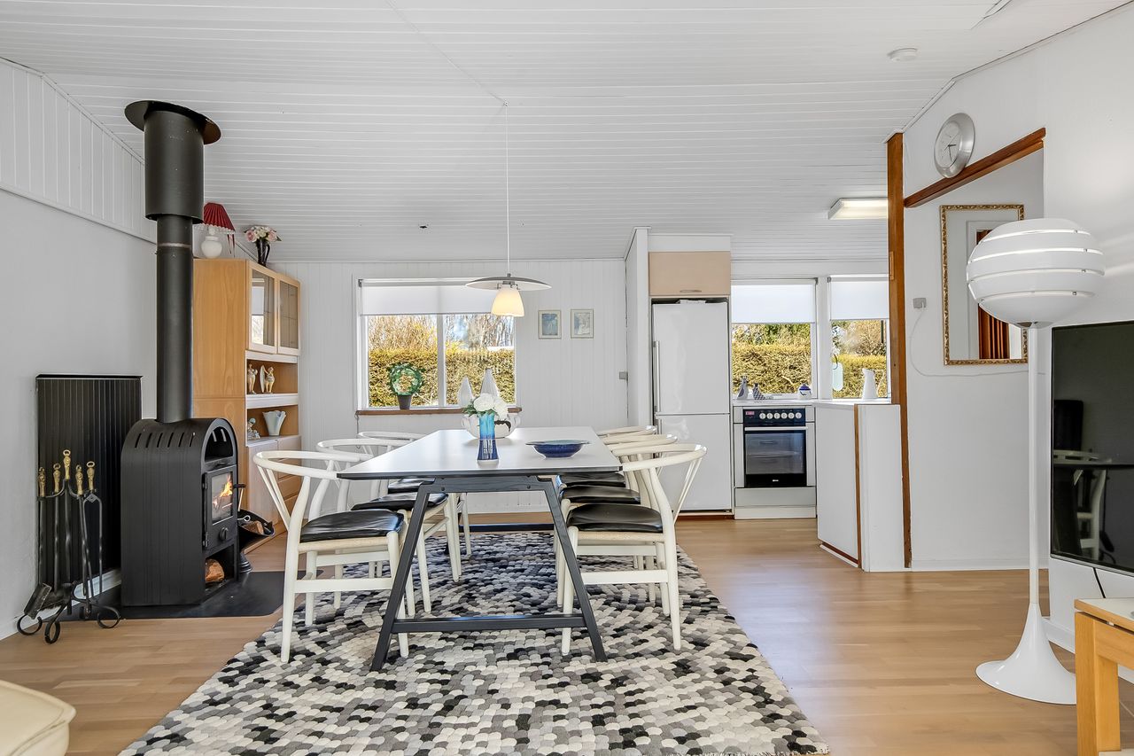 Køkken i åbent miljø med både alrum & stue. Det er her magien for alvor indfinder sig i sommerhuset. Skønt lysindfald samt en behagelig & hyggelig atmosfære. Brændeovn & udgang via skydedør til terrasse.
