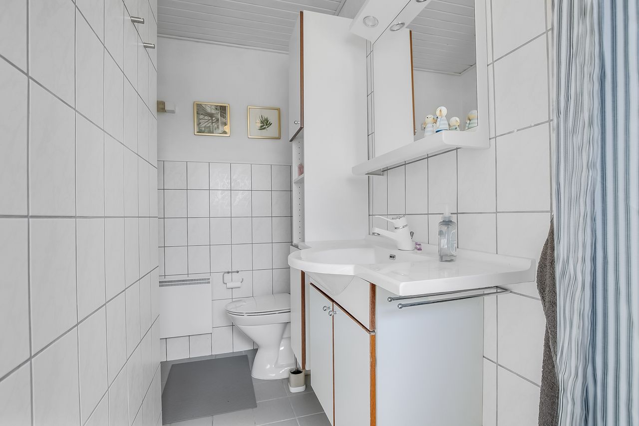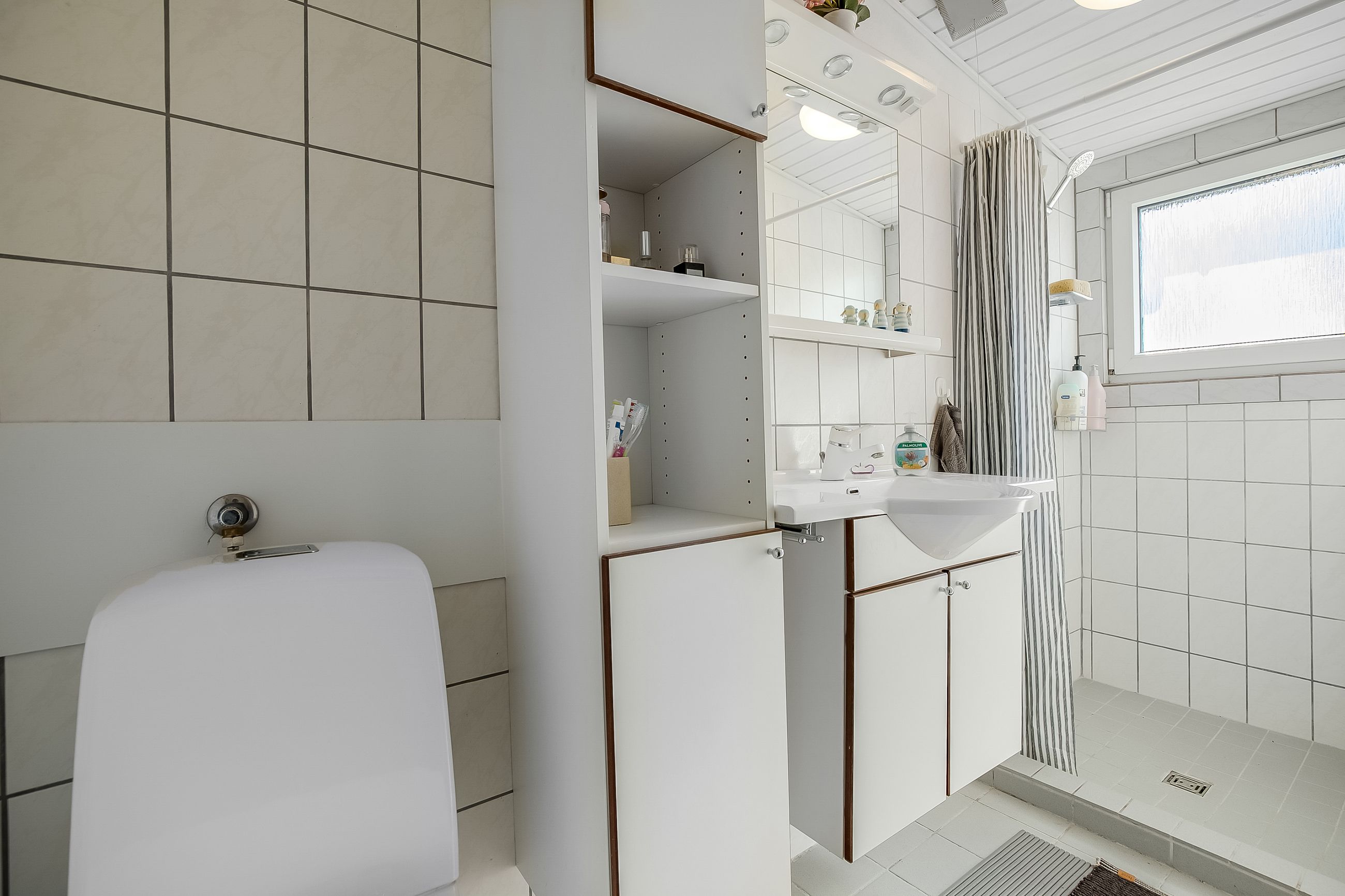 Endvidere fordelingsgang med adgang til yderligere et værelse samt badeværelse med bruseniche & vask i arrangement.