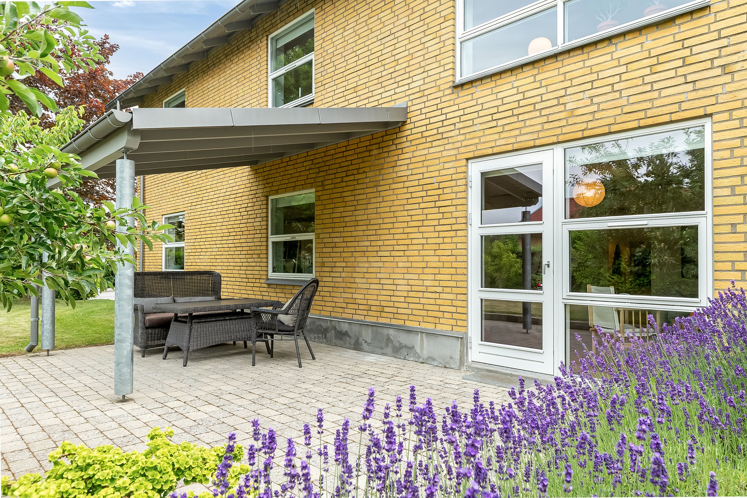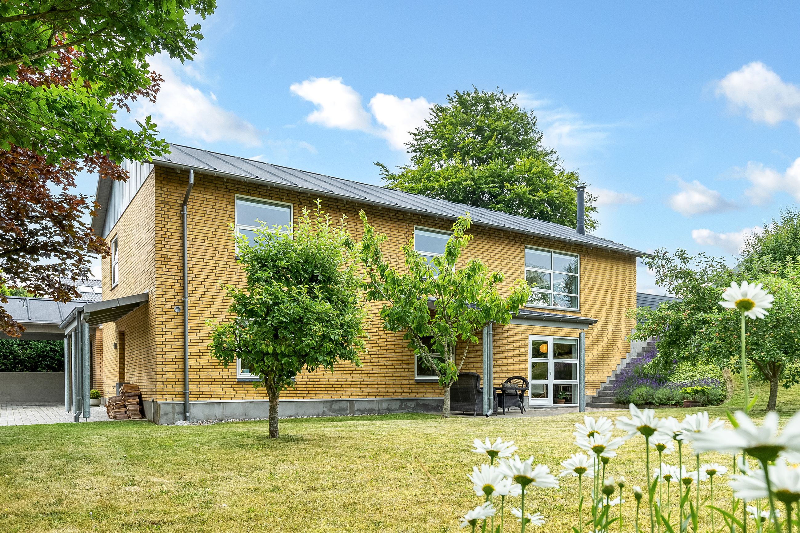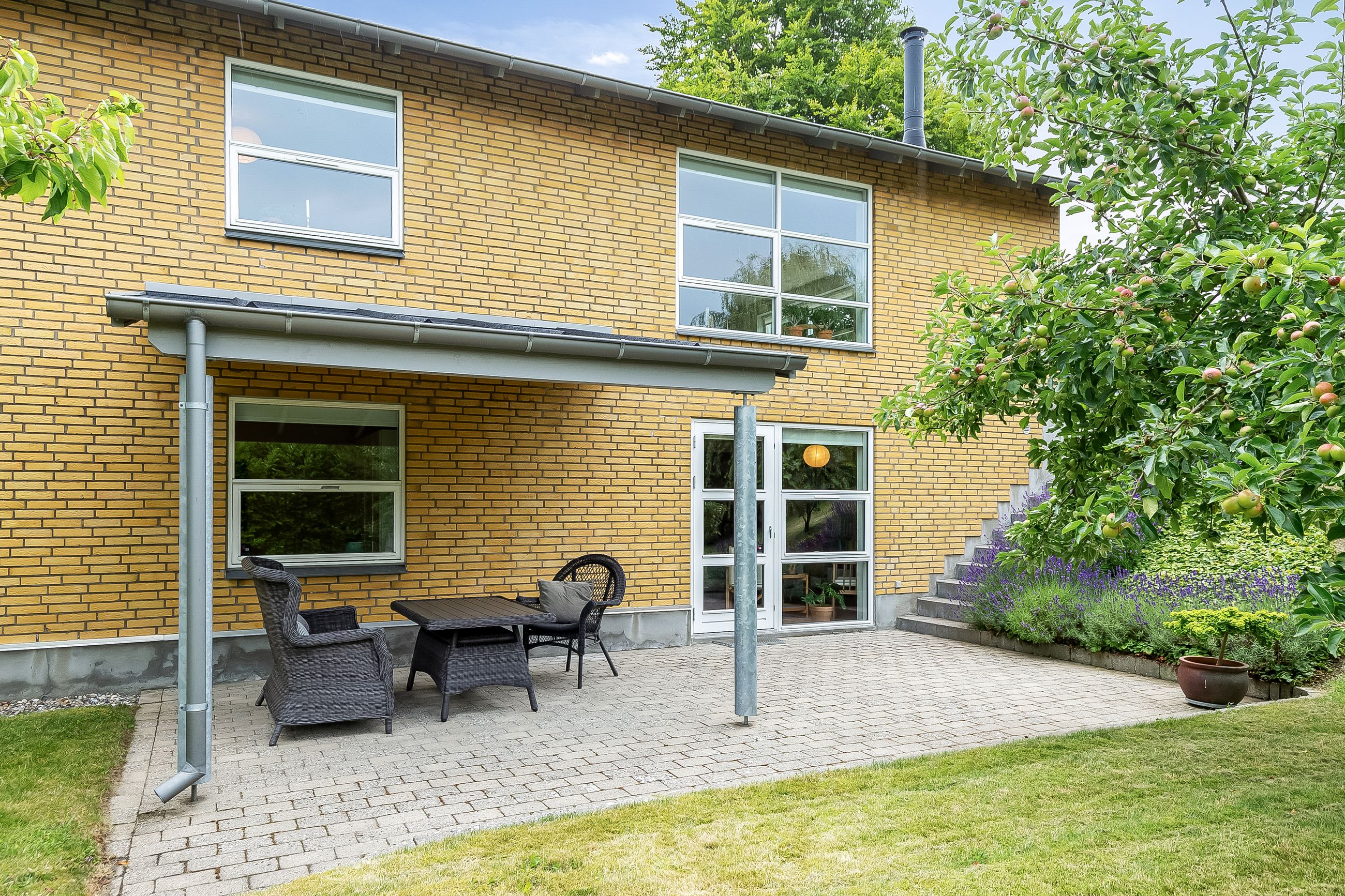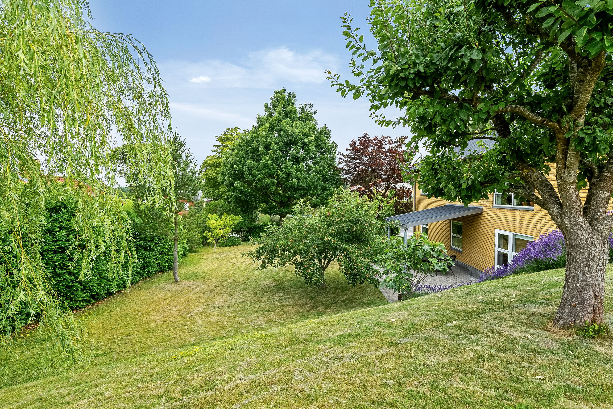 Da husets fodaftryk alene udgør 117m2, vil du opleve at grundens samlede areal på 953m2 virkelig kommer til sin ret. Her er flotte træer og bede og så skaber niveau forskydningerne en helt særlig stemning.