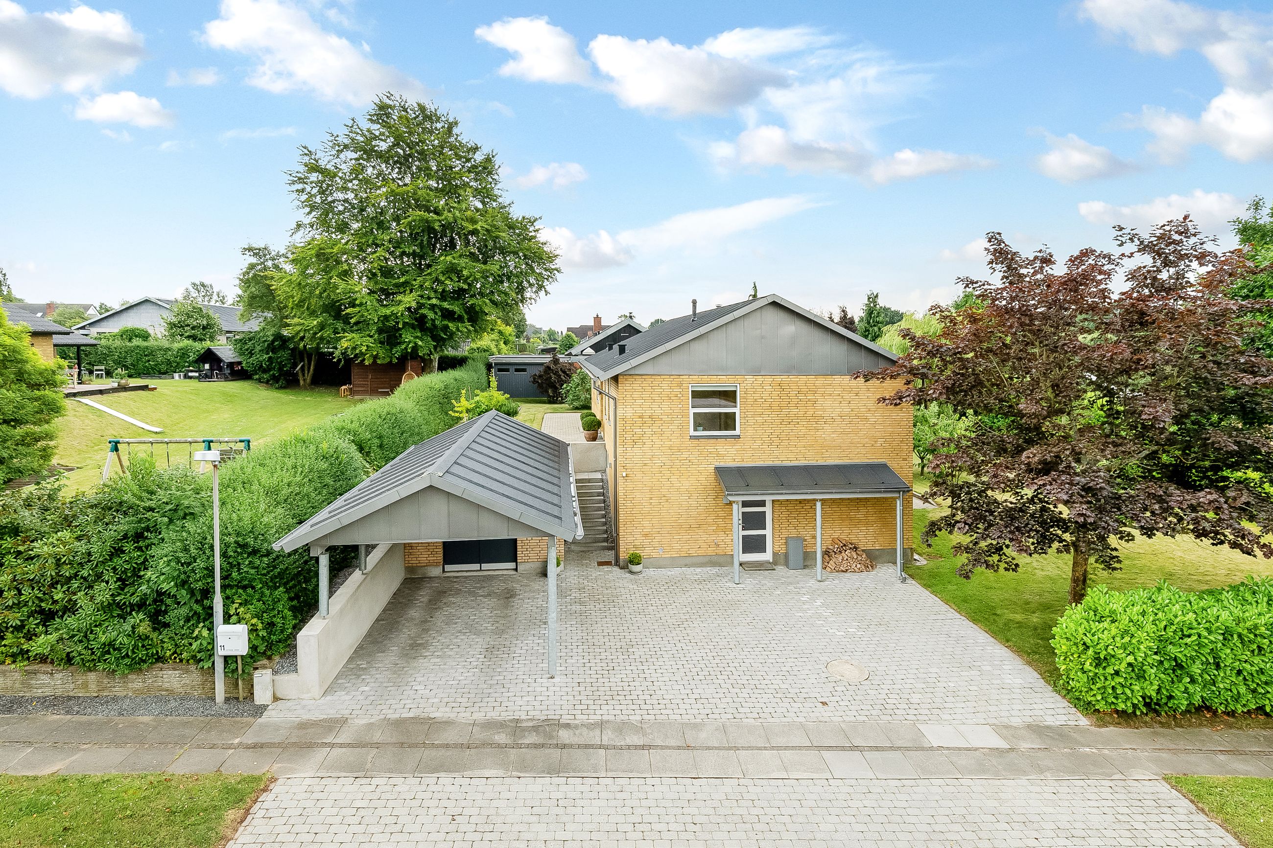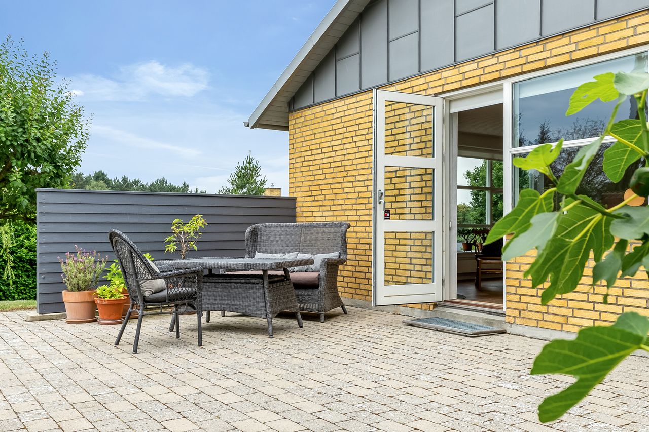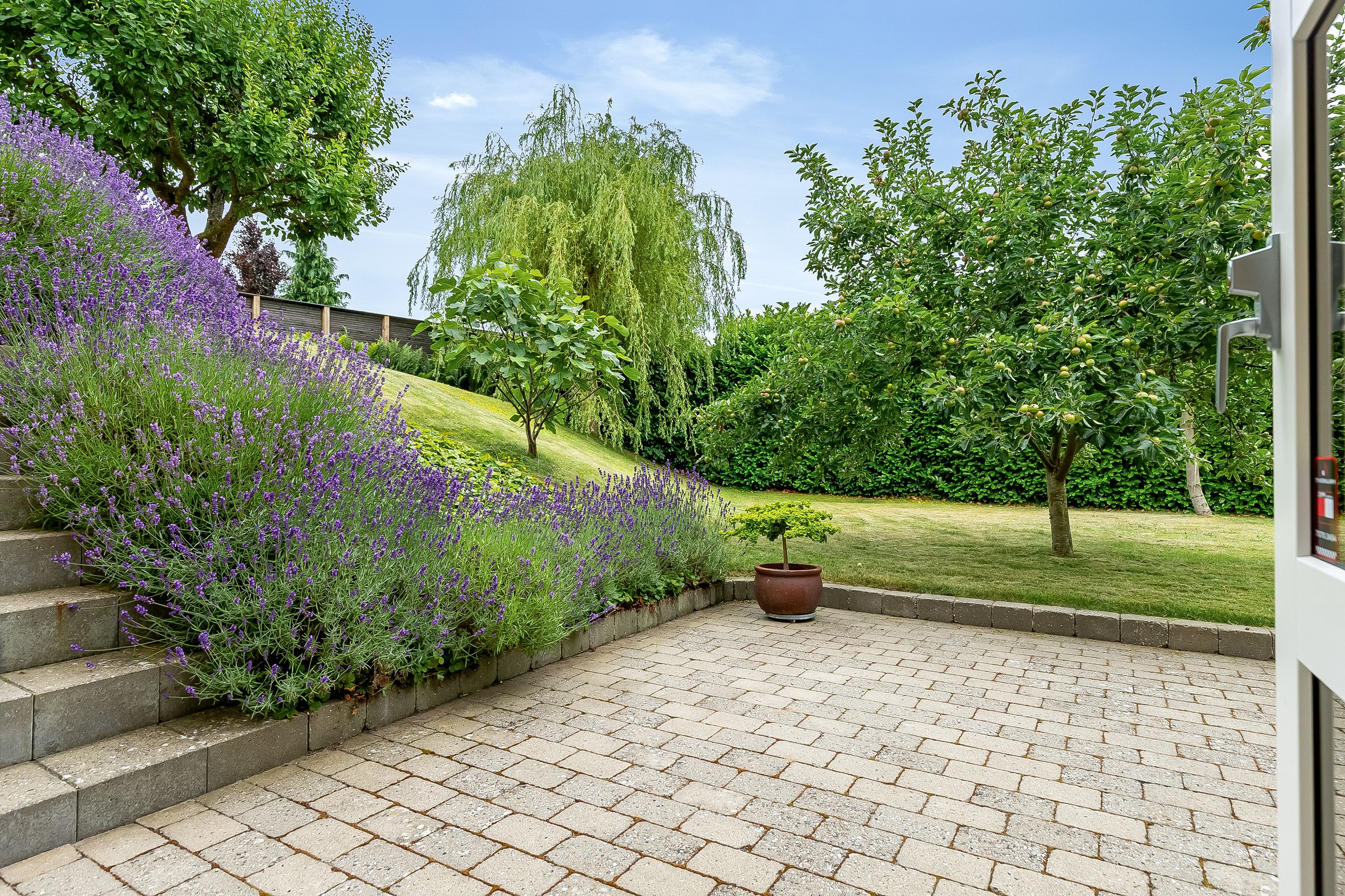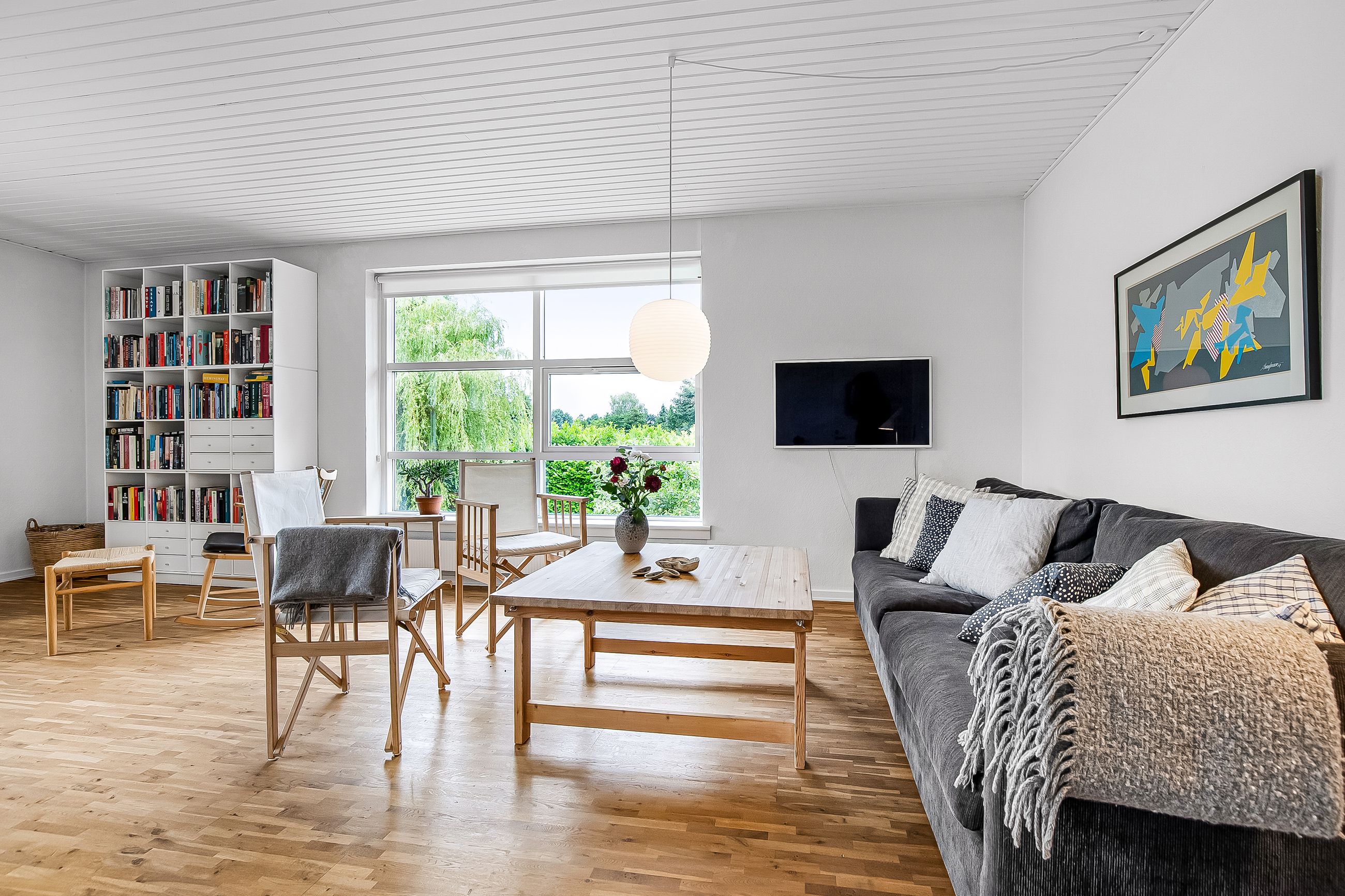Da husets fodaftryk alene udgør 117m2, vil du opleve at grundens samlede areal på 953m2 virkelig kommer til sin ret. Her er flotte træer og bede og så skaber niveau forskydningerne en helt særlig stemning.